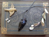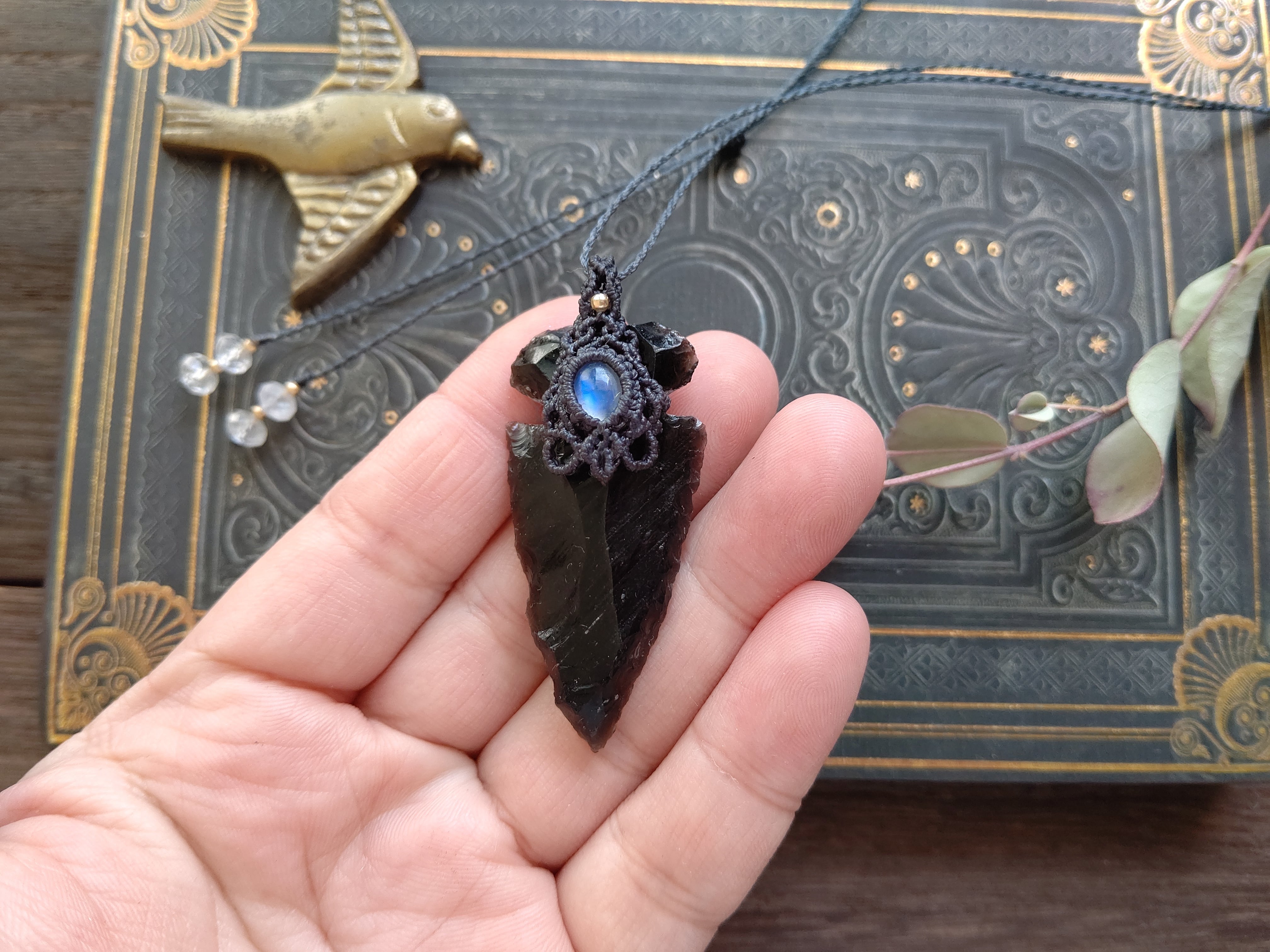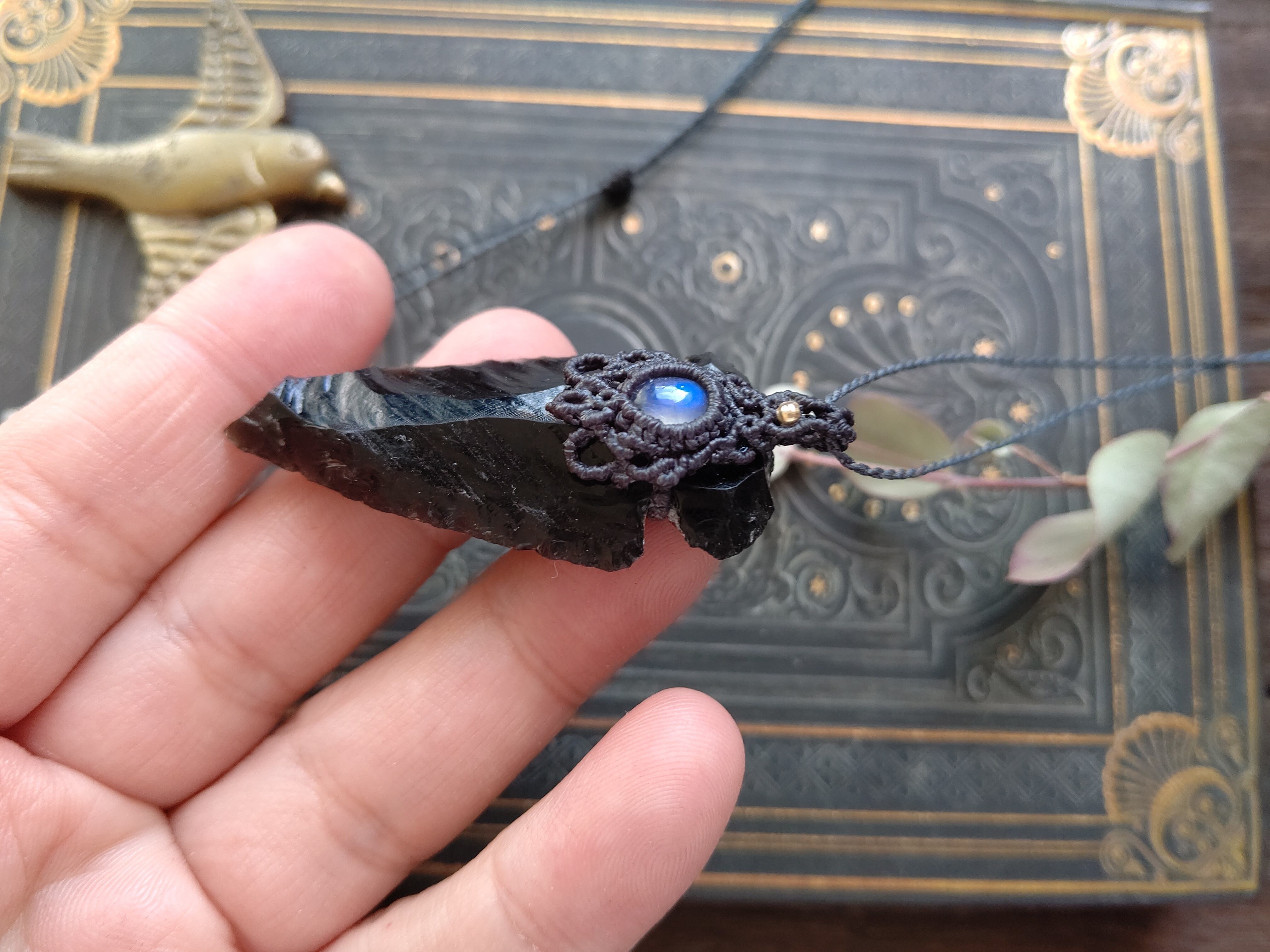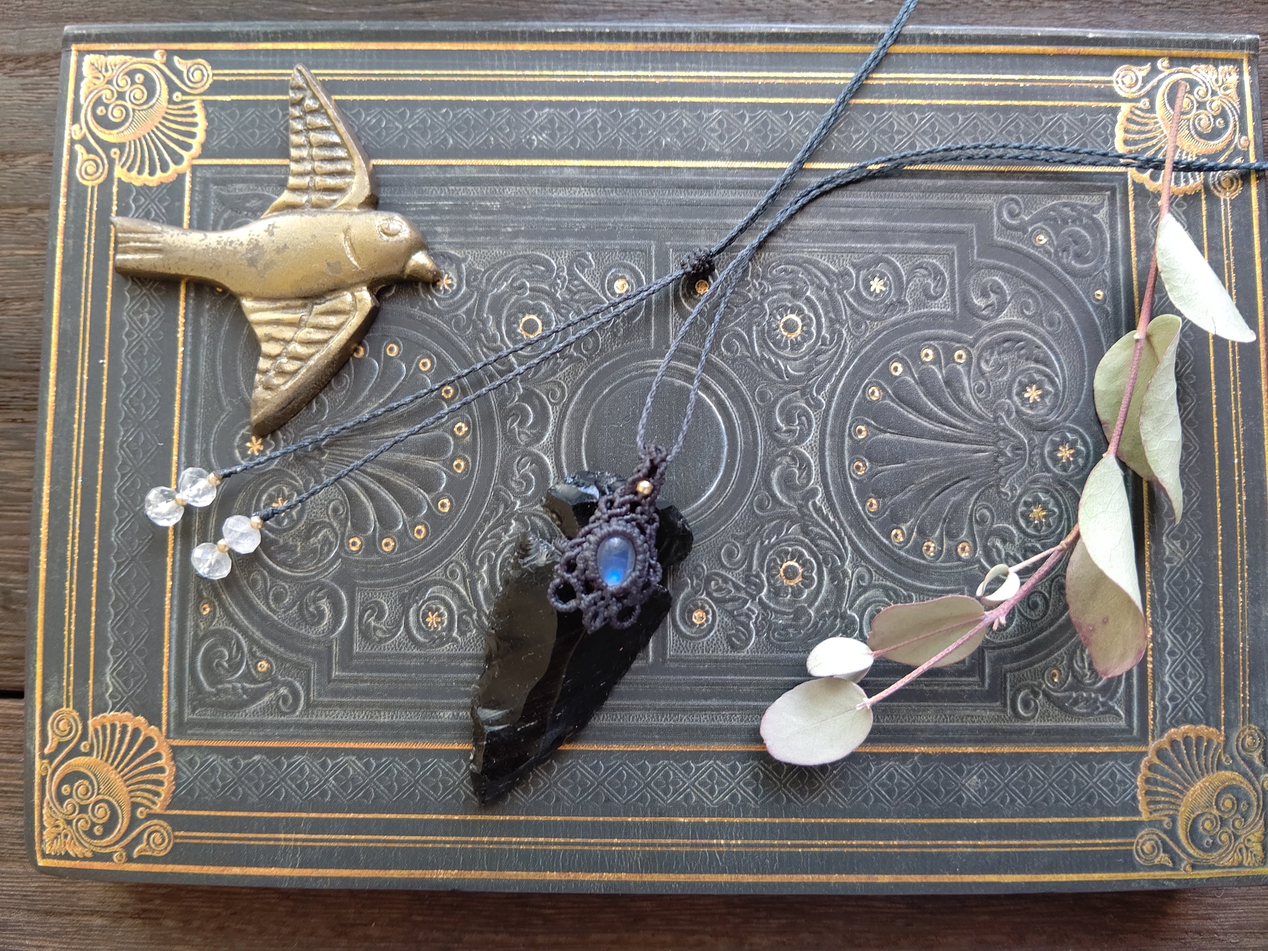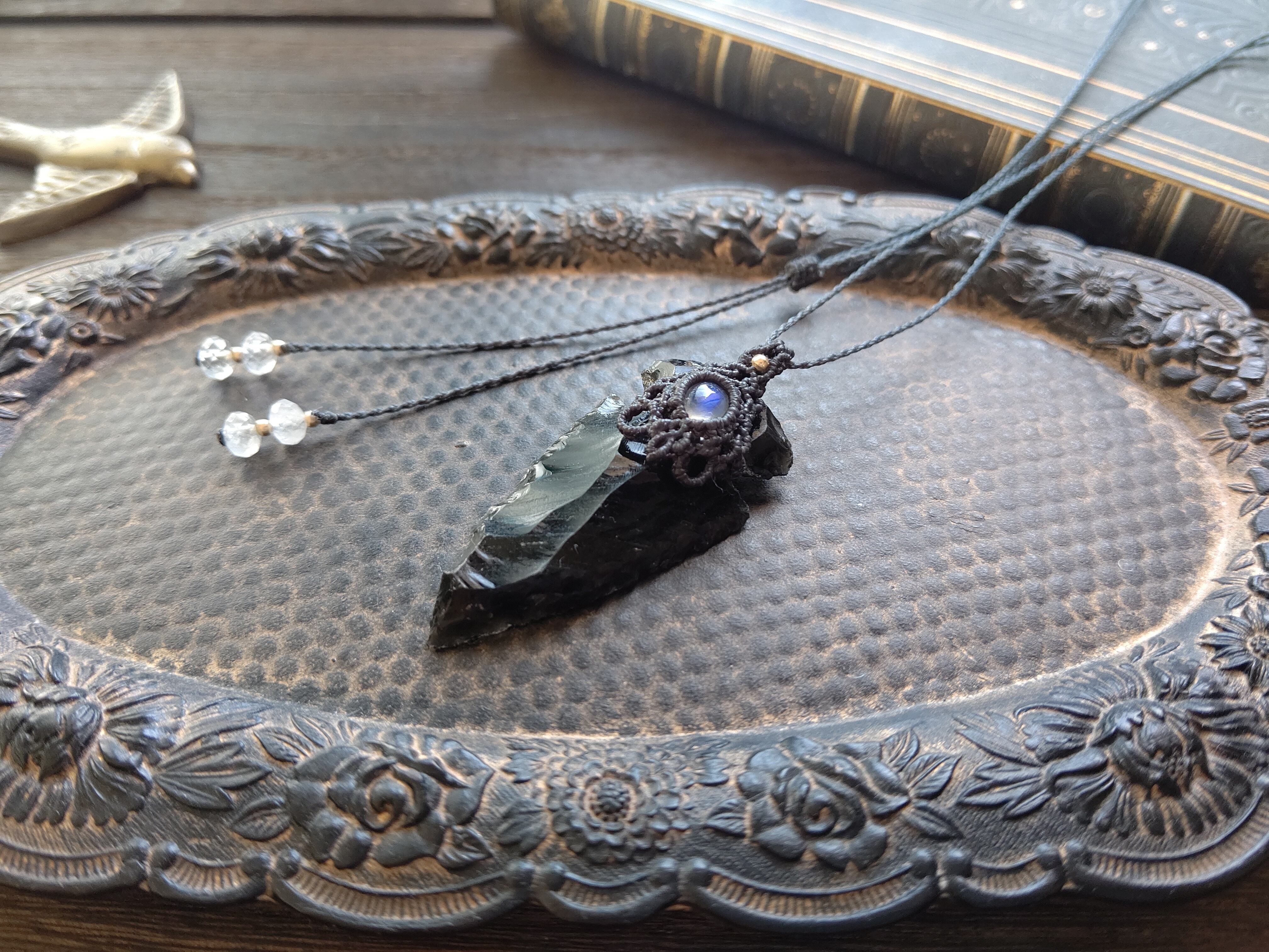 メキシコ産黒曜石(オブシディアン)とホワイトラブラドライトの原石ペンダント