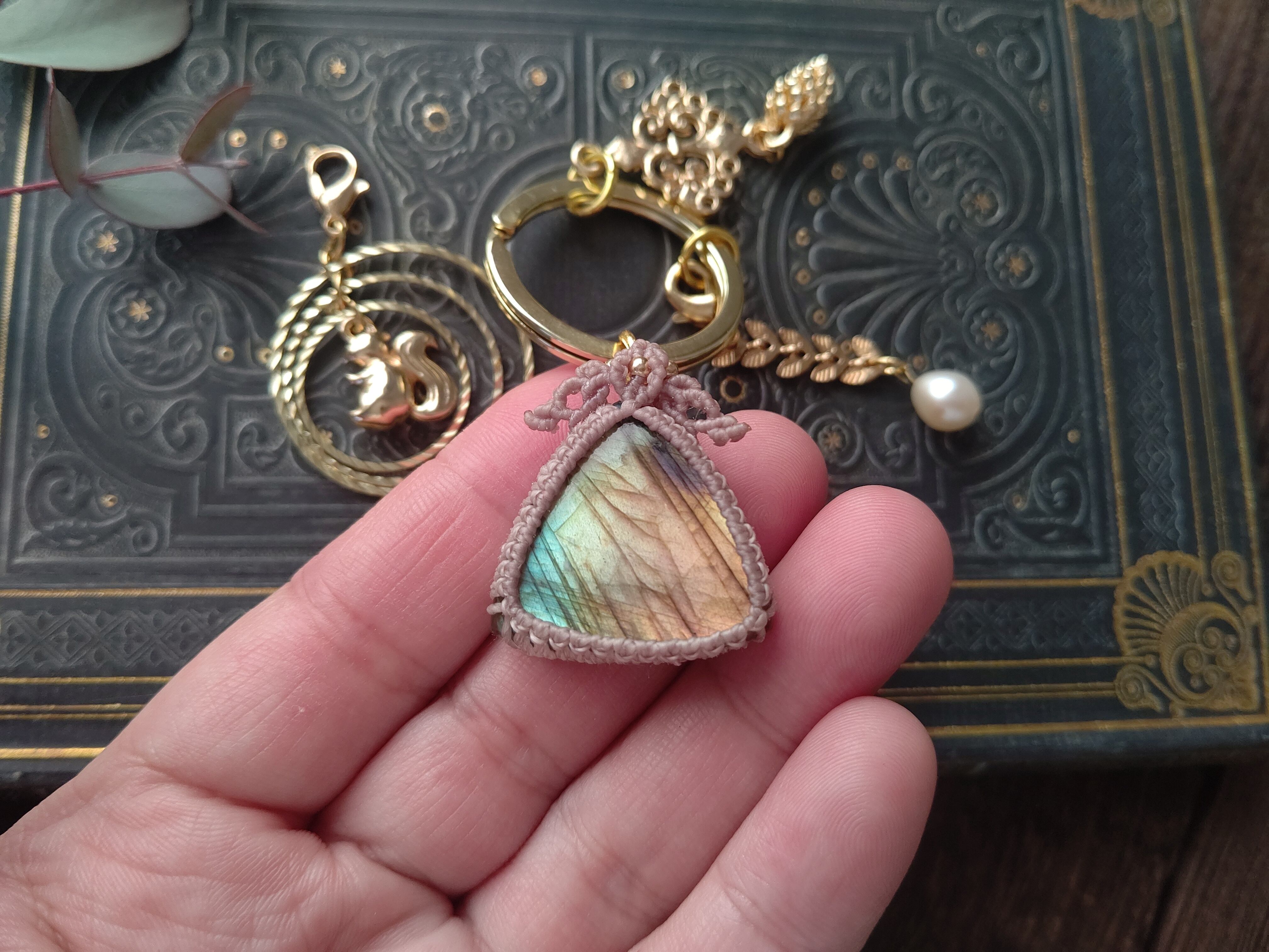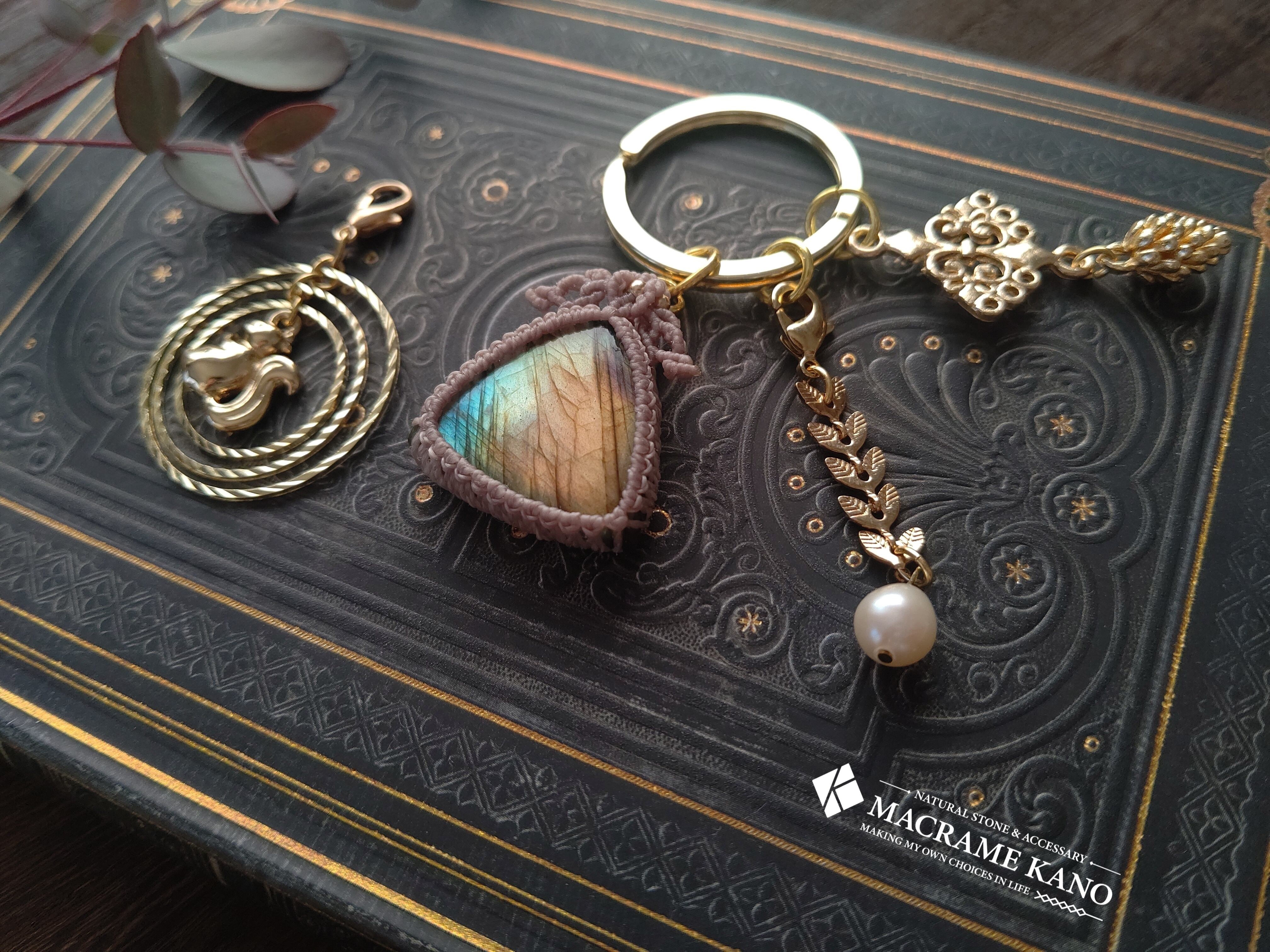 大粒で美しい輝きのマルチカラーラブラドライトをシンプルに編み込んだモチーフタイプのキーリング(チャーム)です。
