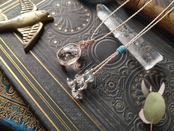 結び石は3月の誕生石でもあるアクアマリンにハーキマーダイヤモンドを合わせました。アジャスターを今回はスカイブルー0の糸で円筒形に編み込んでおります。横編みの糸に縦軸のペンダント紐が程よい摩擦になっていて、滑りよくしっかりと止まります。