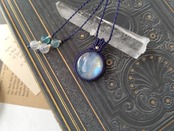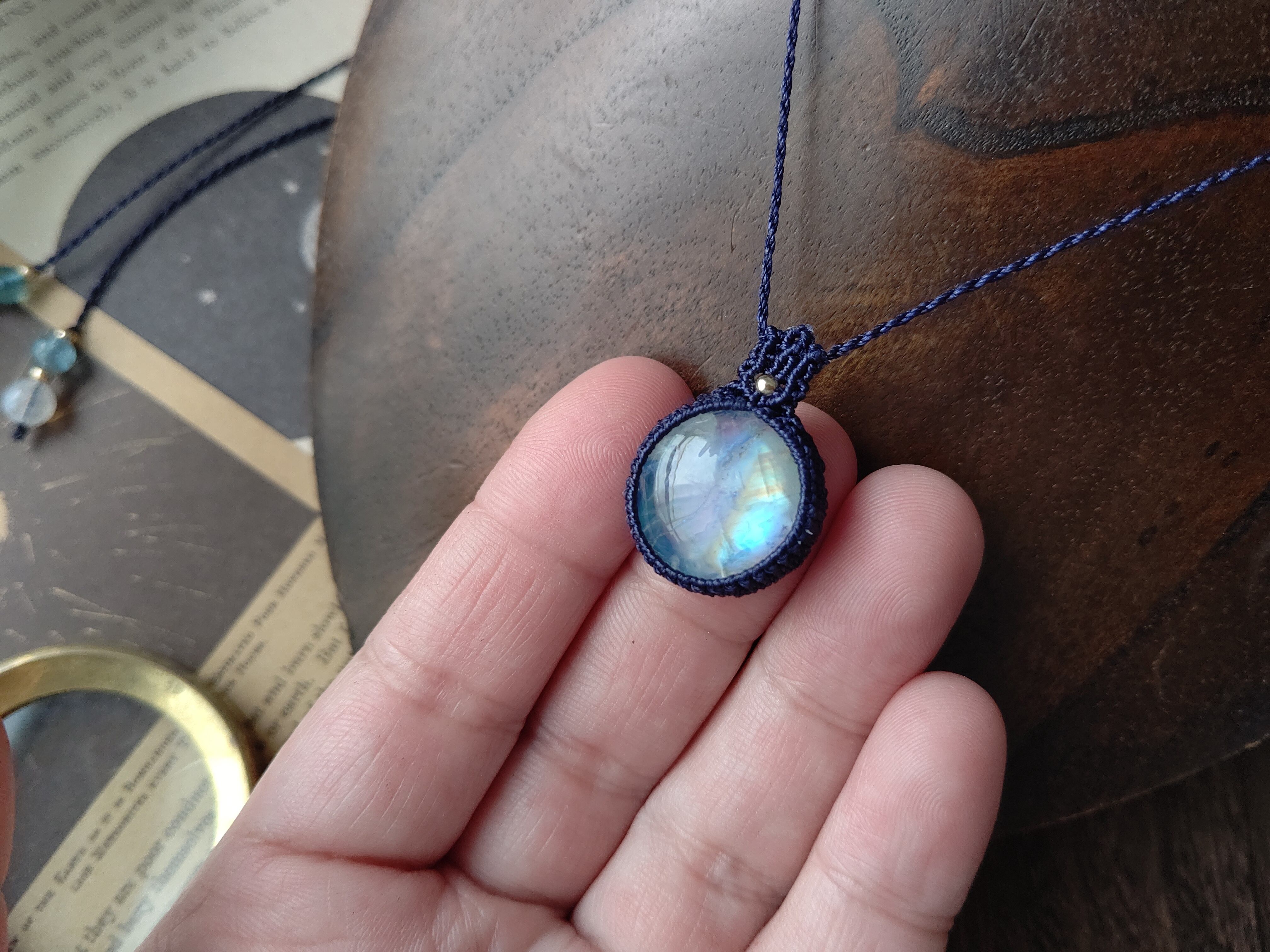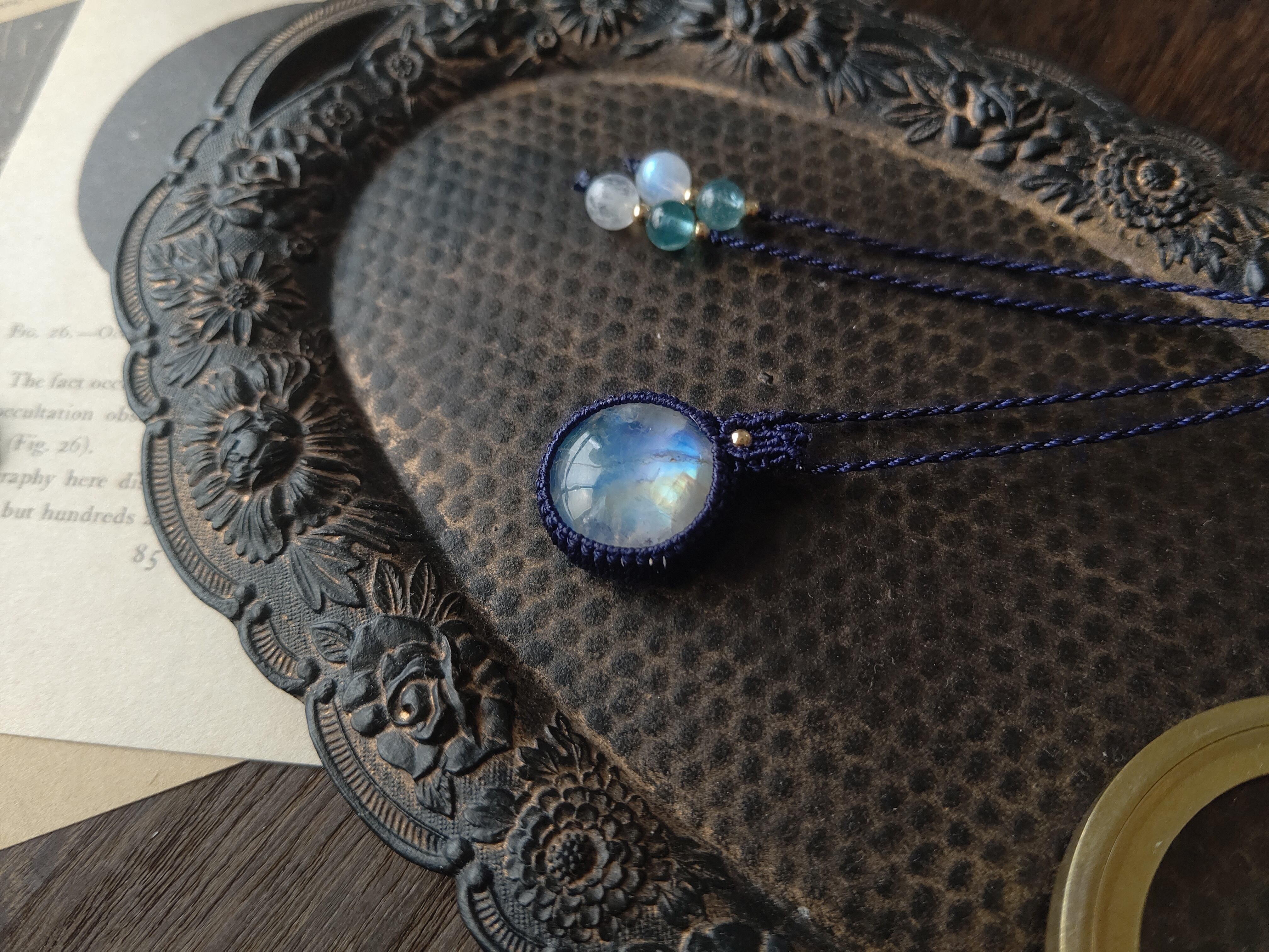 不思議な模様が浮かび上がるレインボームーンストーンを絹糸でシンプルで上品なペンダントに仕立てました。