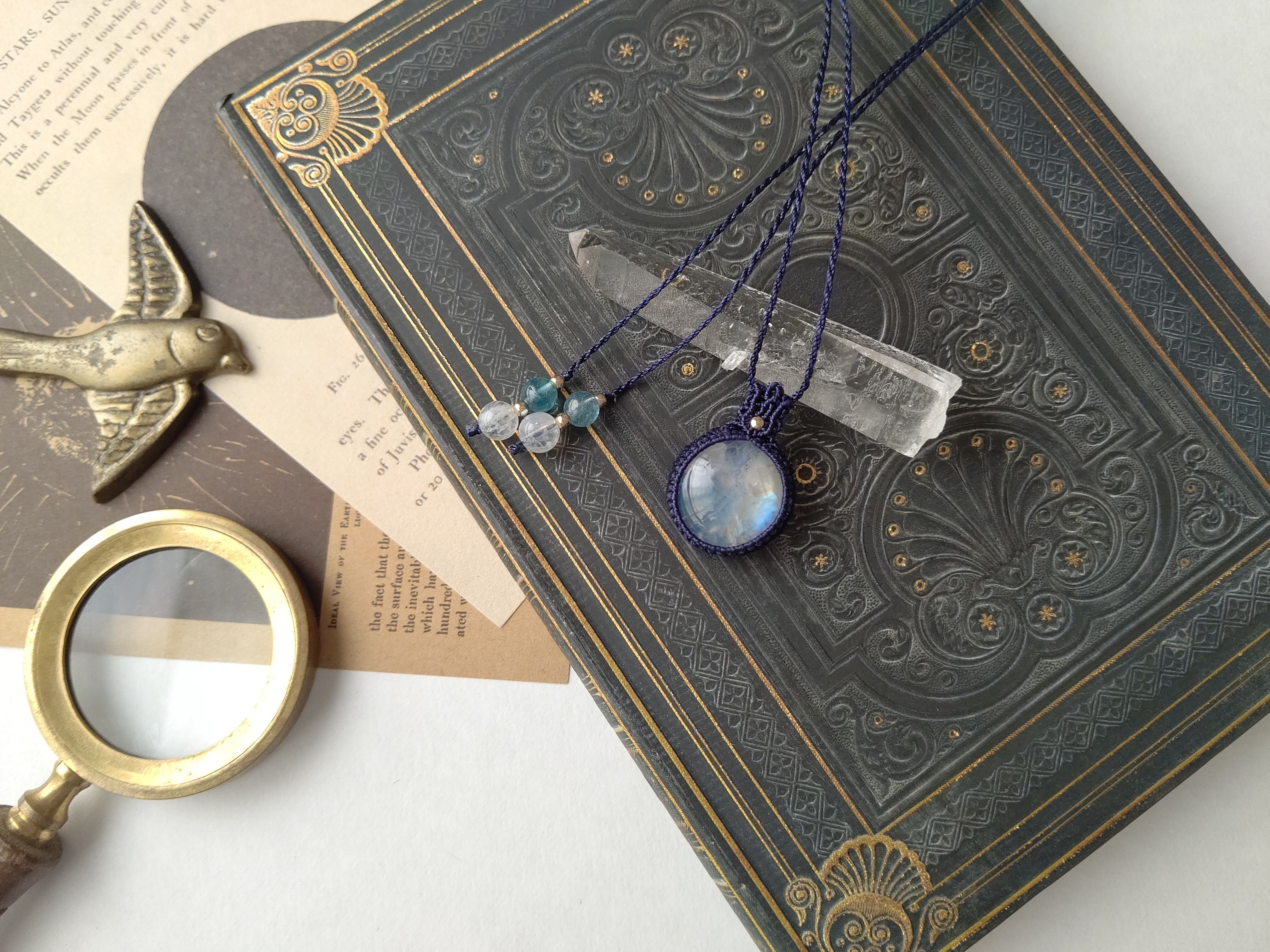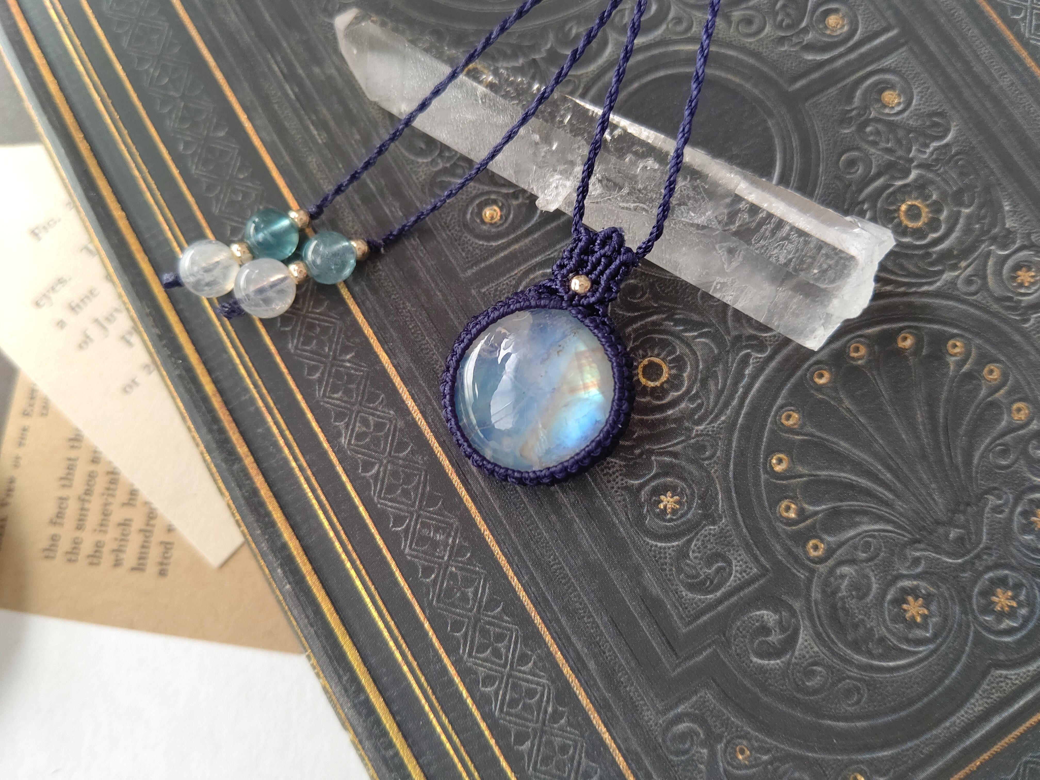 守りの結び石はそれぞれ宝石質のブルーアパタイト、レインボームーンストーンです。