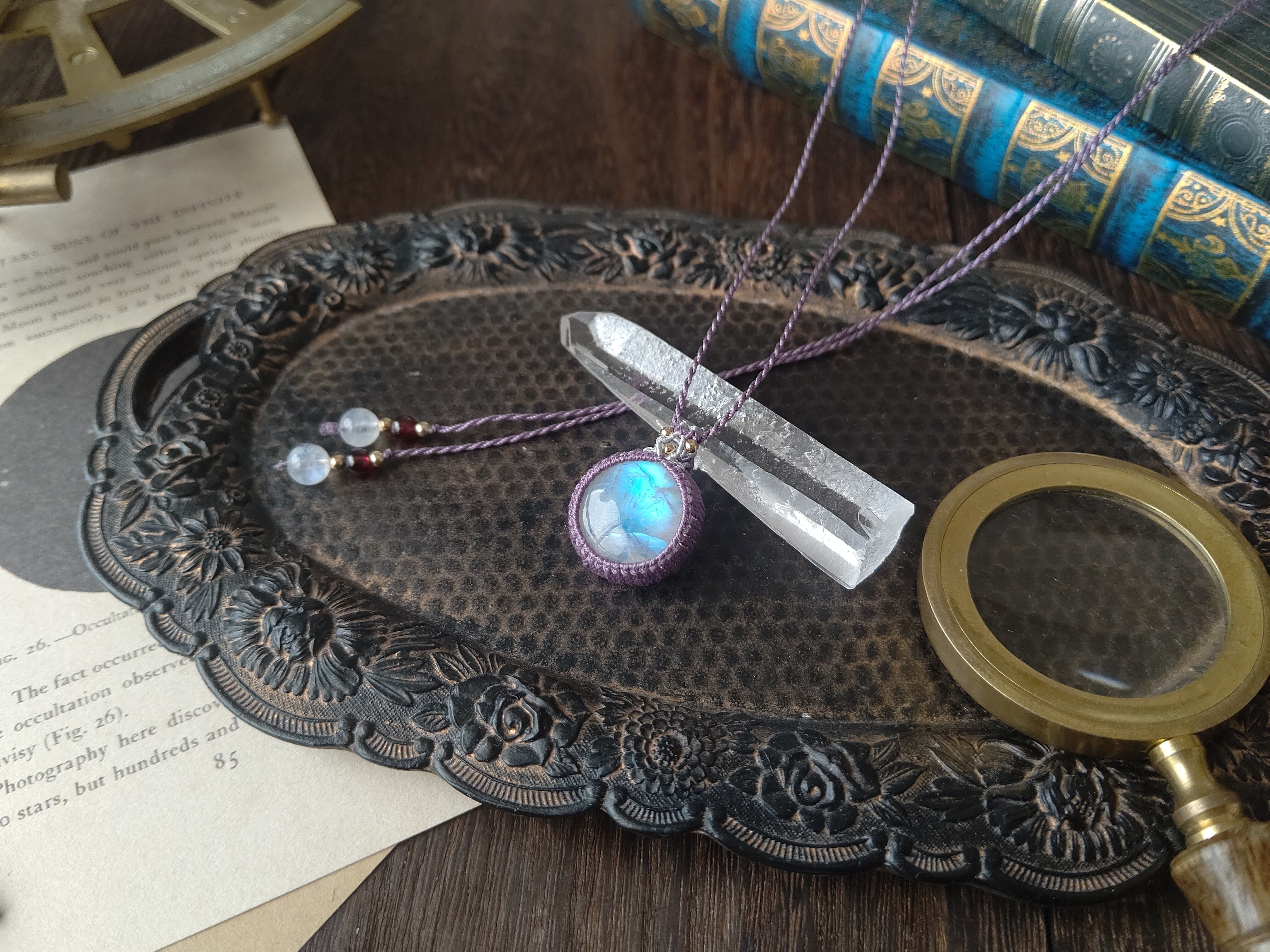 神秘的なブルーのシラーが美しく輝くレインボームーンストーンを絹糸でシンプルで上品なペンダントに仕立てました。