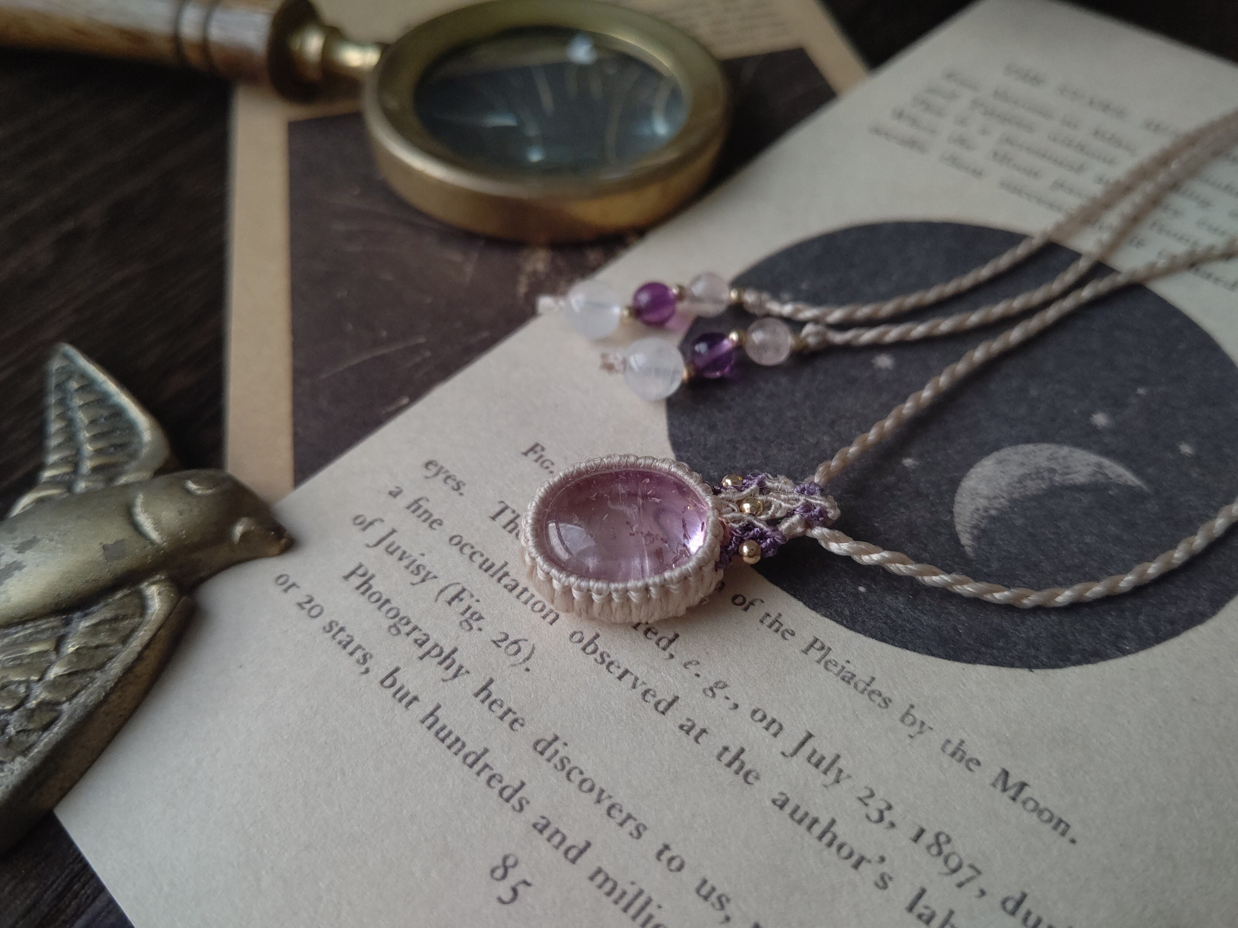 守りの結び石はそれぞれ宝石質モルガナイト、アメジスト、レインボームーンストーンです。