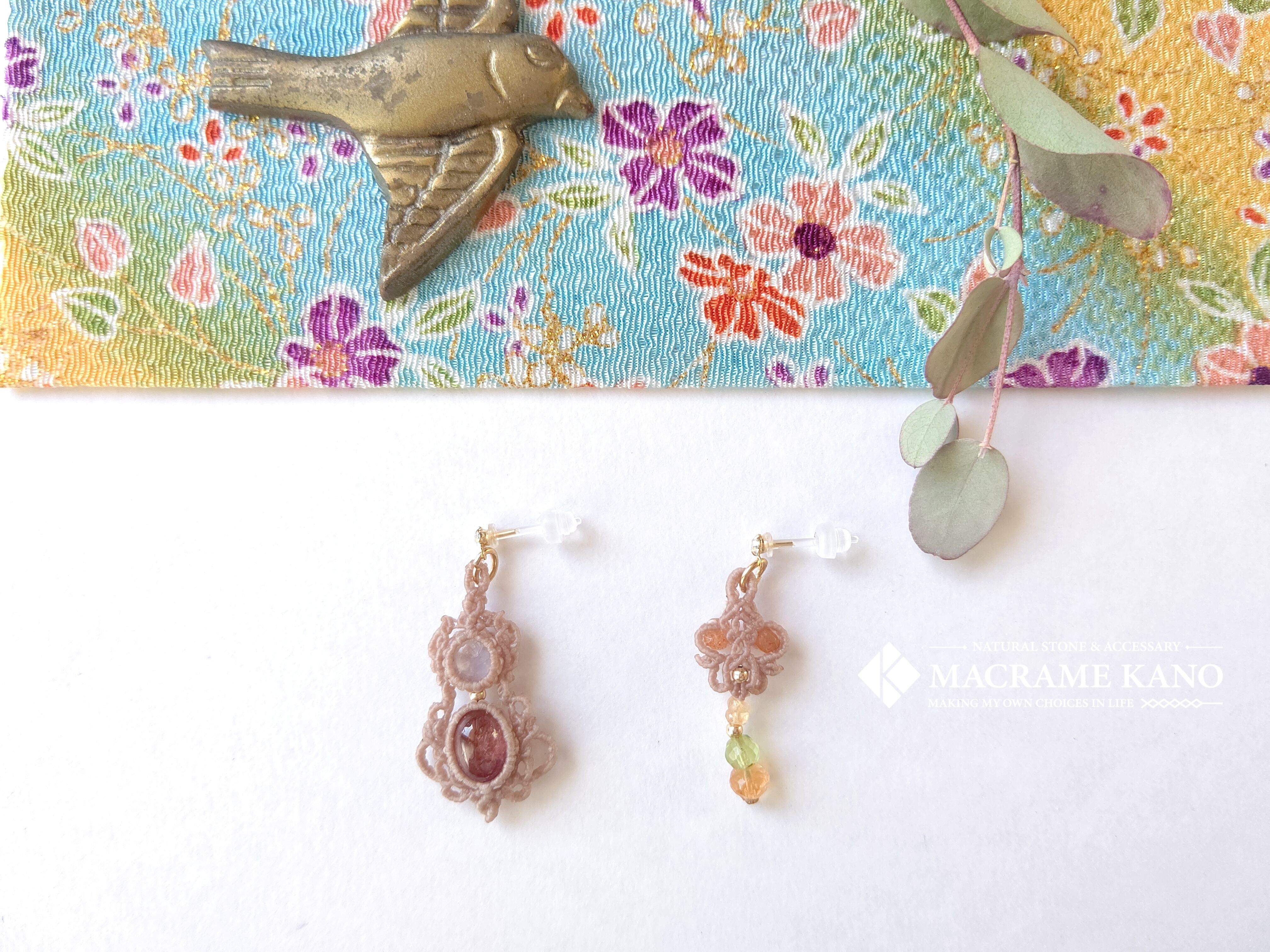 色合いのとても美しいピンクオレンジのトルマリンにブルームーンストーンを組み合わせたアシンメトリーの耳飾りです。