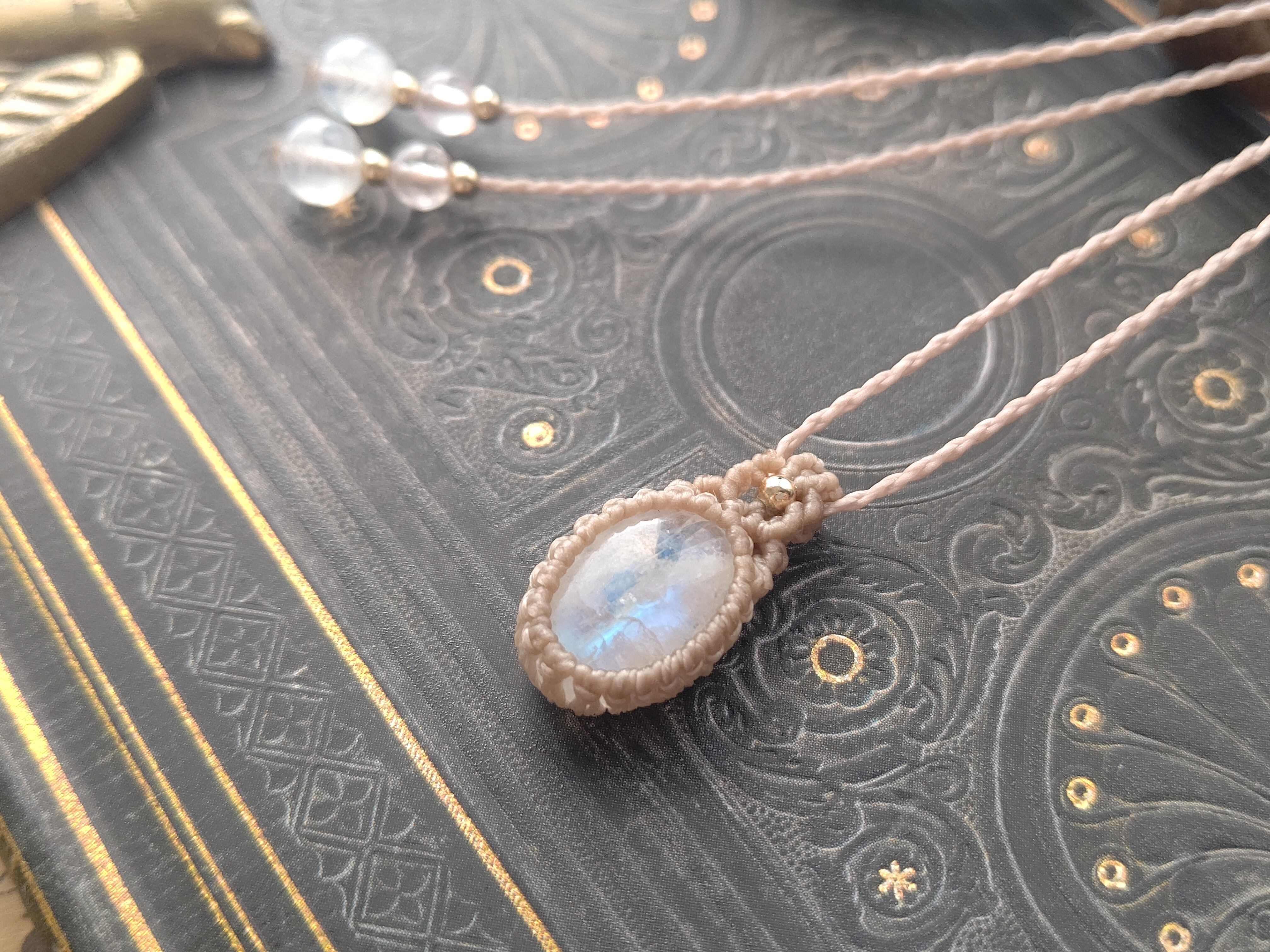 稲妻が雲の間に走ったような、神秘的なシラーが見られるホワイトラブラドライトをシンプルなマクラメペンダントに仕立てました。