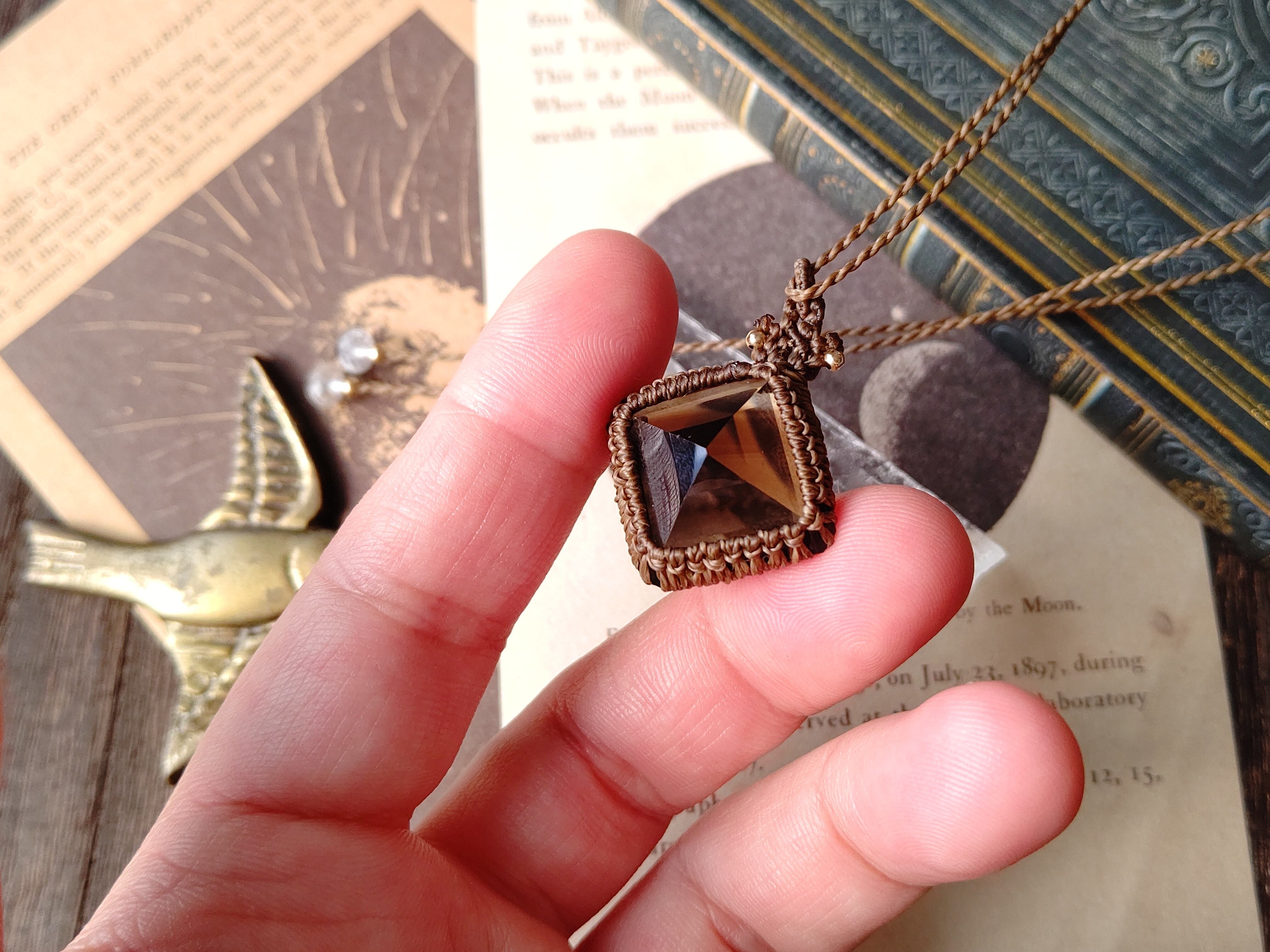 スクエアカットのスモーキークォーツのマクラメペンダント