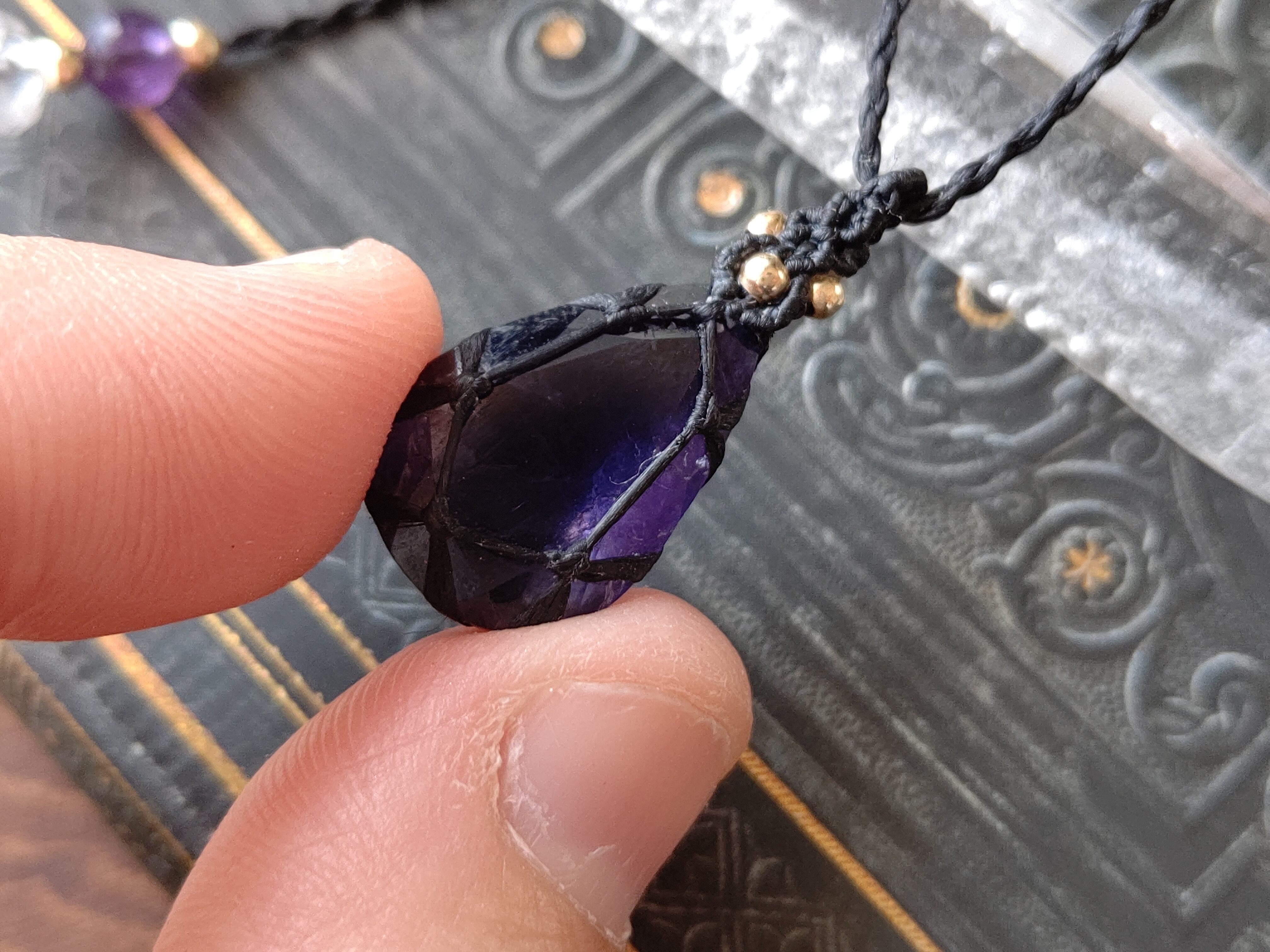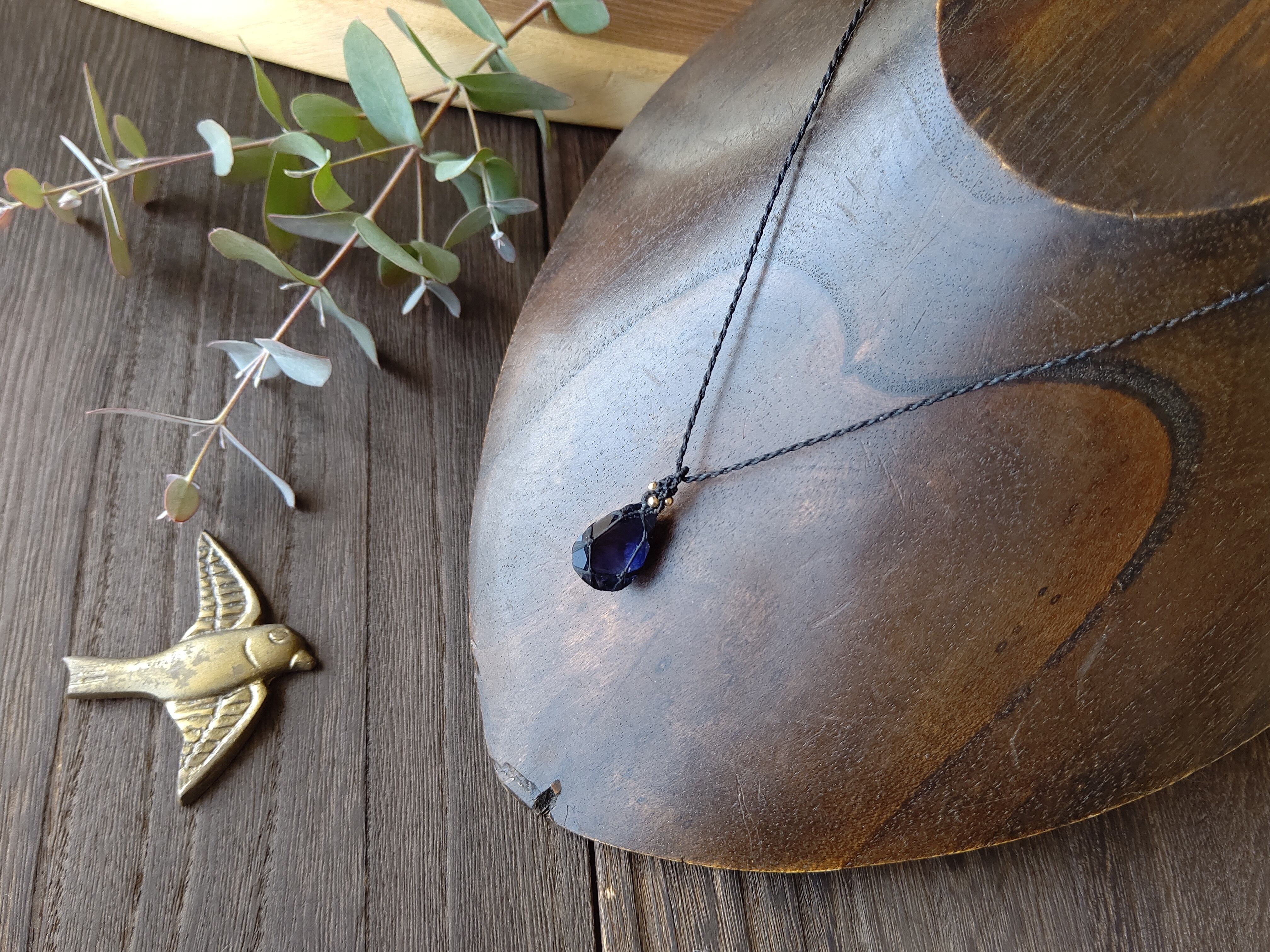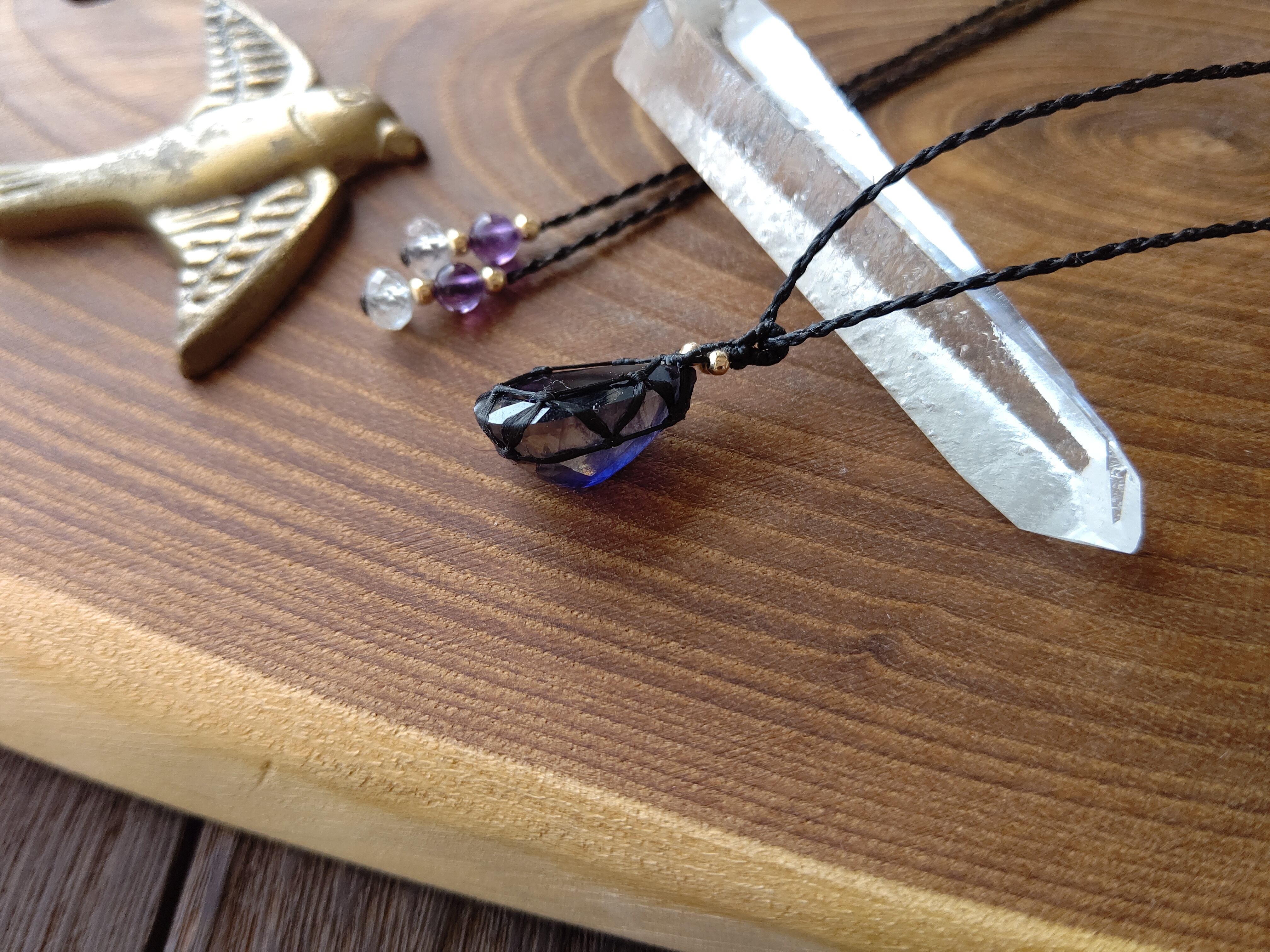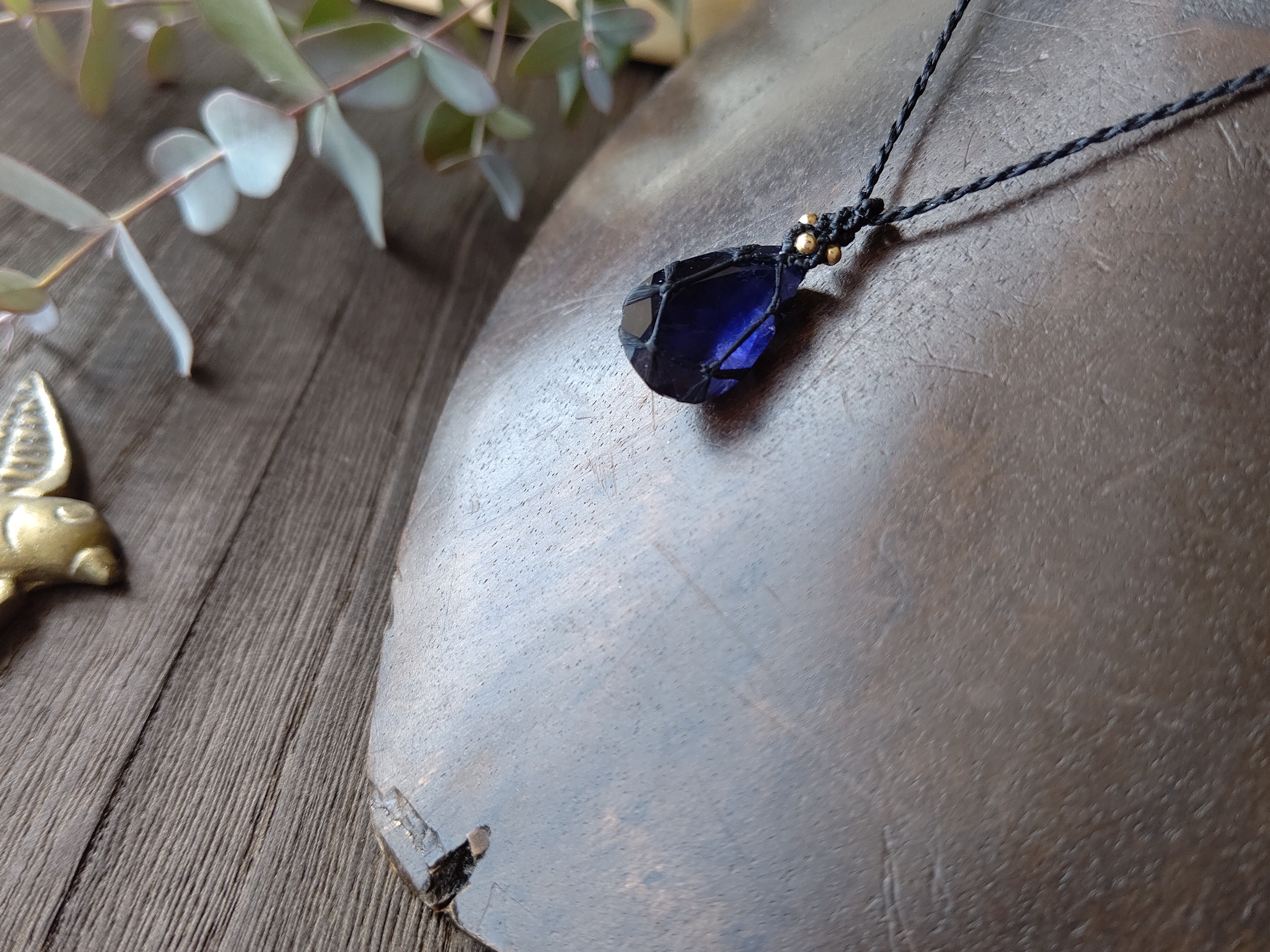 ジュエリーカットの宝石質アイオライトのマクラメペンダント/0.25mm仕上げ
