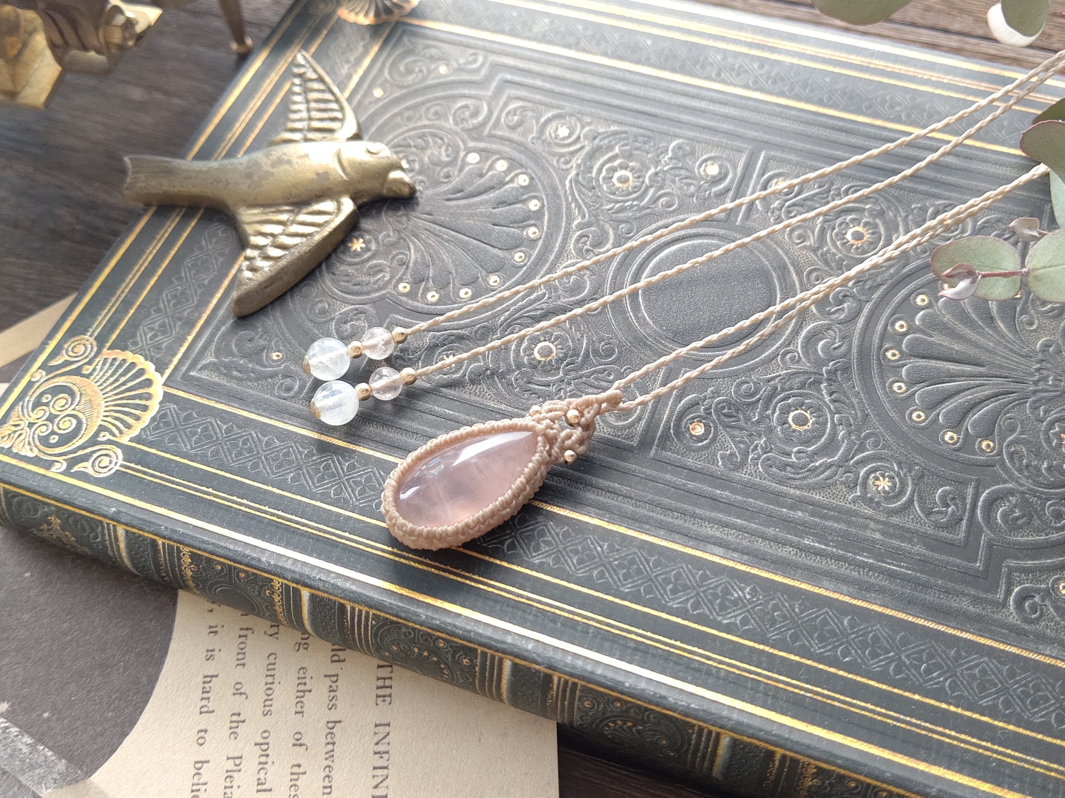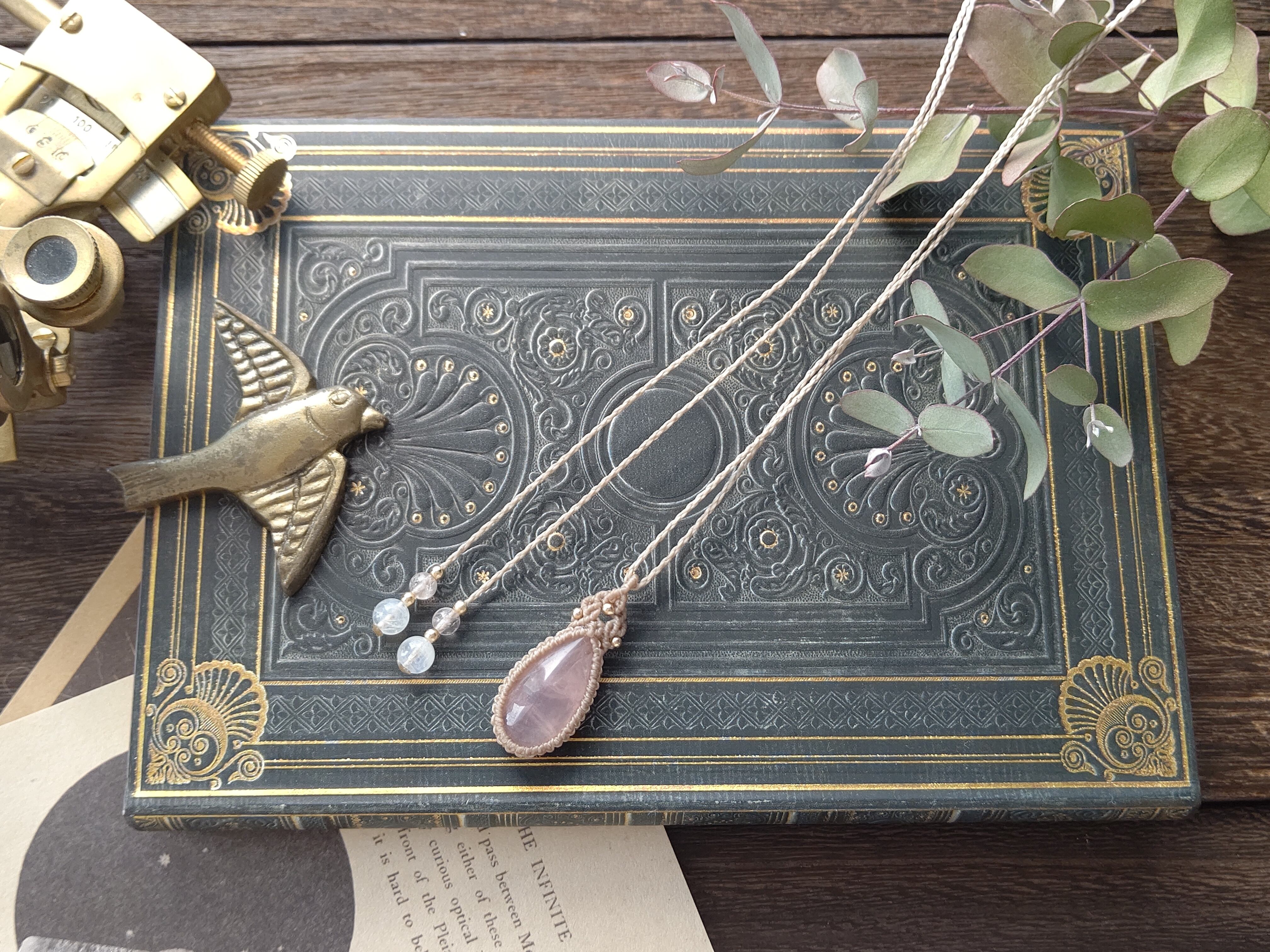 マダガスカル産ローズクォーツのマクラメペンダント/0.5mm仕上げ