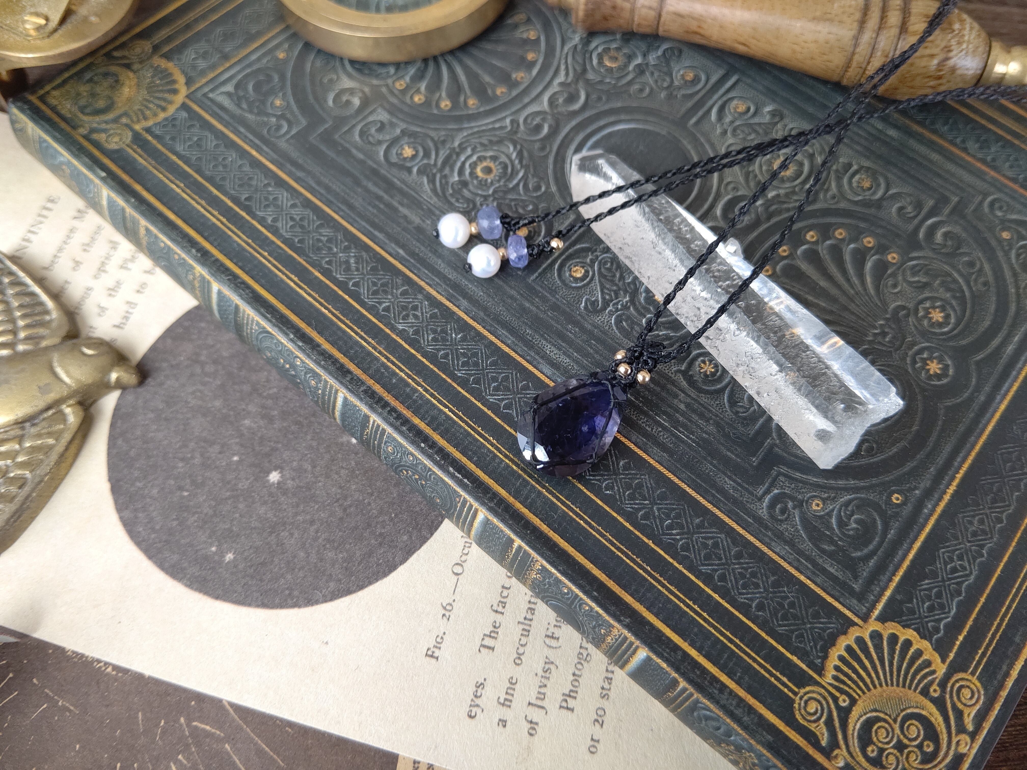 ジュエリーカットの宝石質アイオライトのマクラメペンダント/0.25mm仕上げ