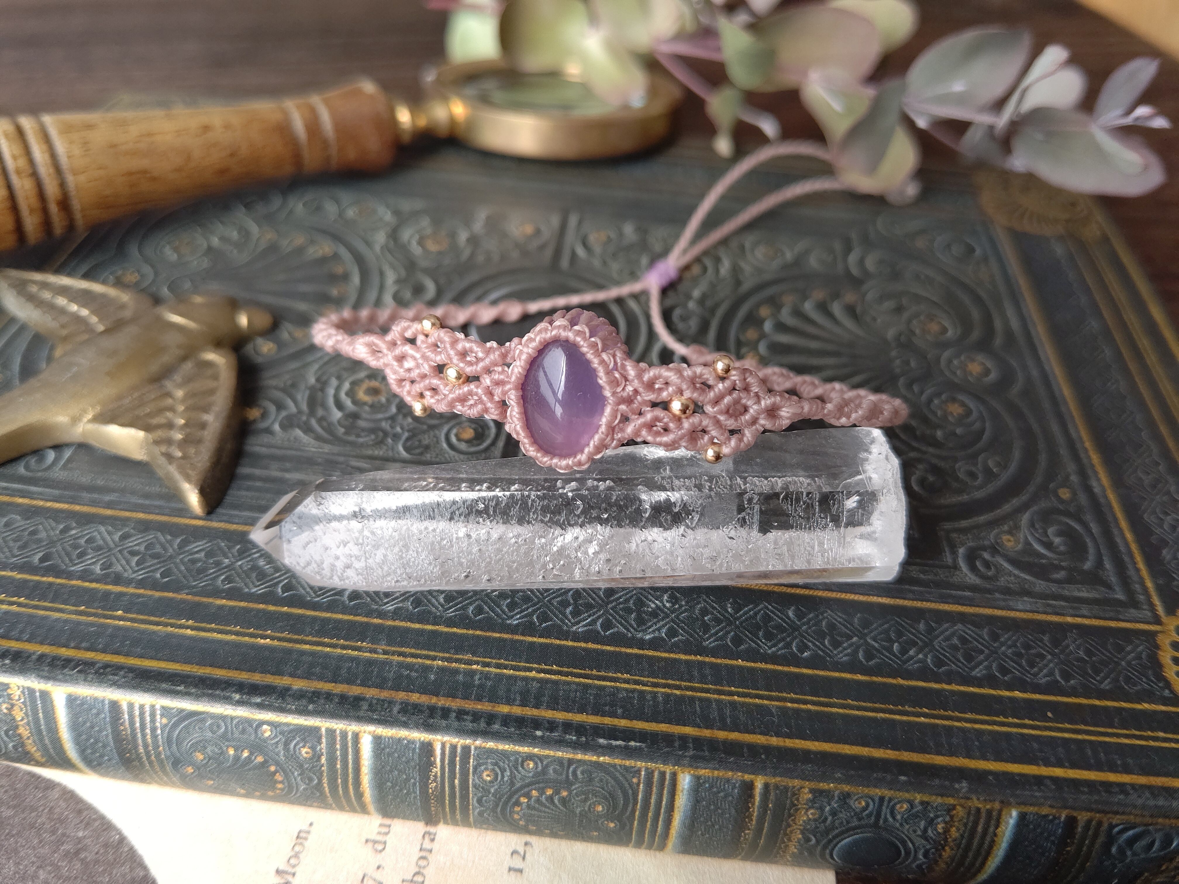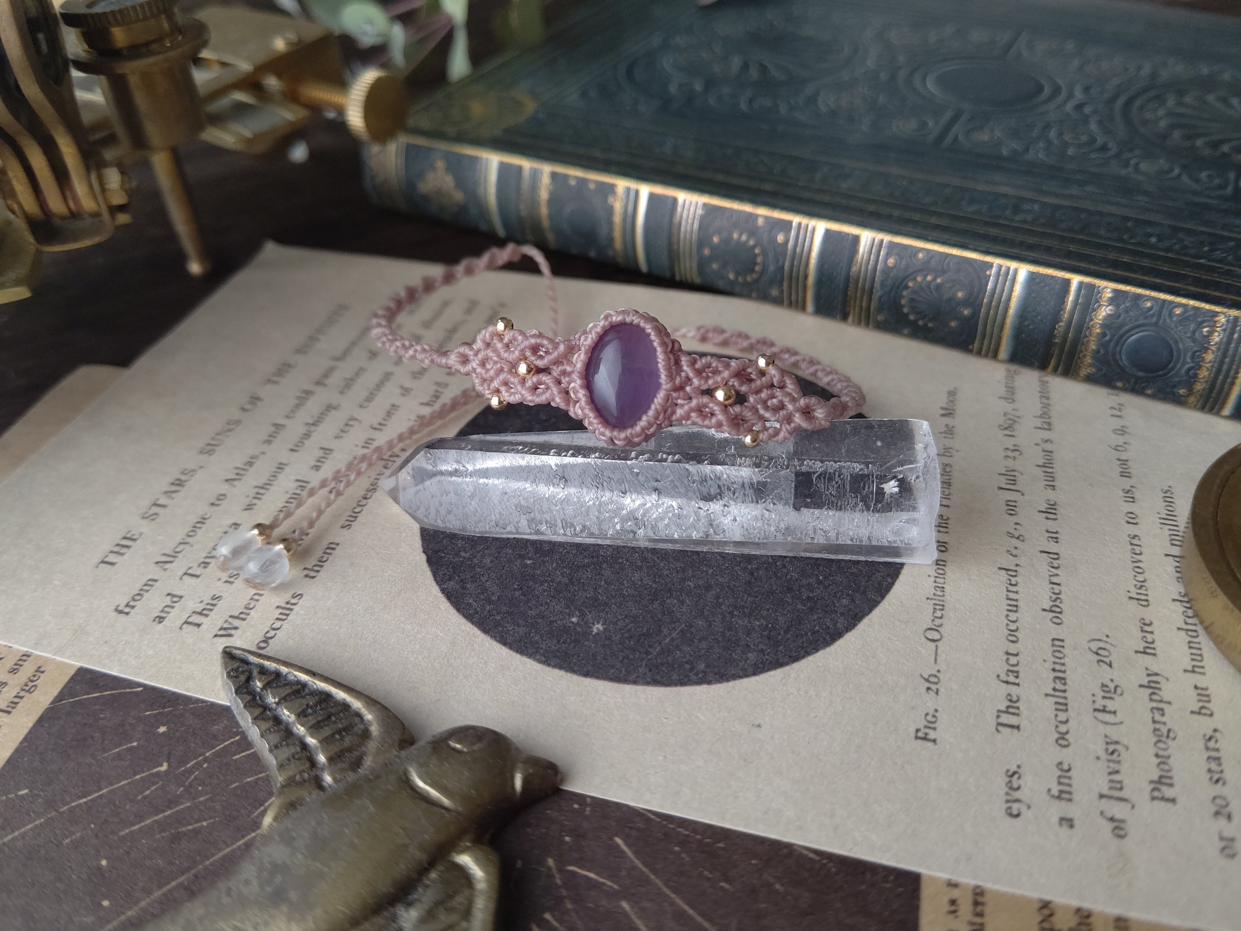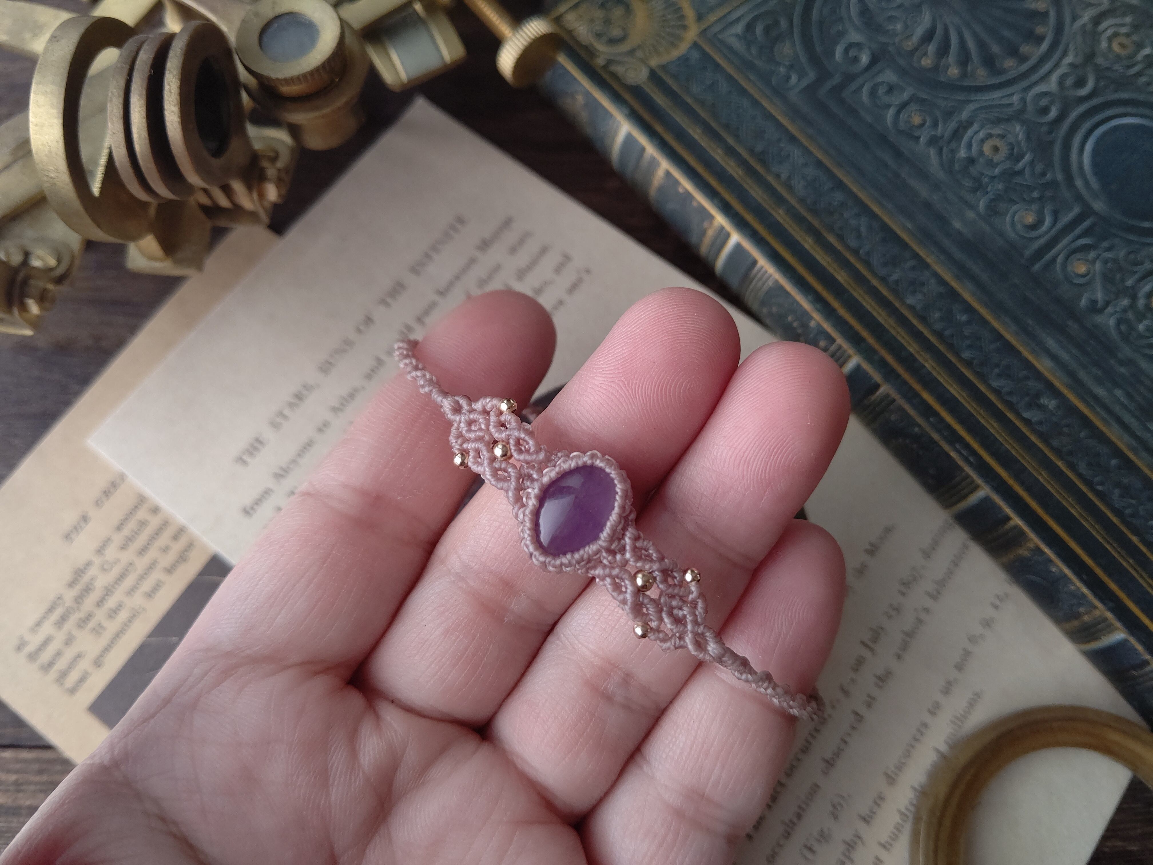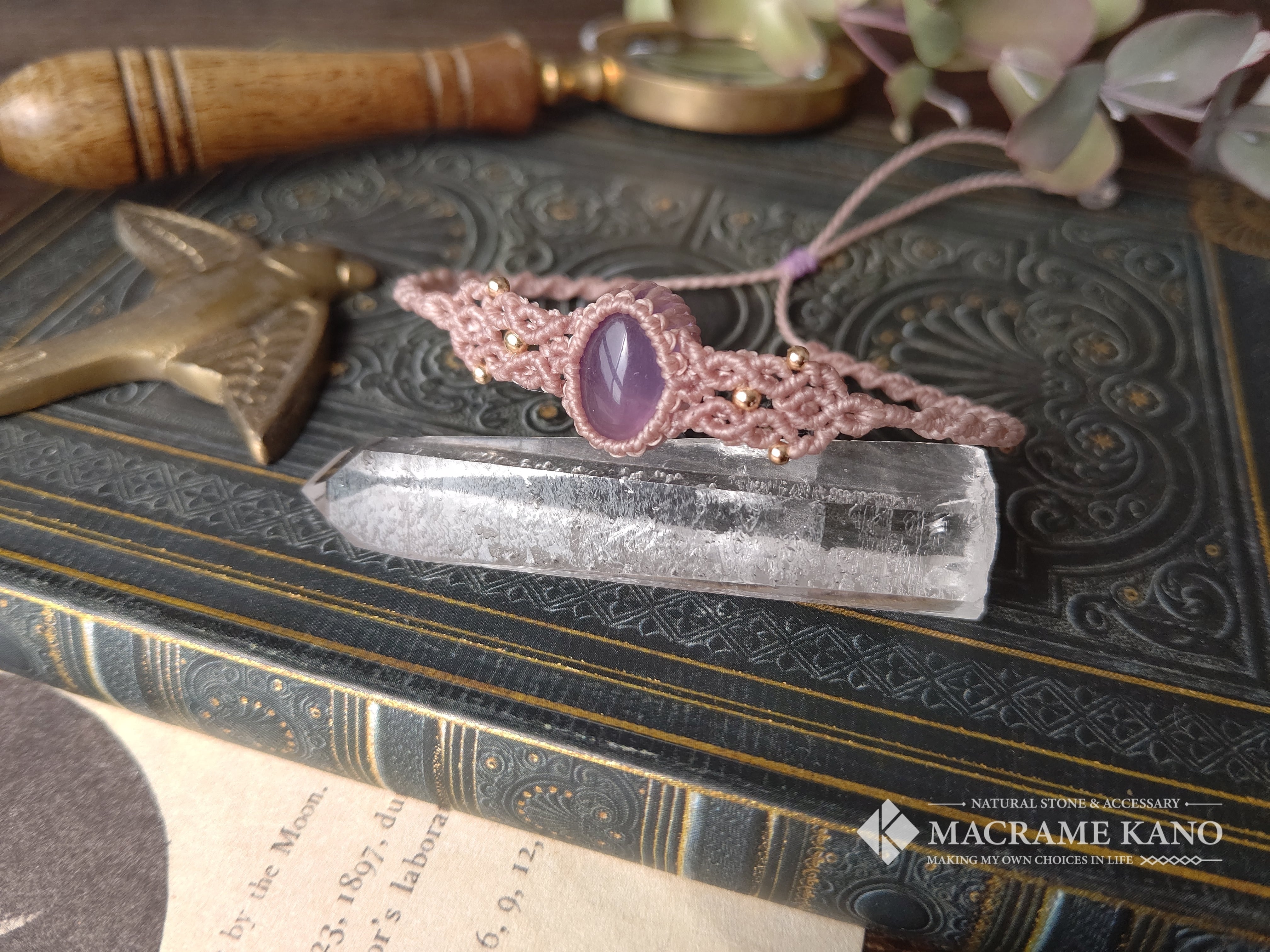 パープルカラーのフローライトでマクラメらしい編み込みのブレスレットを製作しました。