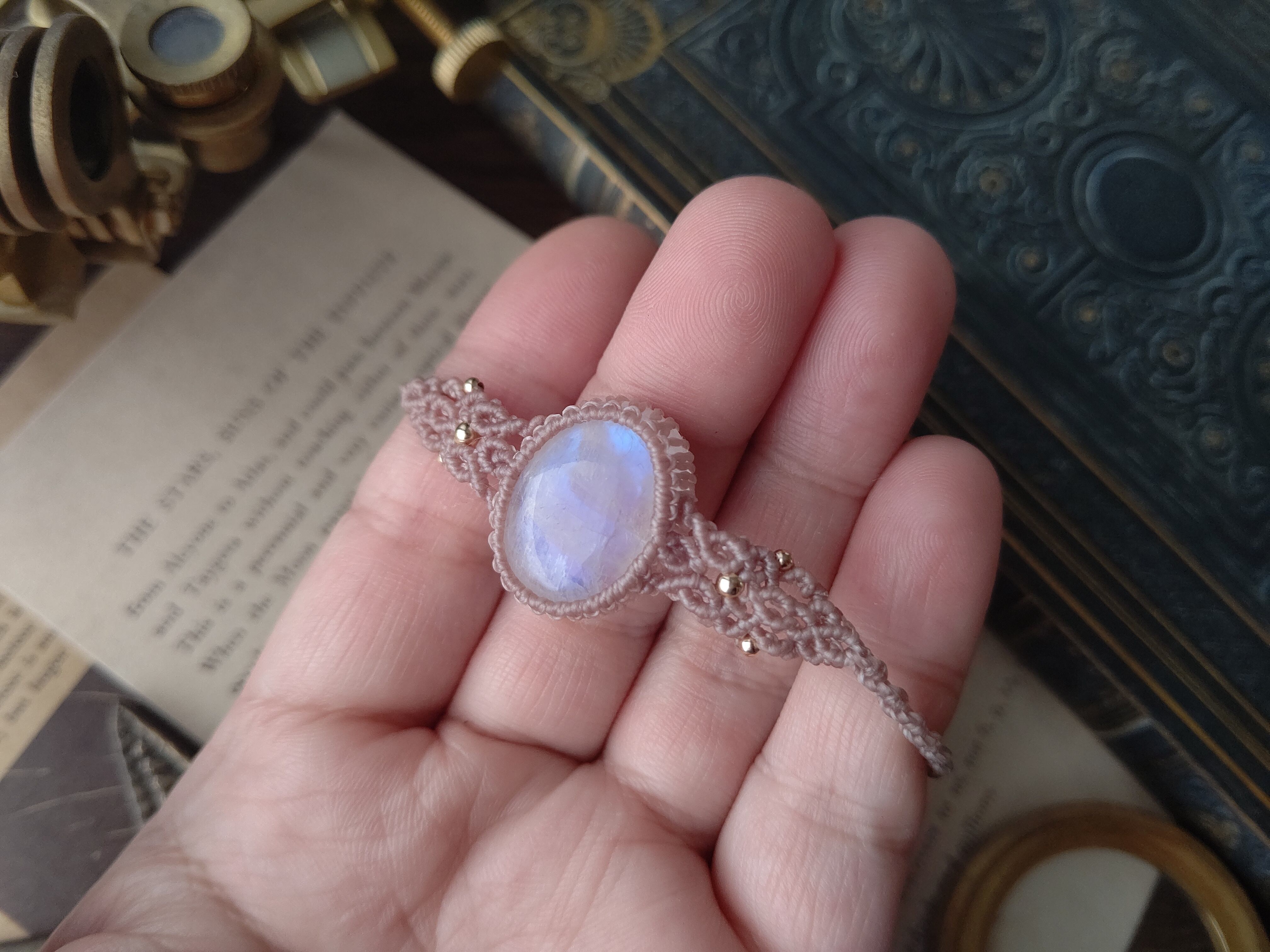 大粒のブルームーンストーン(ホワイトラブラドライト)でマクラメらしい編み込みのブレスレットを製作しました。