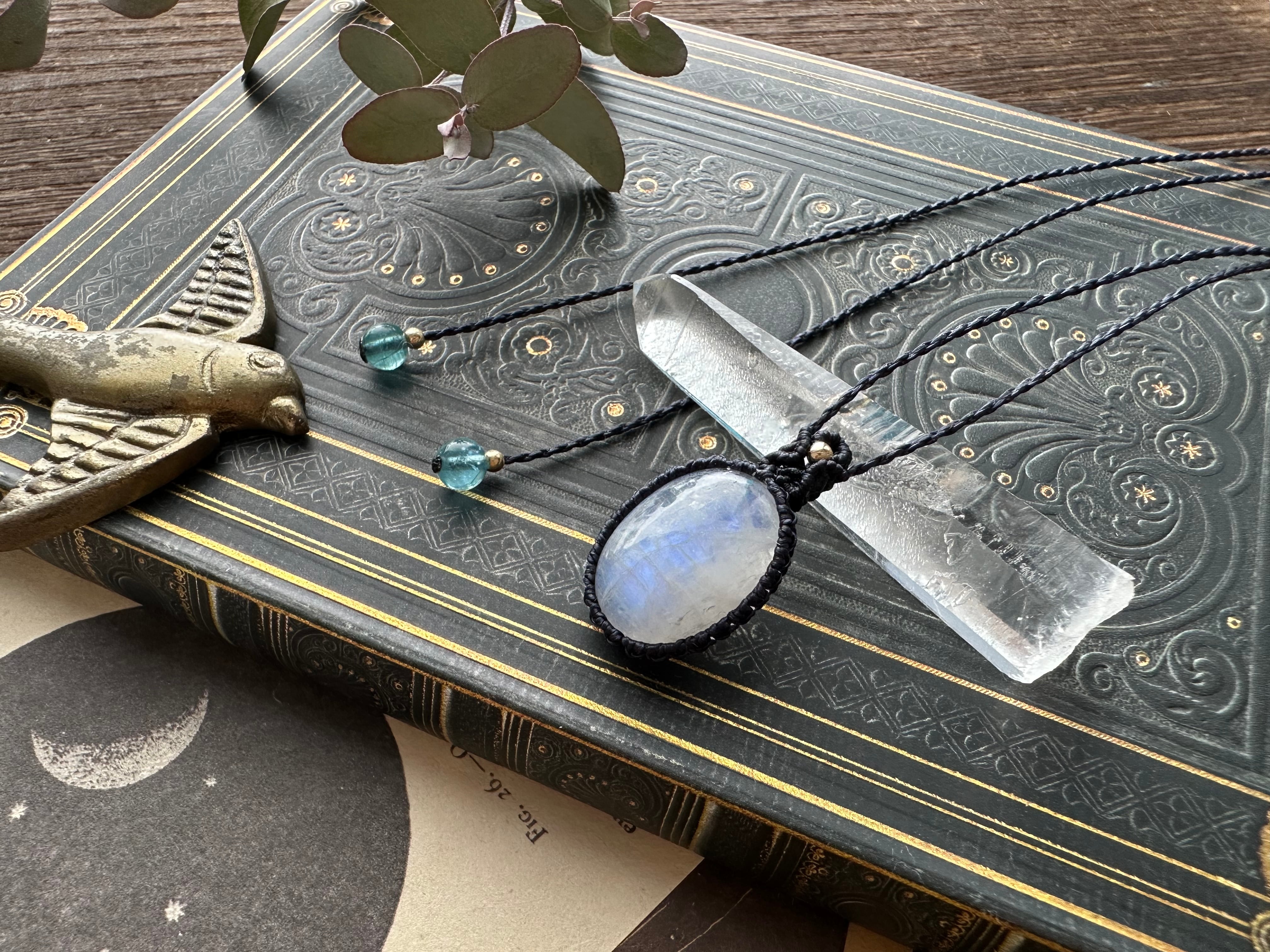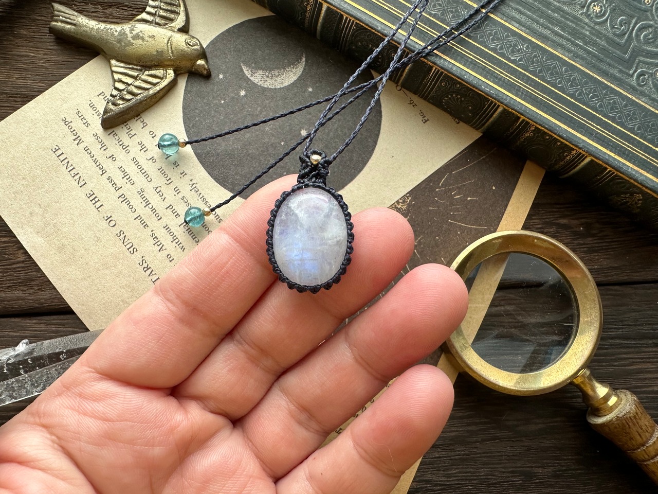大きめホワイトラブラドライトのマクラメペンダント/0.5mm仕上げ