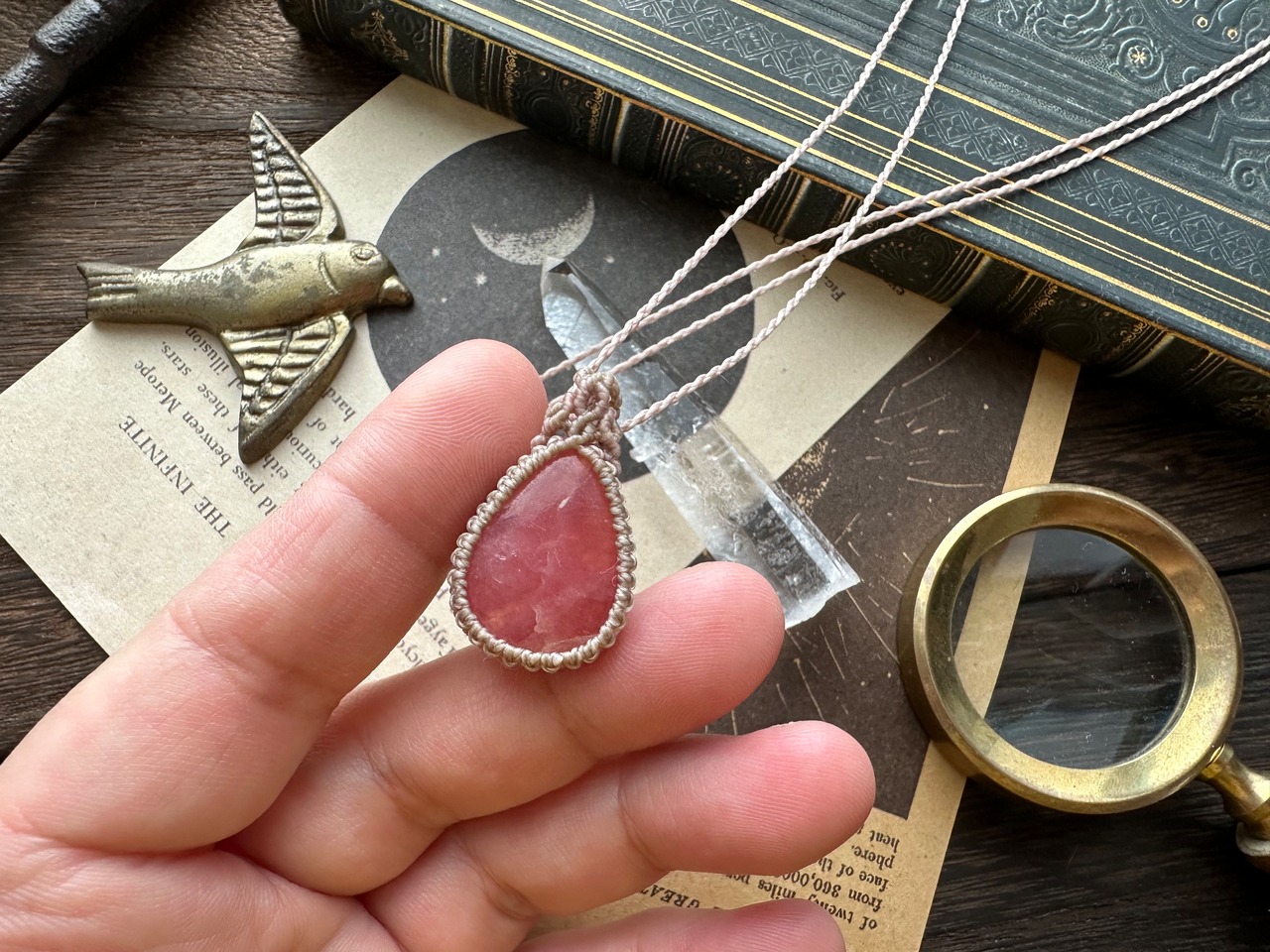八重桜色 / 雫のインカローズ(ロードクロサイト)のマクラメペンダント/0.5mm仕上げ