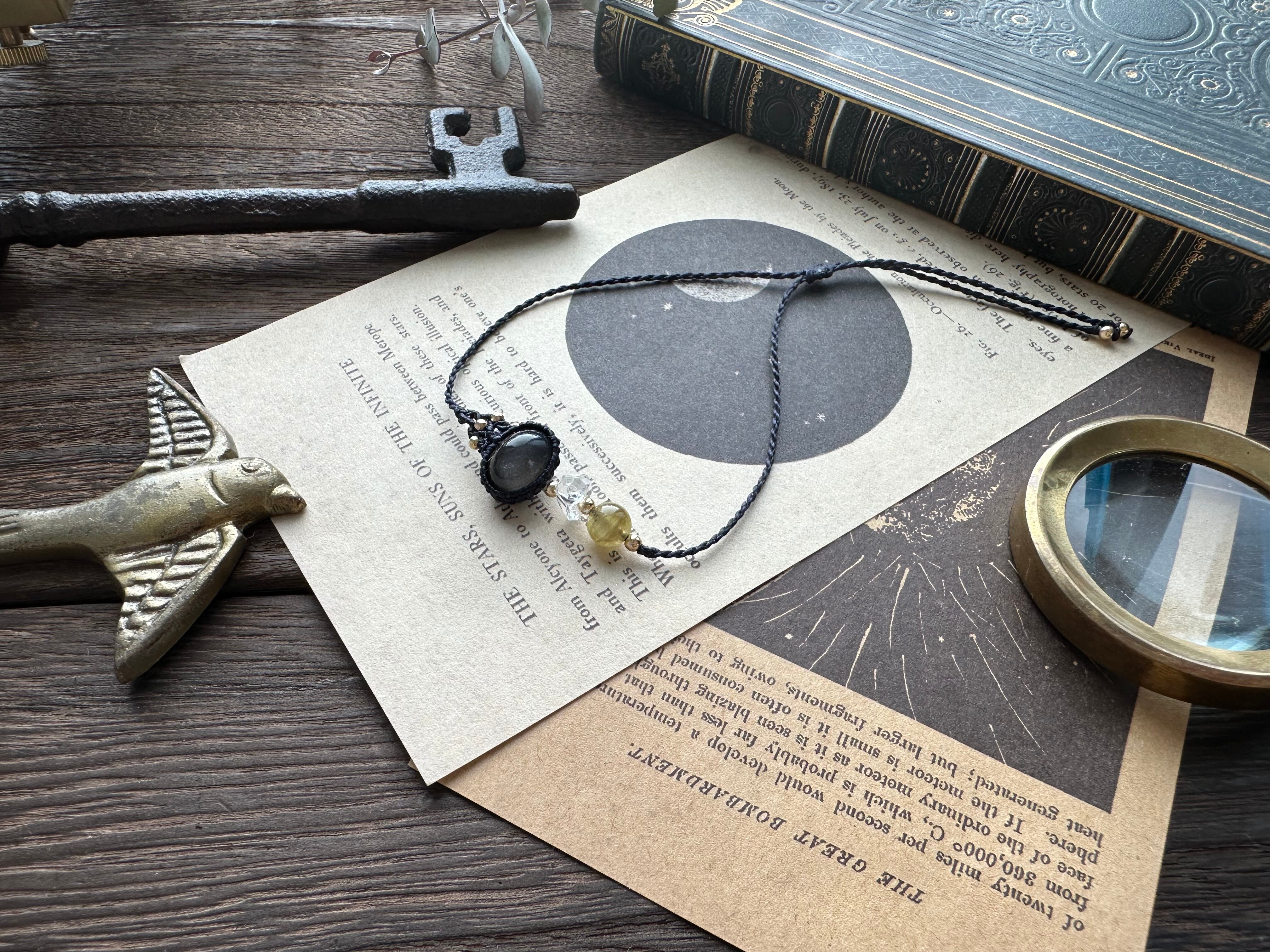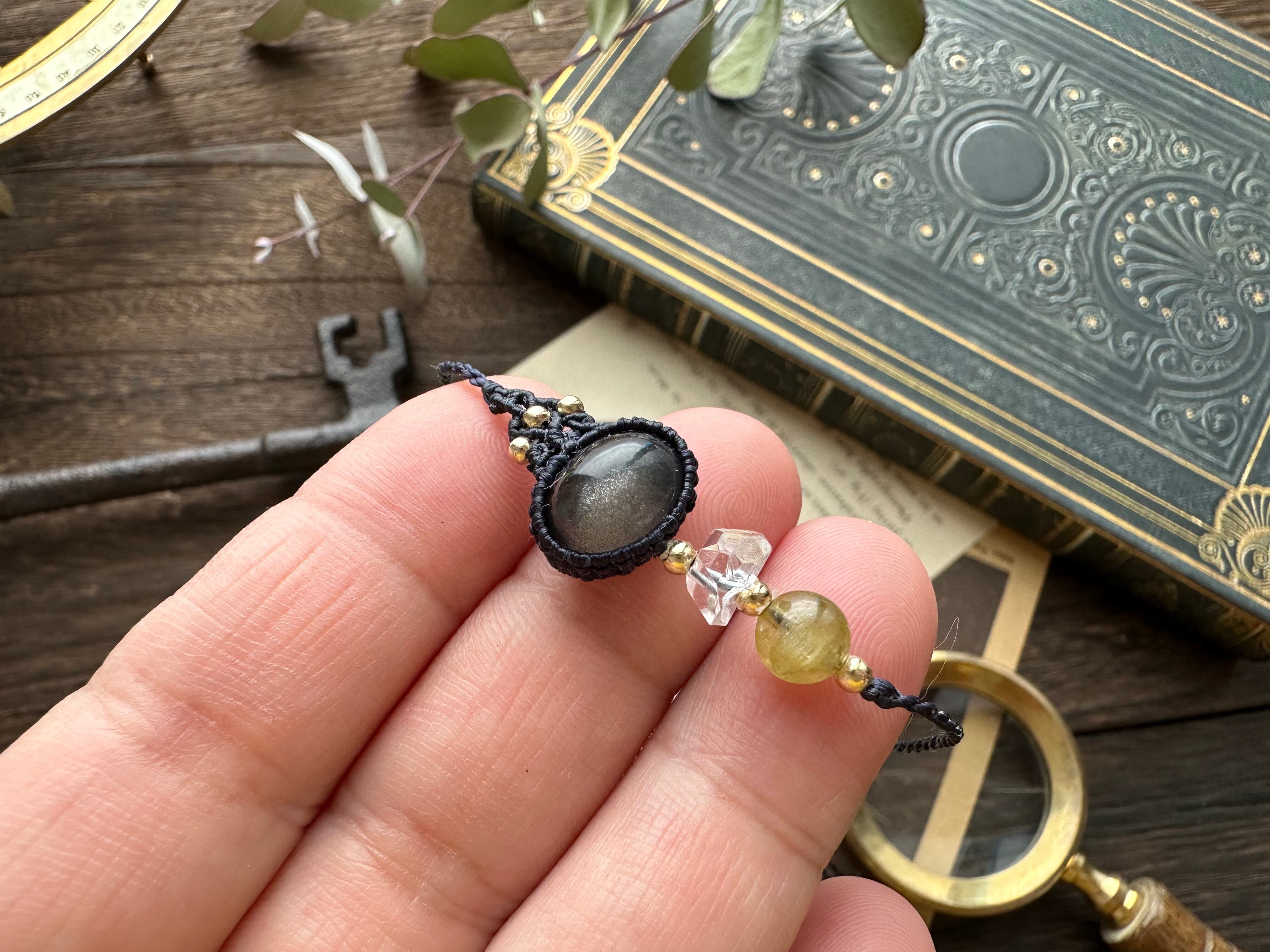 粒感と光沢が素晴らしい、高品質のグレームーンストーンは角度によってシルバーのシラーが表面に見られます。石色はいぶし銀のようなグレーと黒の中間色で、光の当たる角度によって細やかな灰銀色の光が移動します。ハーキマーの横に、少し個性的なルチルクォーツのビーズを組み合わせアクセントにしています。