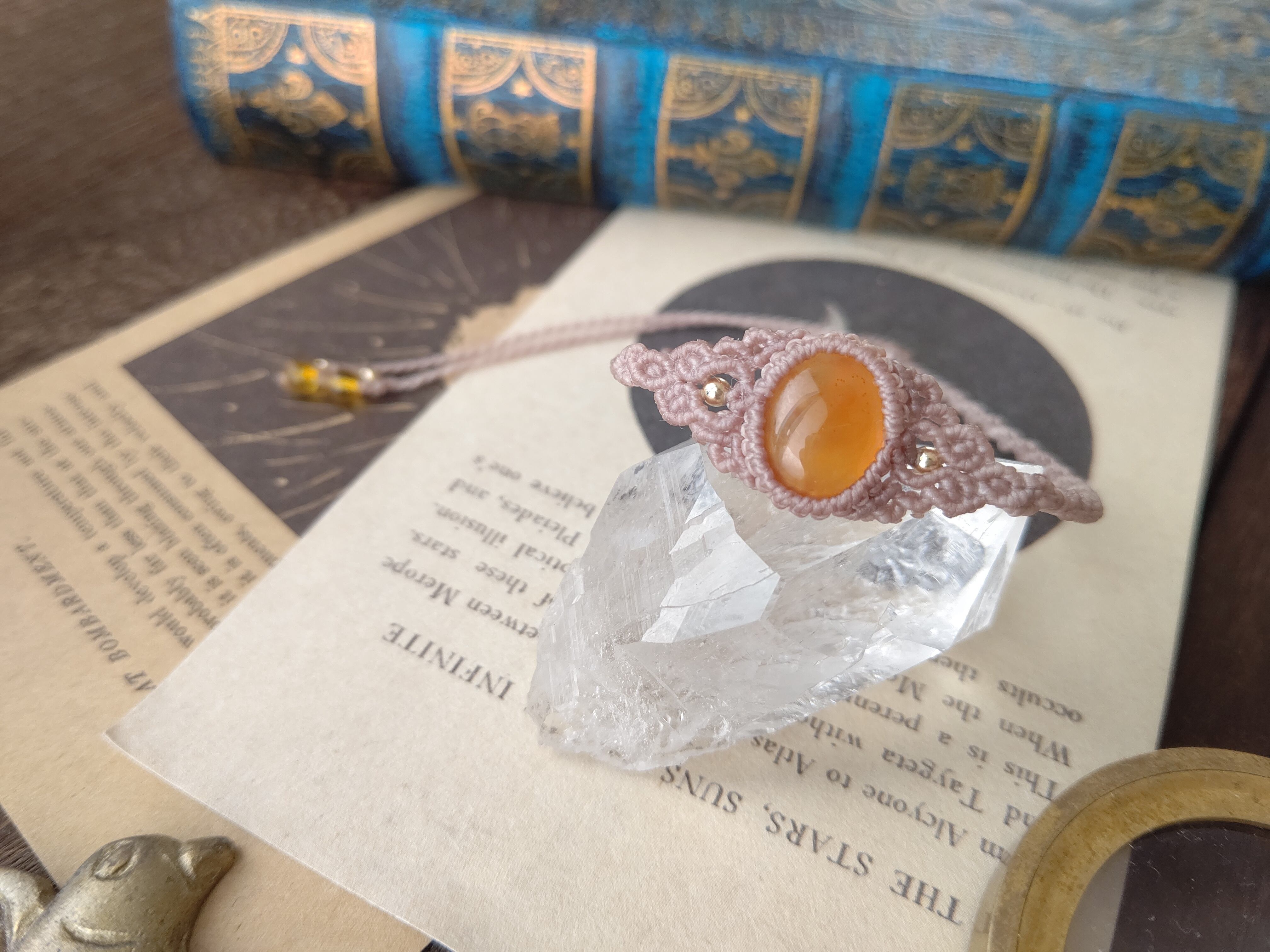 オレンジグミのように美味しそうな色合いのカーネリアンをマクラメらしい編み込みのブレスレットを製作しました。