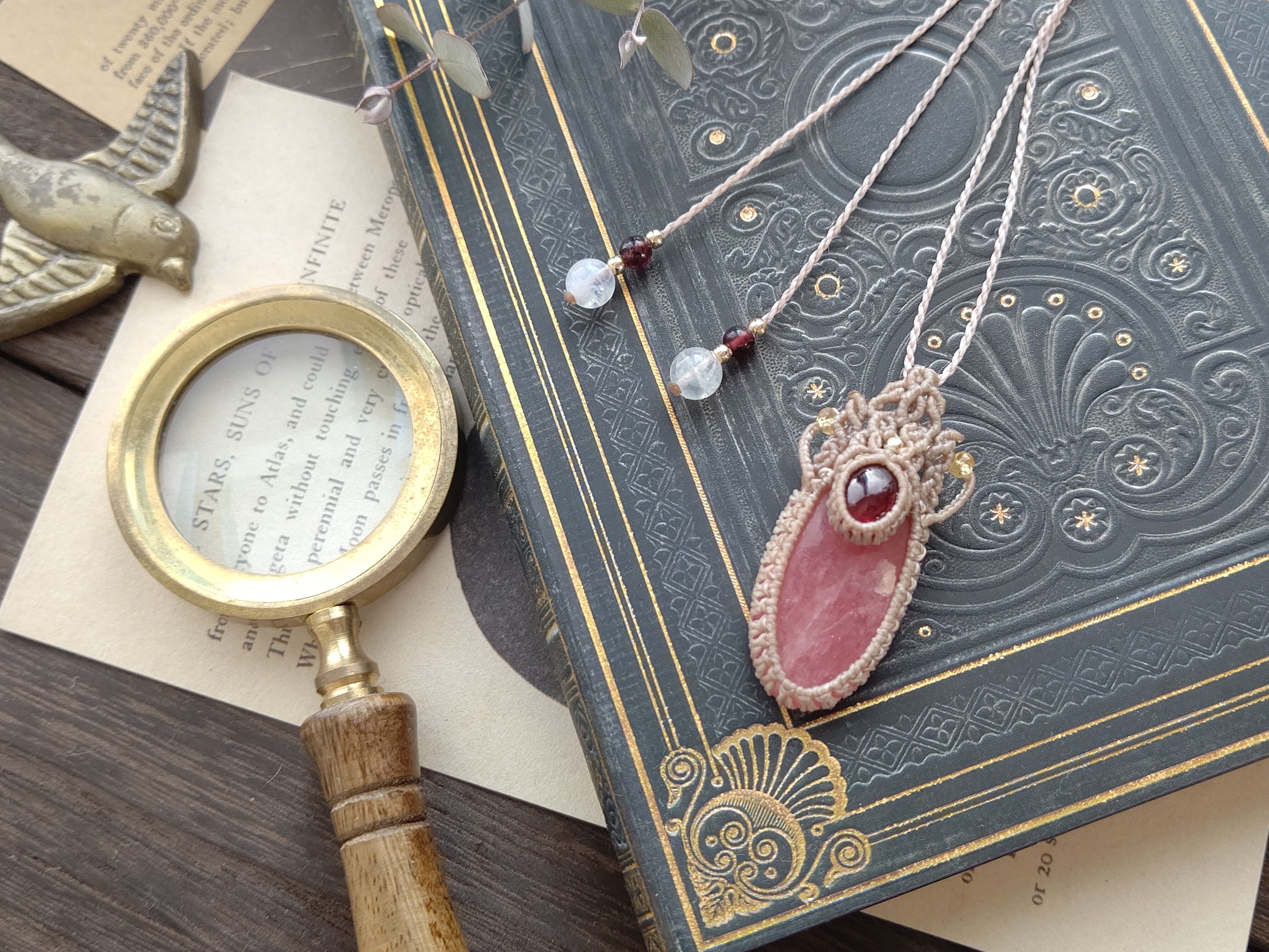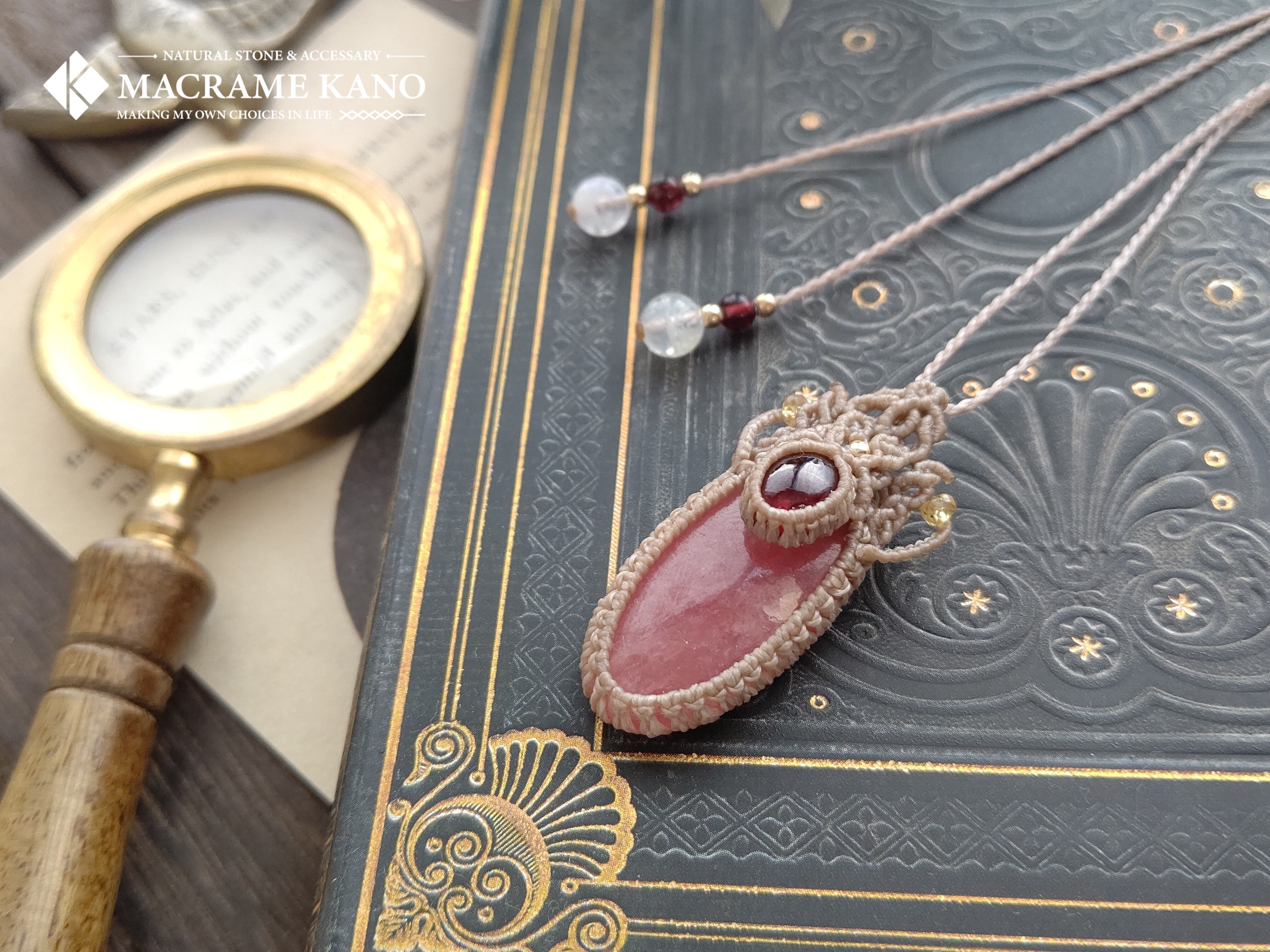 大粒のロードクロサイトにヘソナイトガーネットを組み合わせ、ルースの上に乗せて固定する形(アンダートップ)で印象的で見栄えのするペンダントを製作しました。