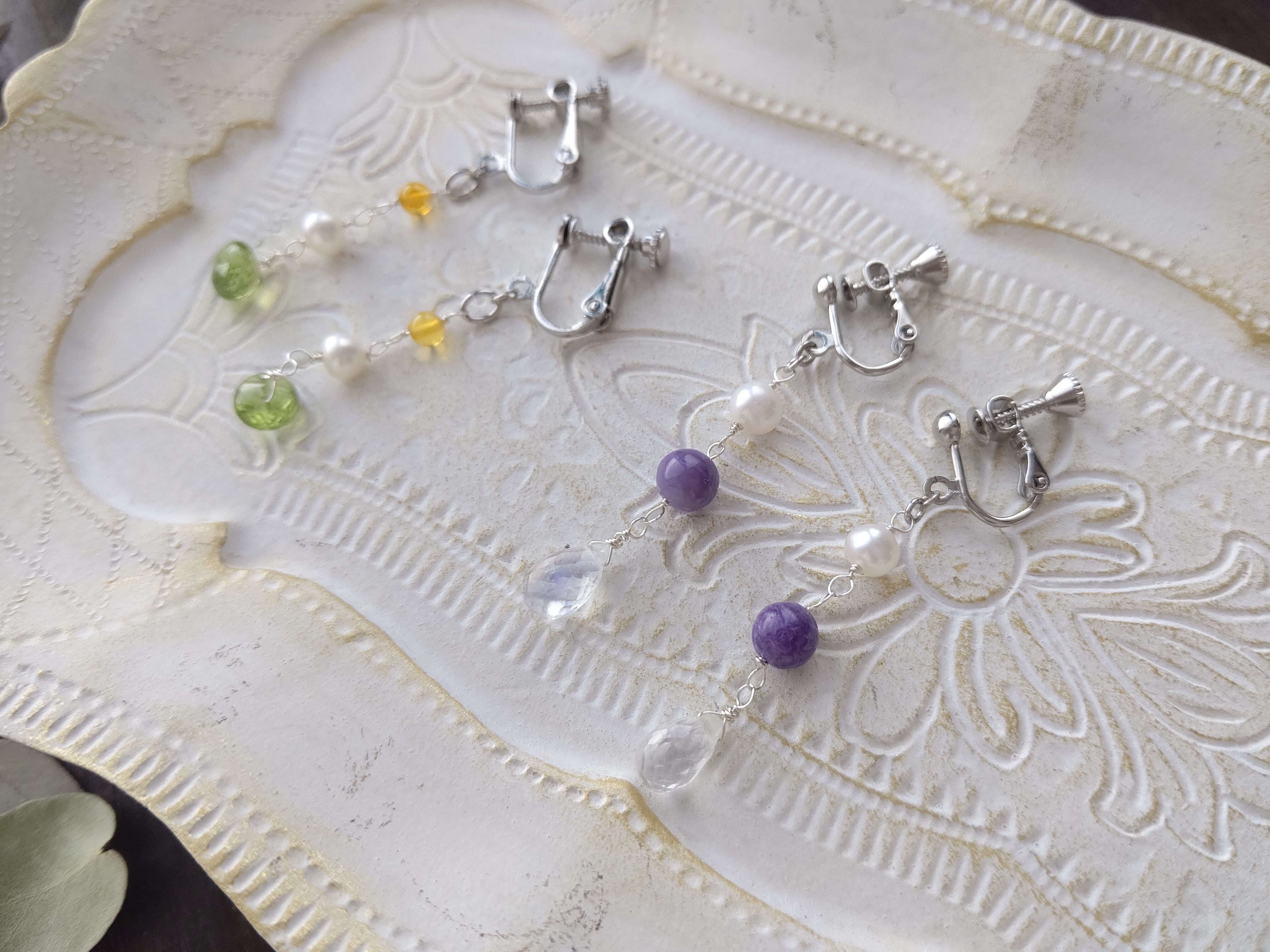 淡水パール×チャロアイト×宝石質レインボームーンストーンを組み合わせ、耳元でゆらゆら揺れる耳飾りを製作しました。