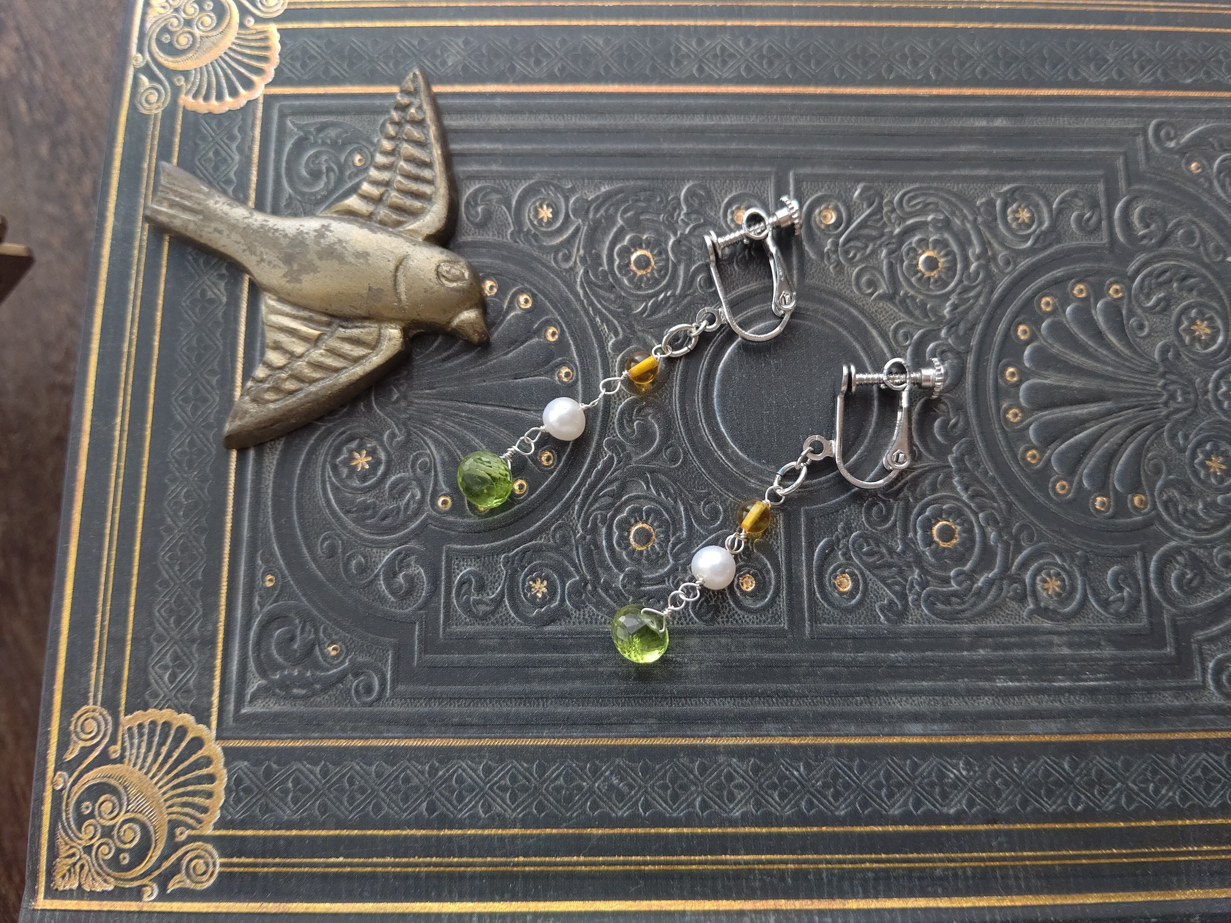 淡水パール×バルティックアンバー×宝石質ペリドットを組み合わせ、耳元でゆらゆら揺れる耳飾りを製作しました。