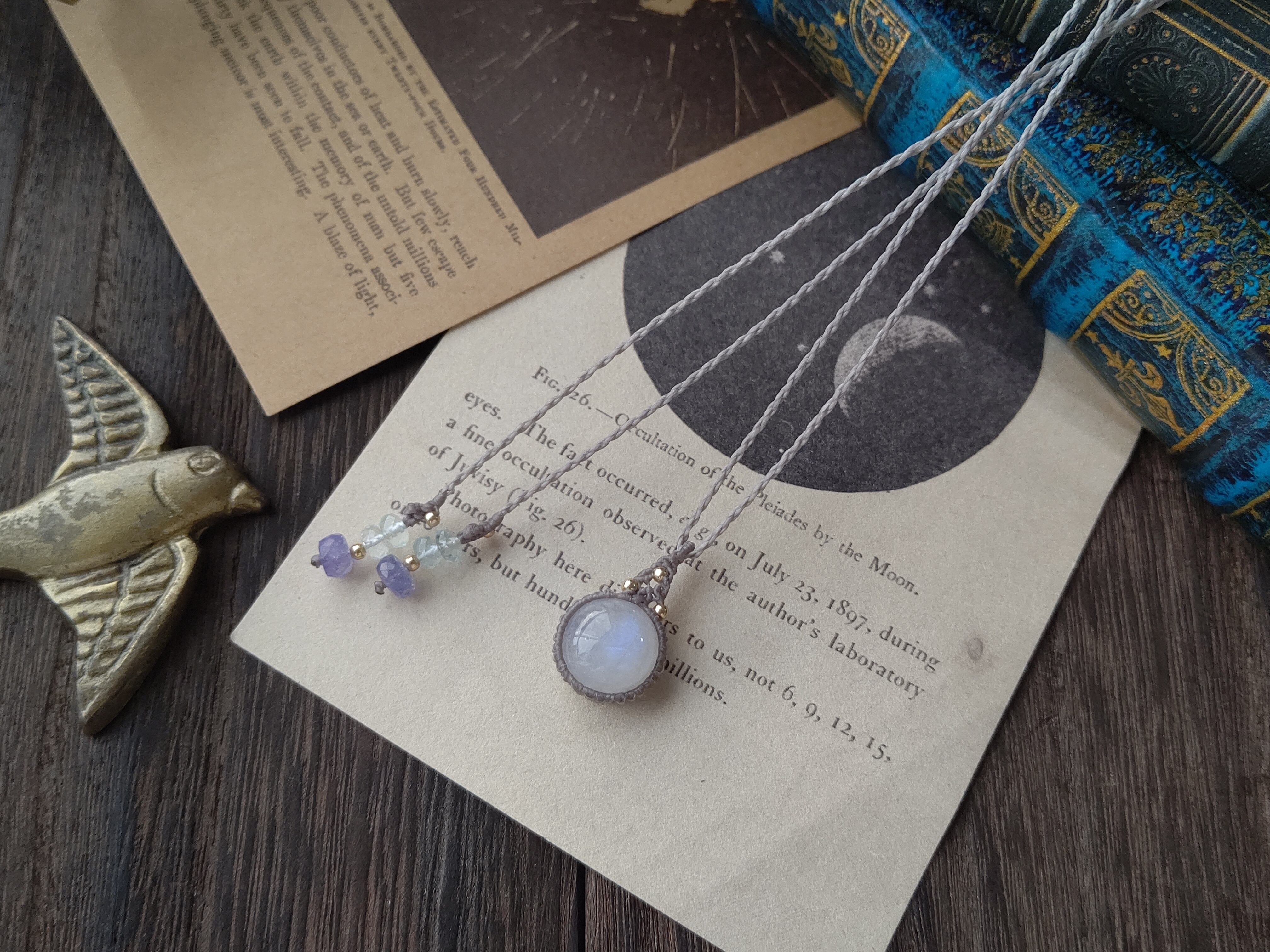 満月のようなころんとしたブルームーンストーン(ホワイトラブラドライト)を、カジュアルで日常使いしやすいペンダントに仕立てました。