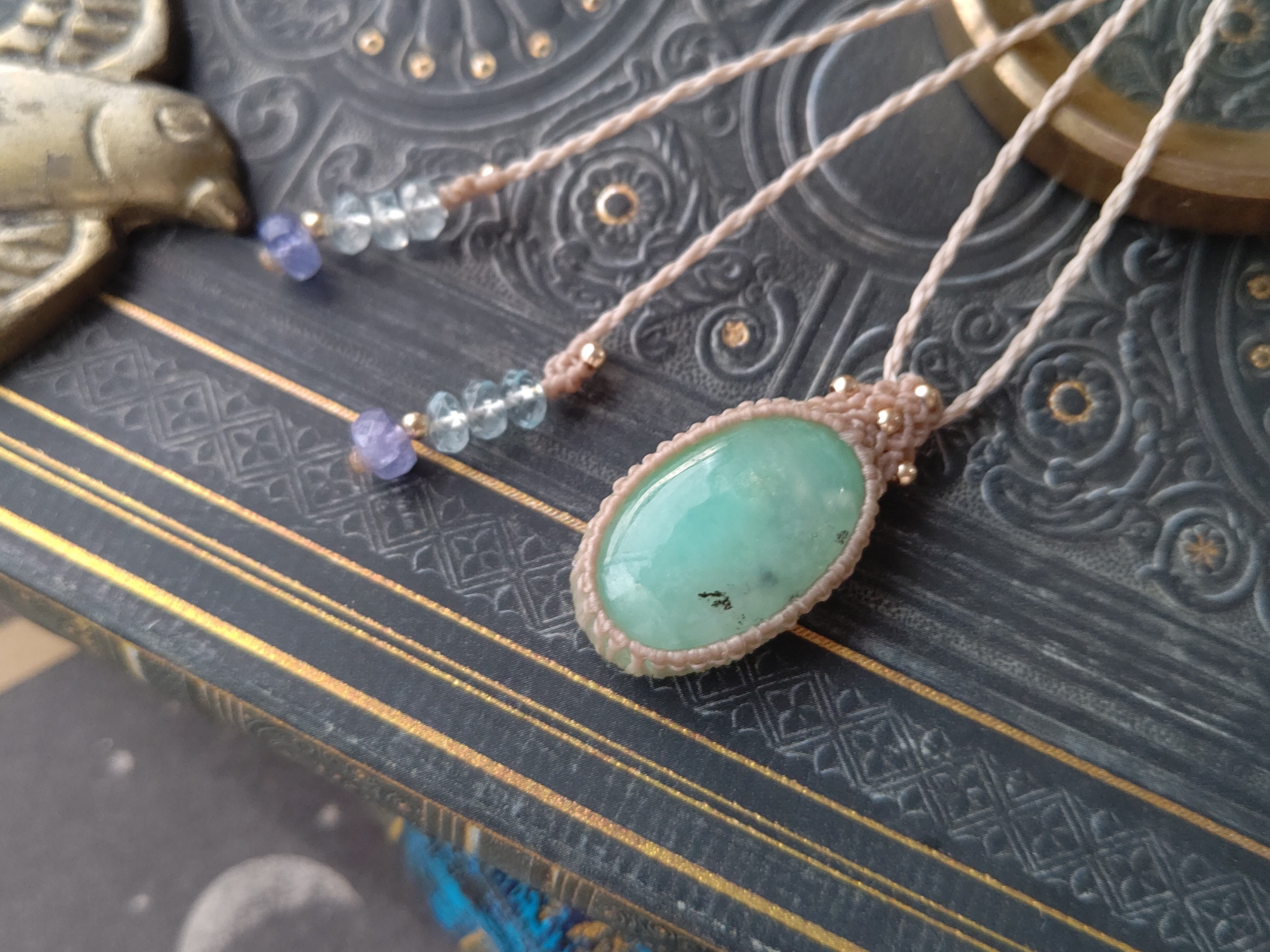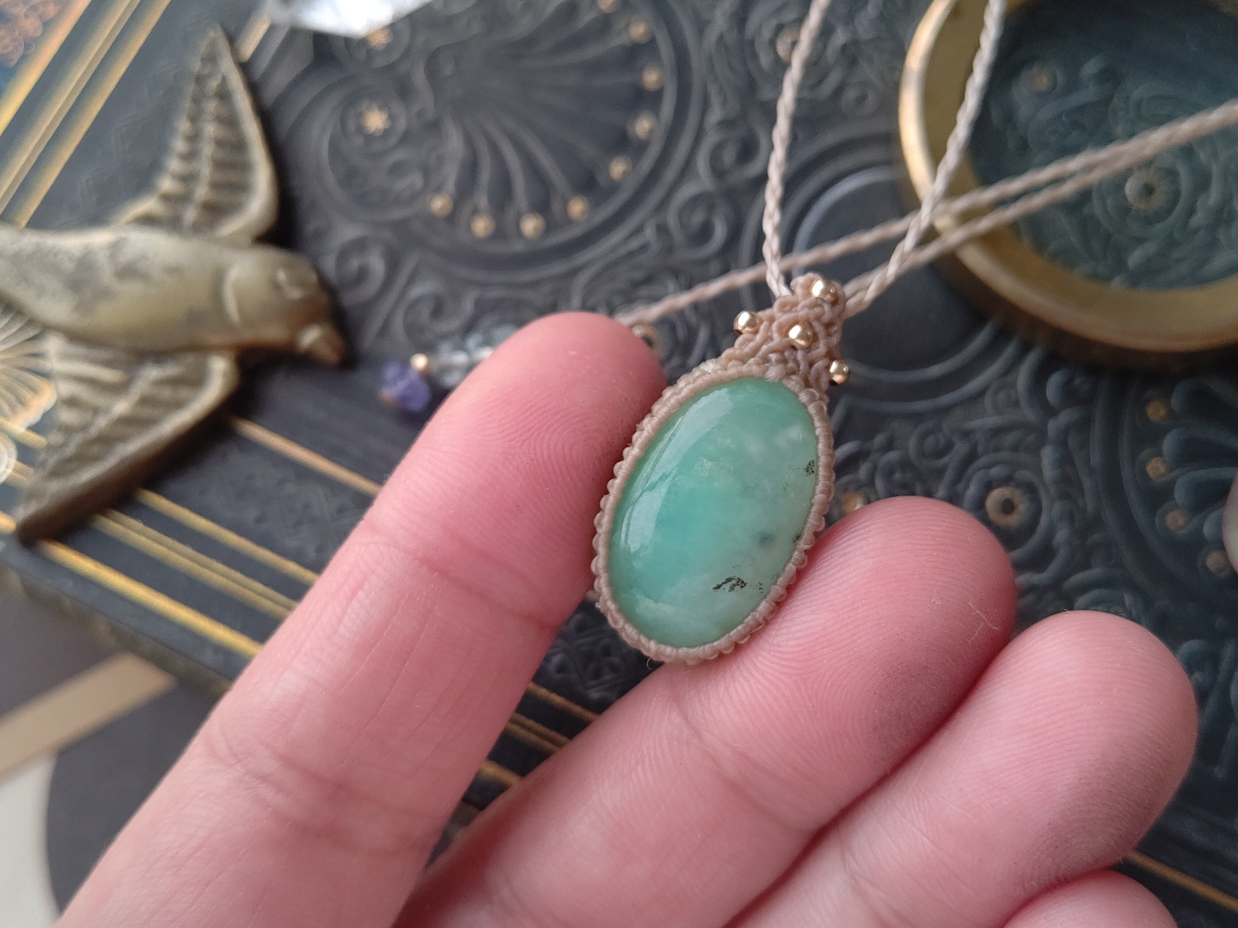 ふんわり翡翠色 クリソプレーズのマクラメペンダント/0.25mm仕上げ