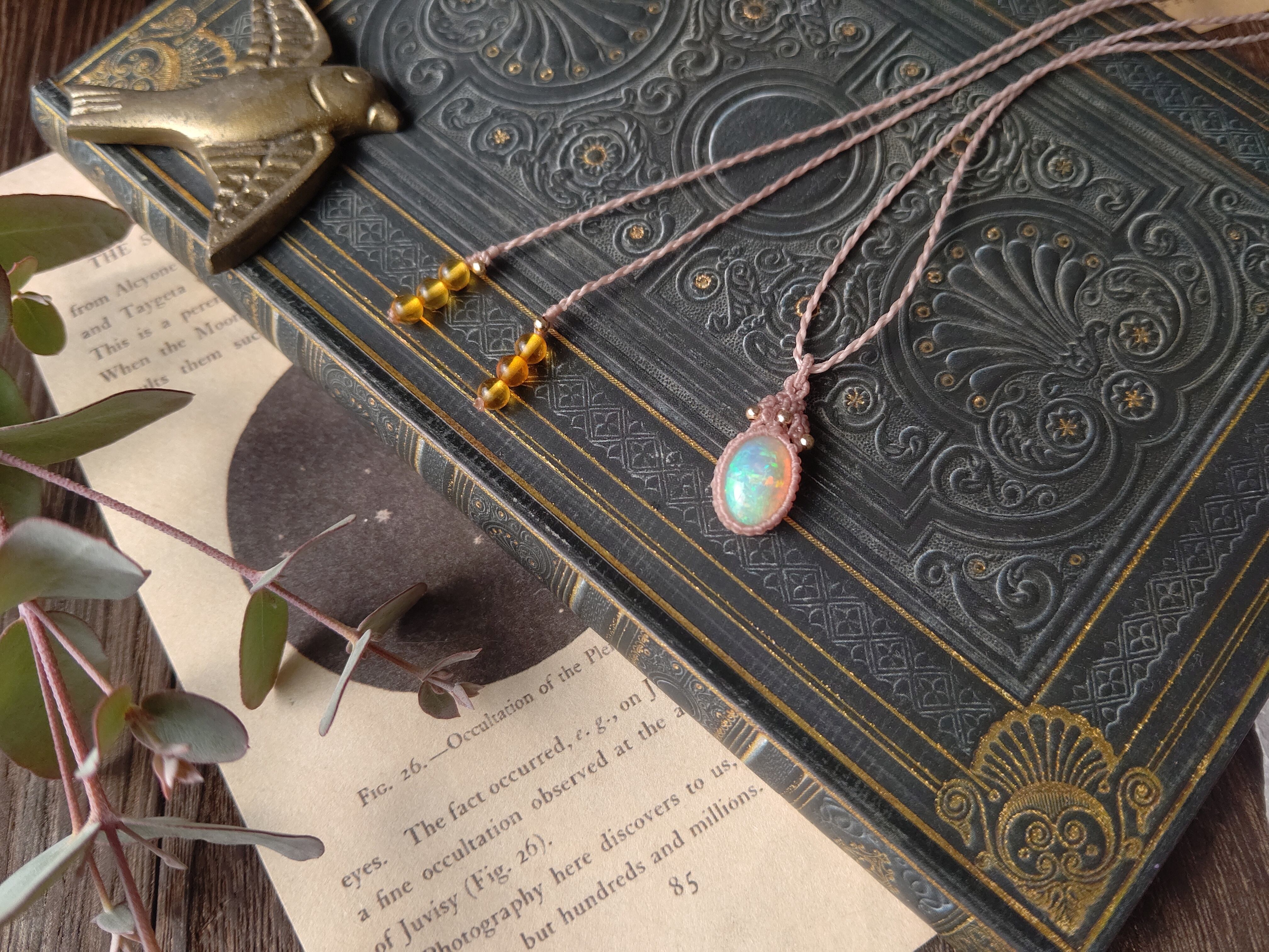 結び石にはバルティックアンバーを選びました。オパール自体がとても軽い為、紐や結び石に引っ張られて首に負担がかからないように、軽く美しい素材を選んでいます。