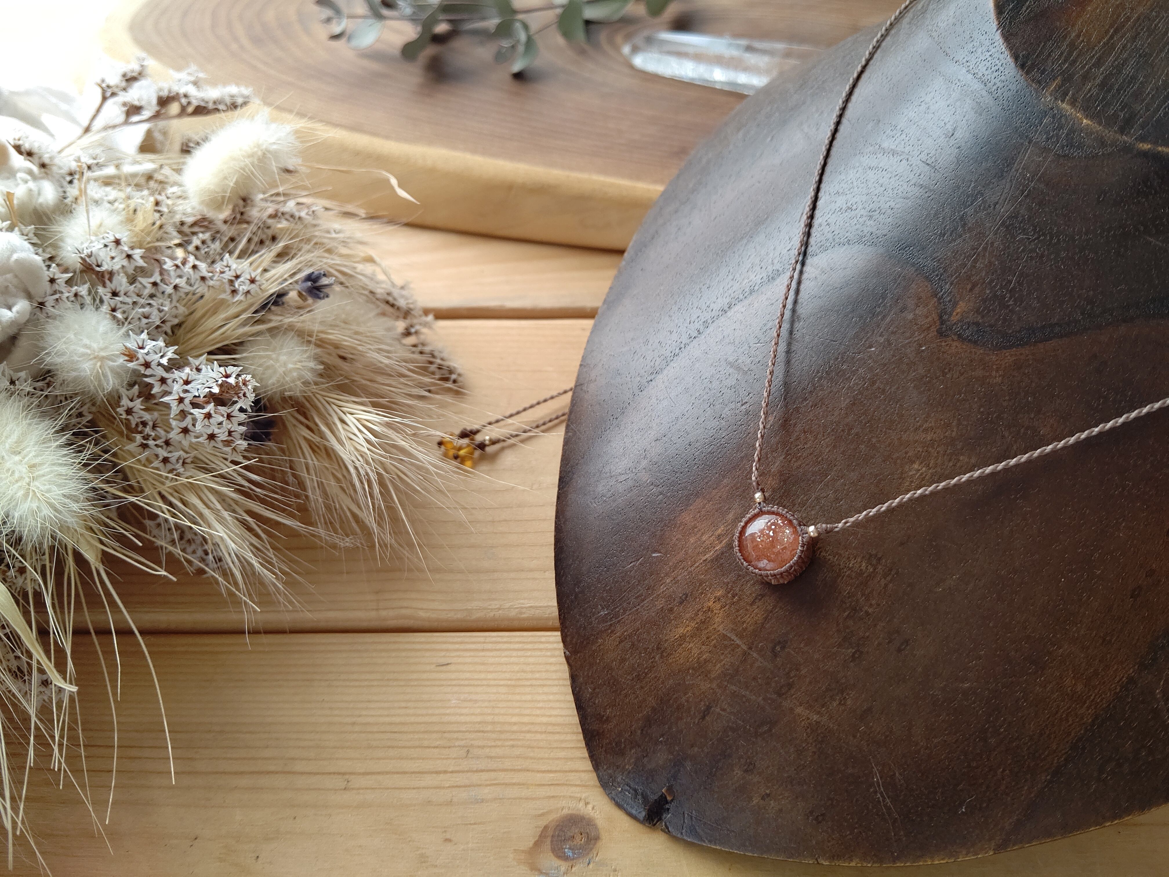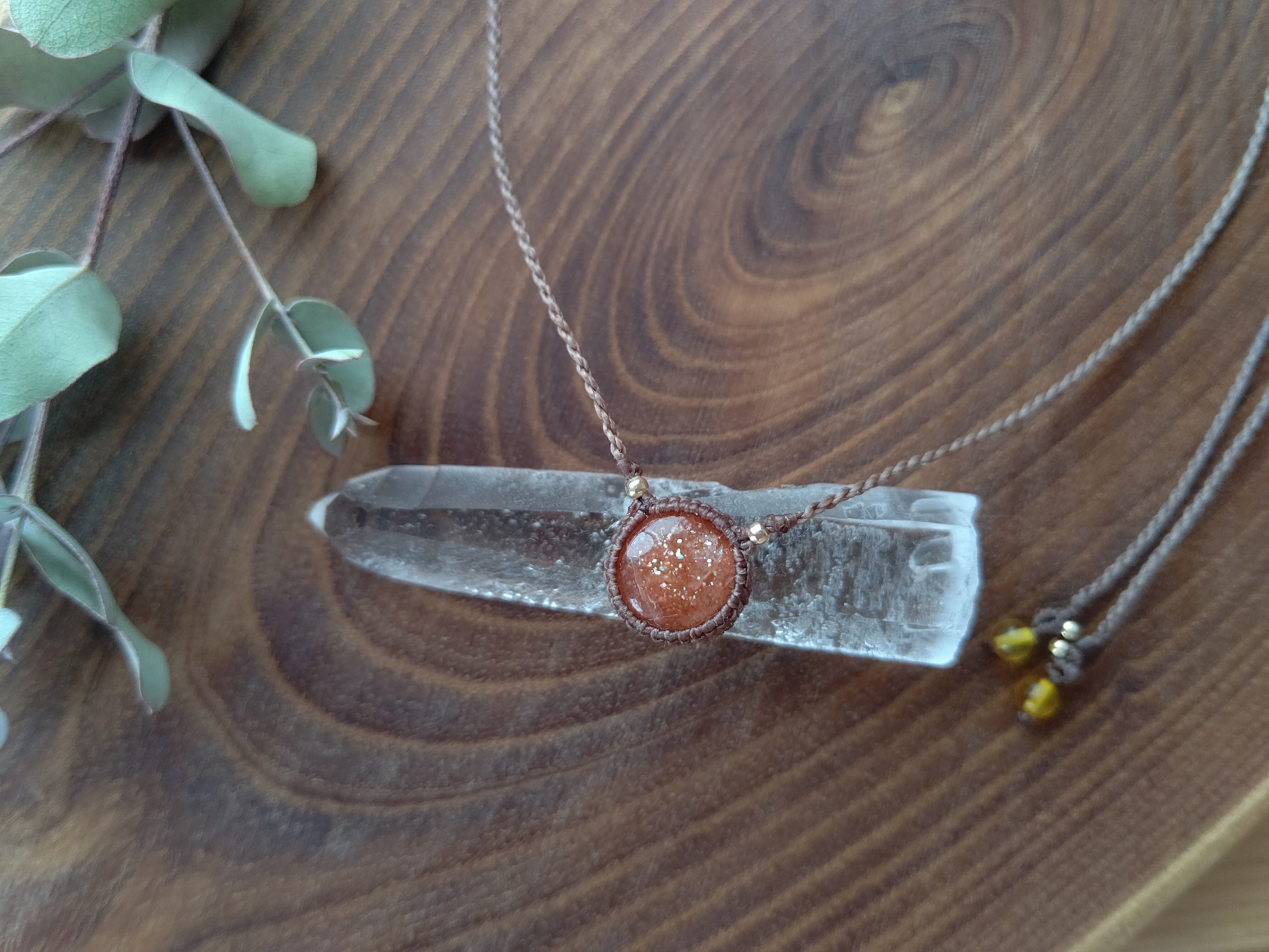 ぷっくりとしたフォルムがころんとしたサンストーンで、シンプルな編み込みのカジュアルなペンダントを製作しました。