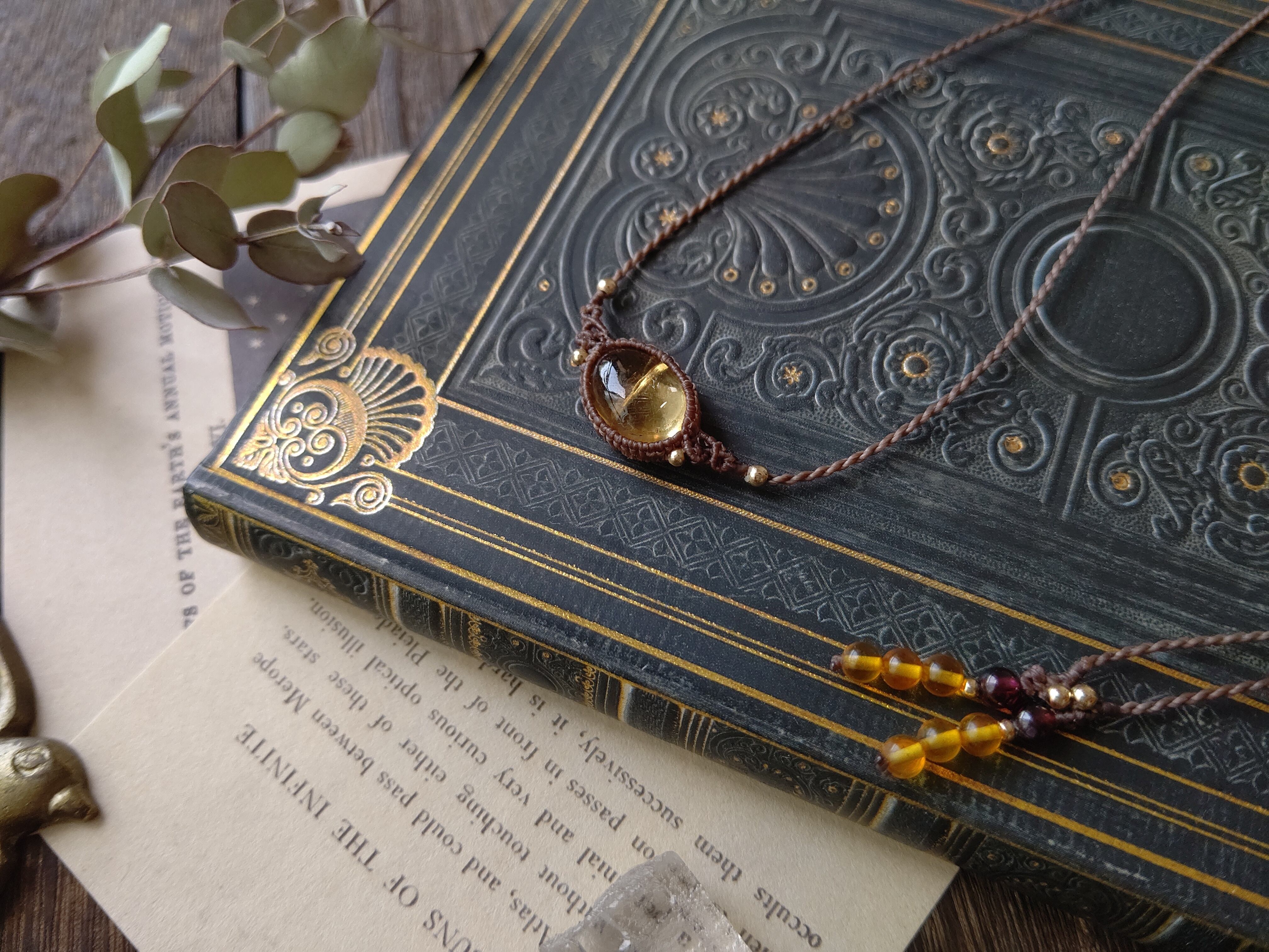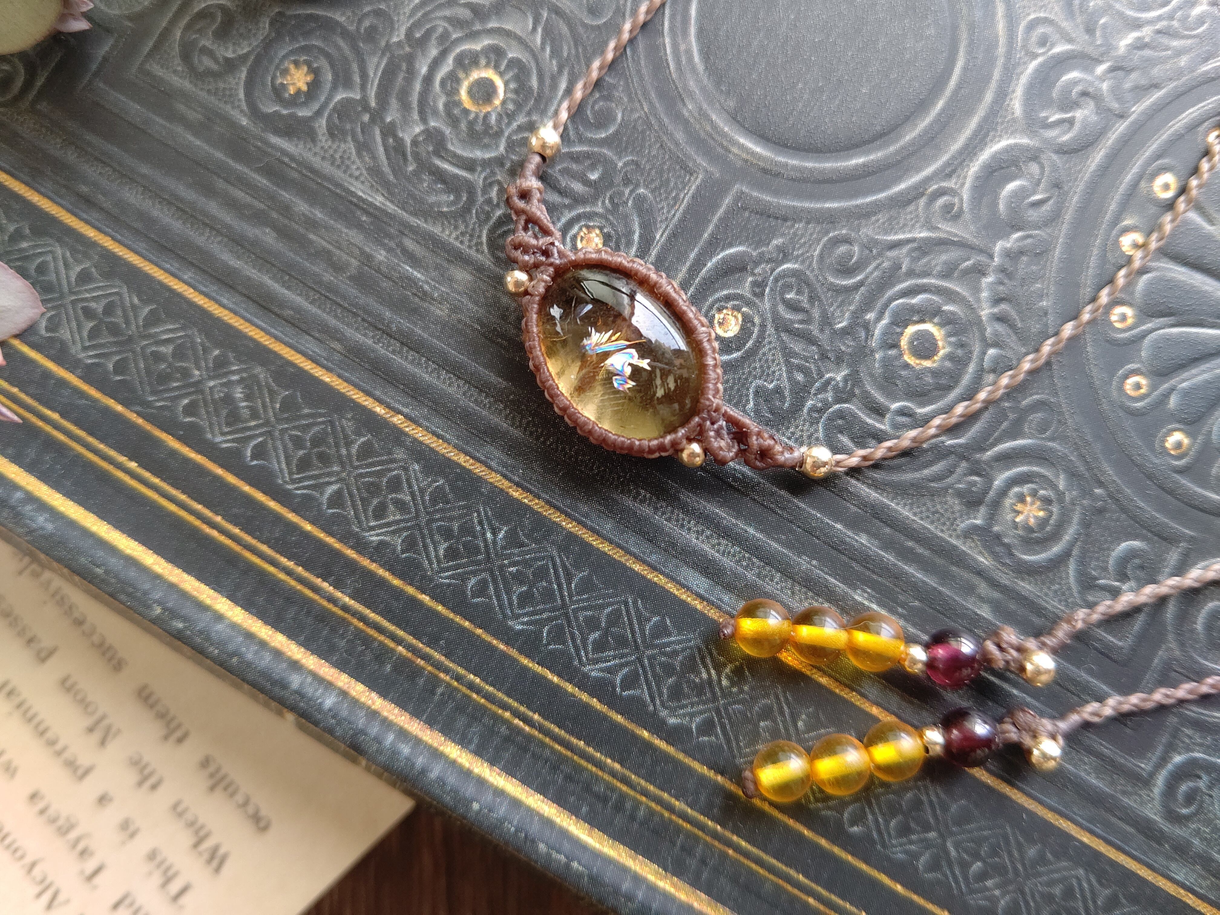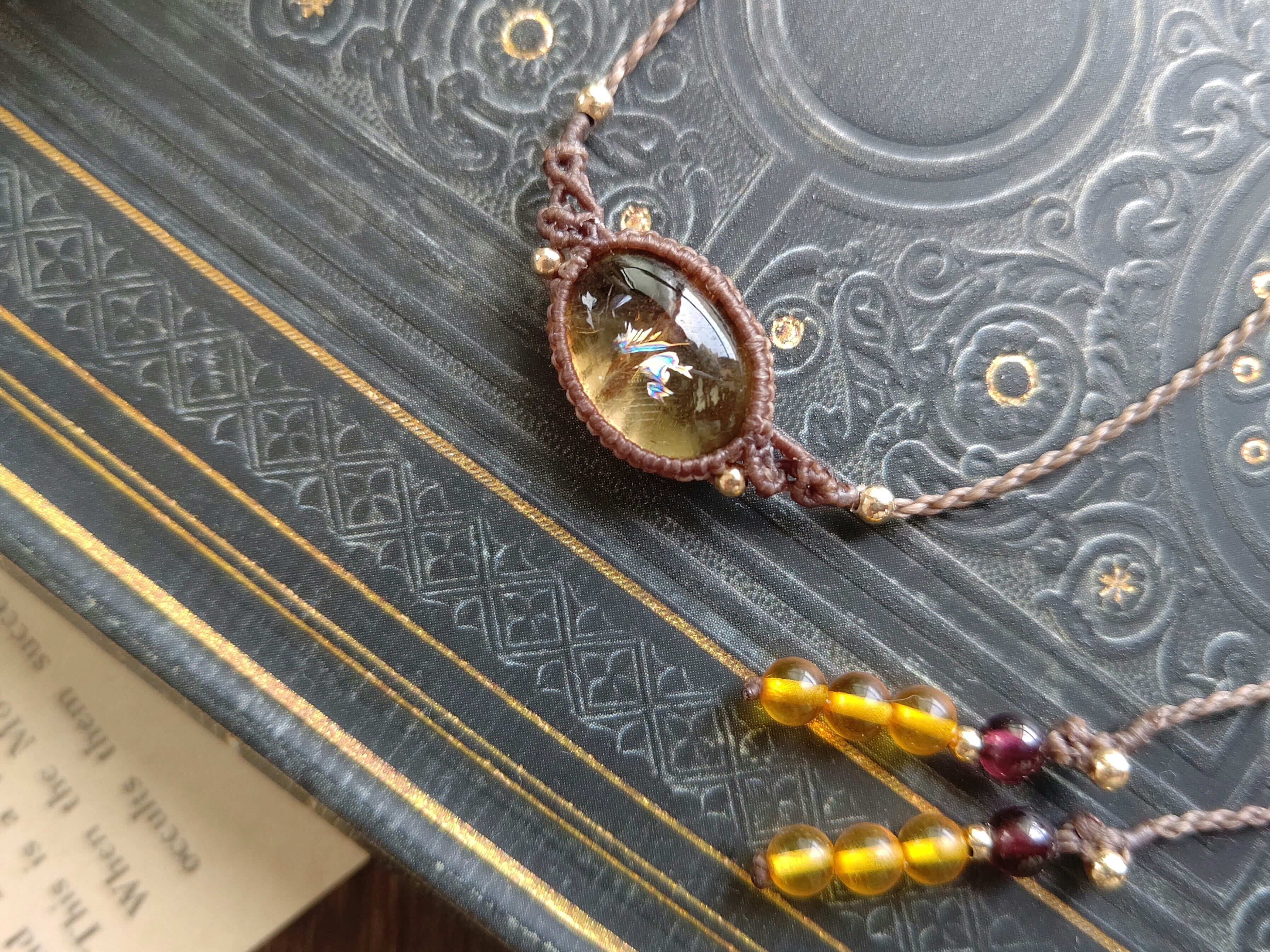 糸色はチョコレートブラウンで、明るすぎず暗すぎない肌色に合わせやすく、Tシャツなどのラフなコーディネートにも合わせやすい糸色です。結び石はヘソナイトガーネットにバルティックアンバーを組み合わせました。