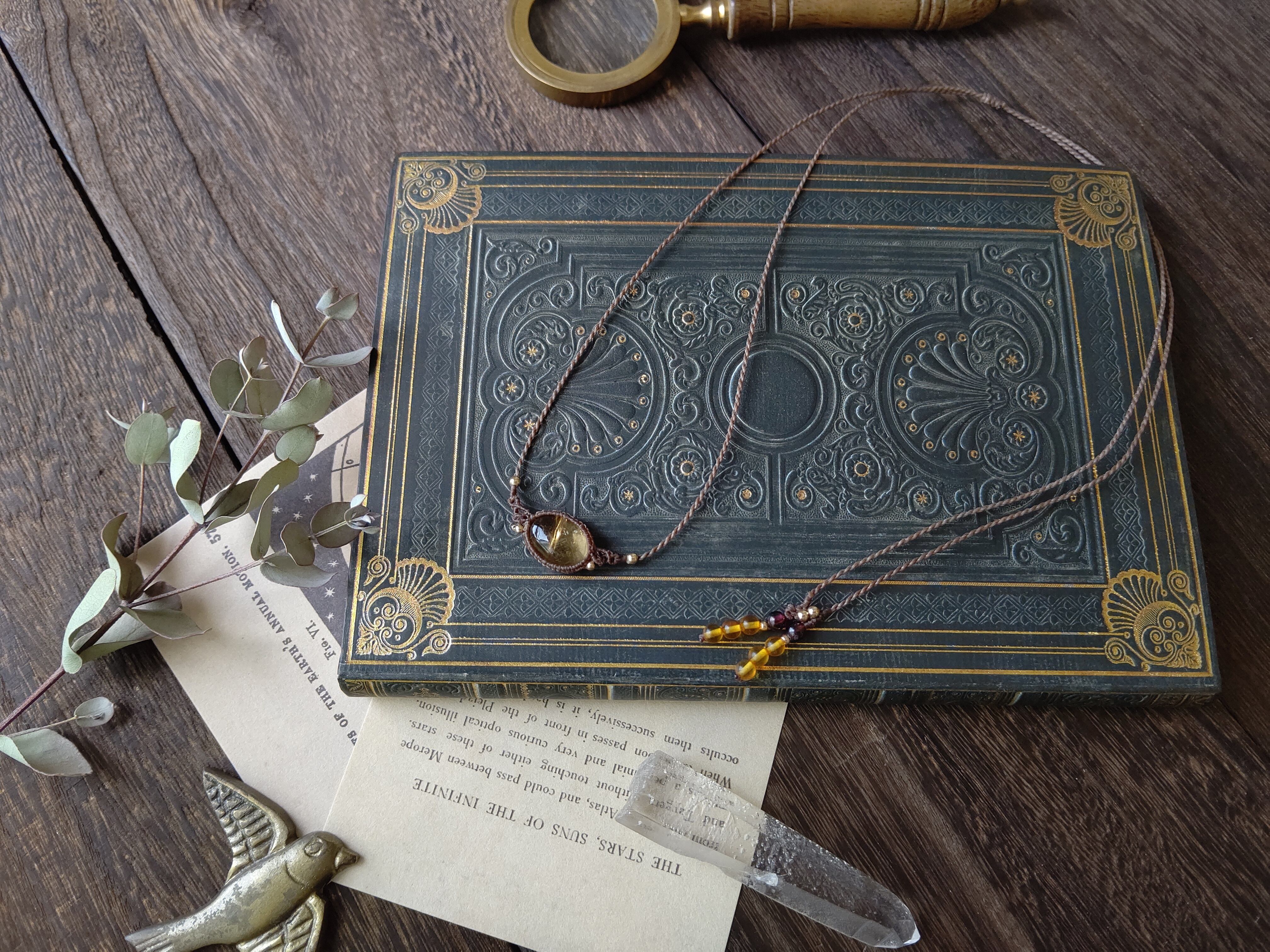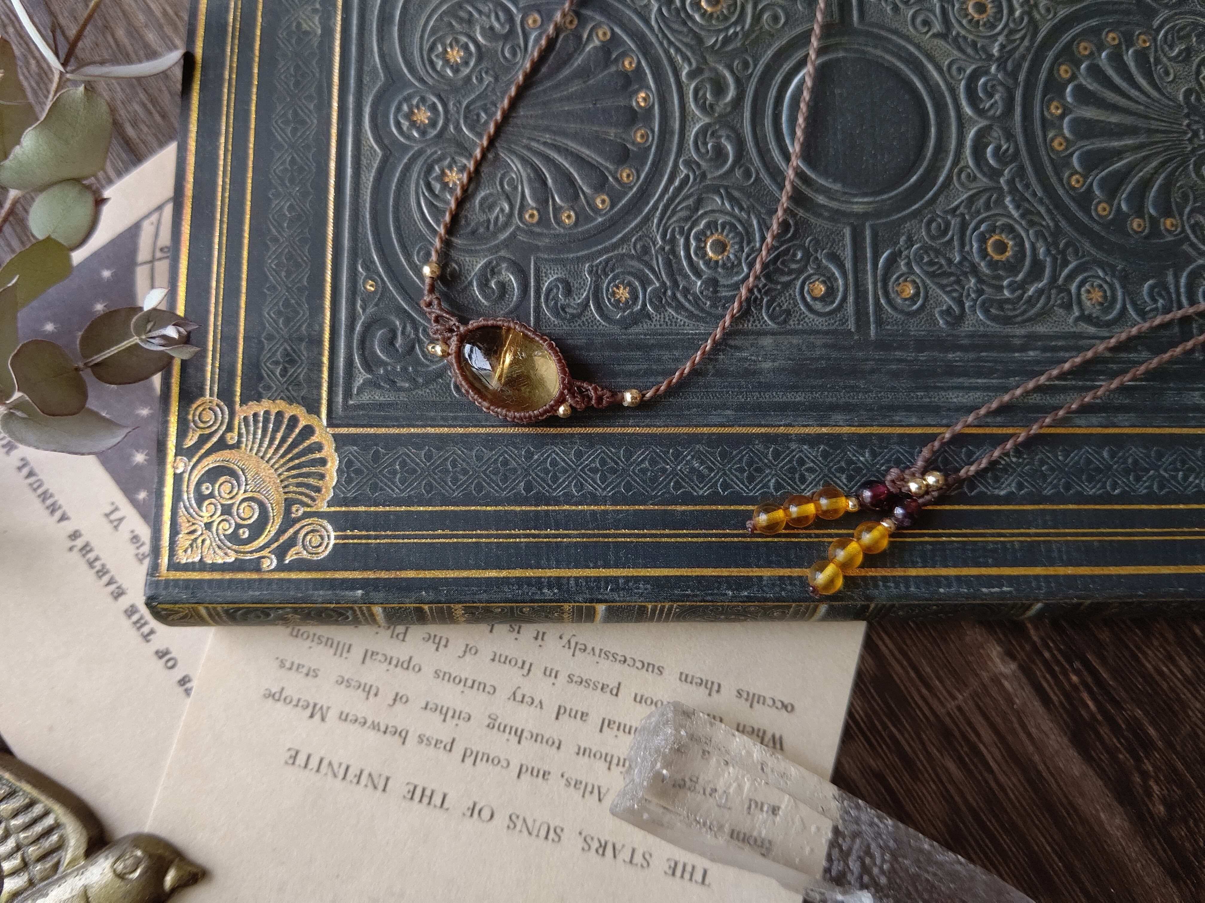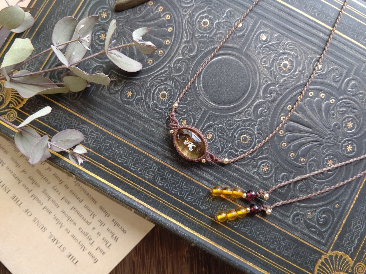 糸色はチョコレートブラウンで、明るすぎず暗すぎない肌色に合わせやすく、Tシャツなどのラフなコーディネートにも合わせやすい糸色です。結び石はヘソナイトガーネットにバルティックアンバーを組み合わせました。