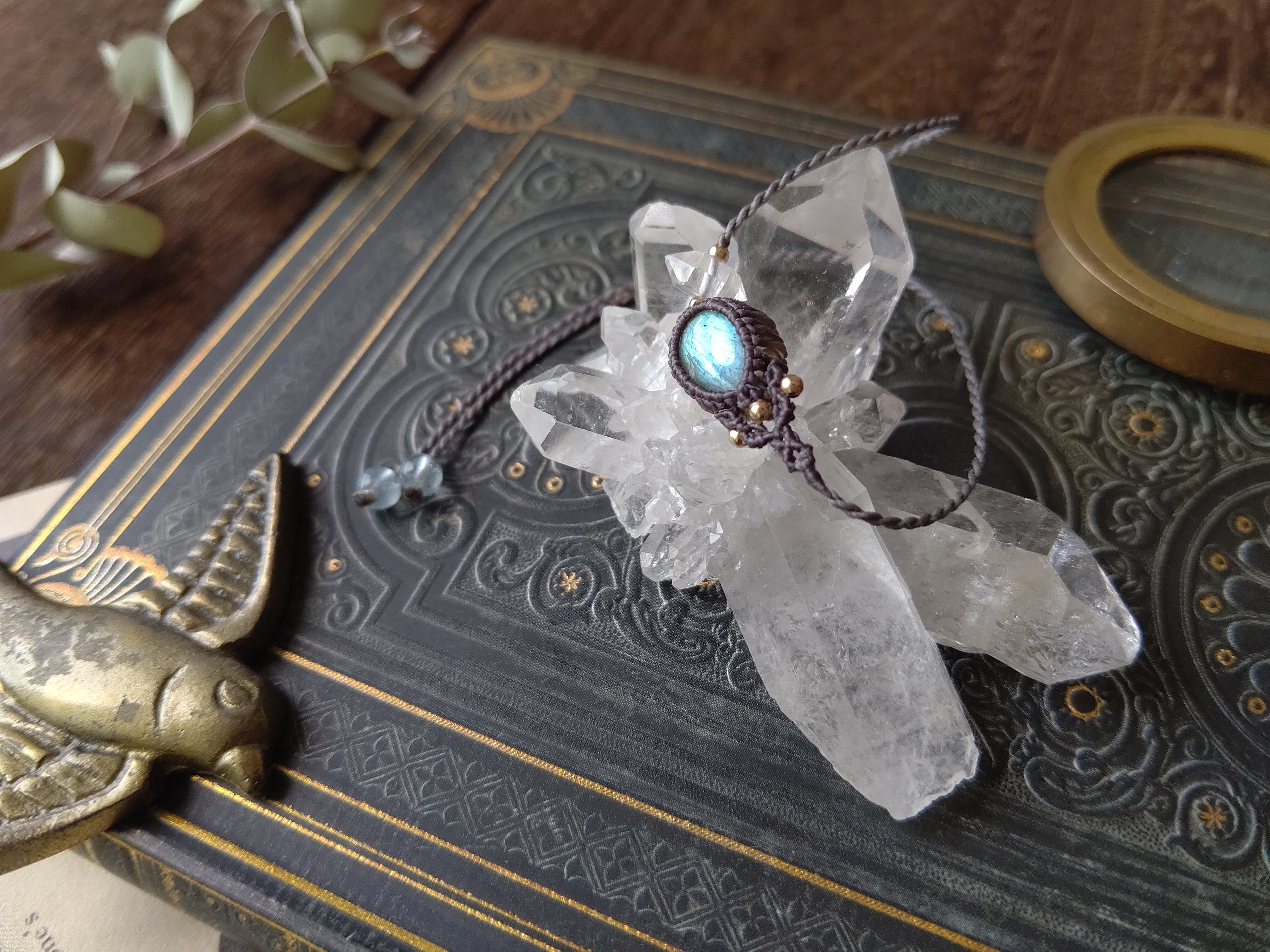 ハーキマーダイヤモンドの原石と雫の形のラブラドライトを組み合わせスッキリとした細身のデザインのアシンメトリーブレスレットを製作しました。