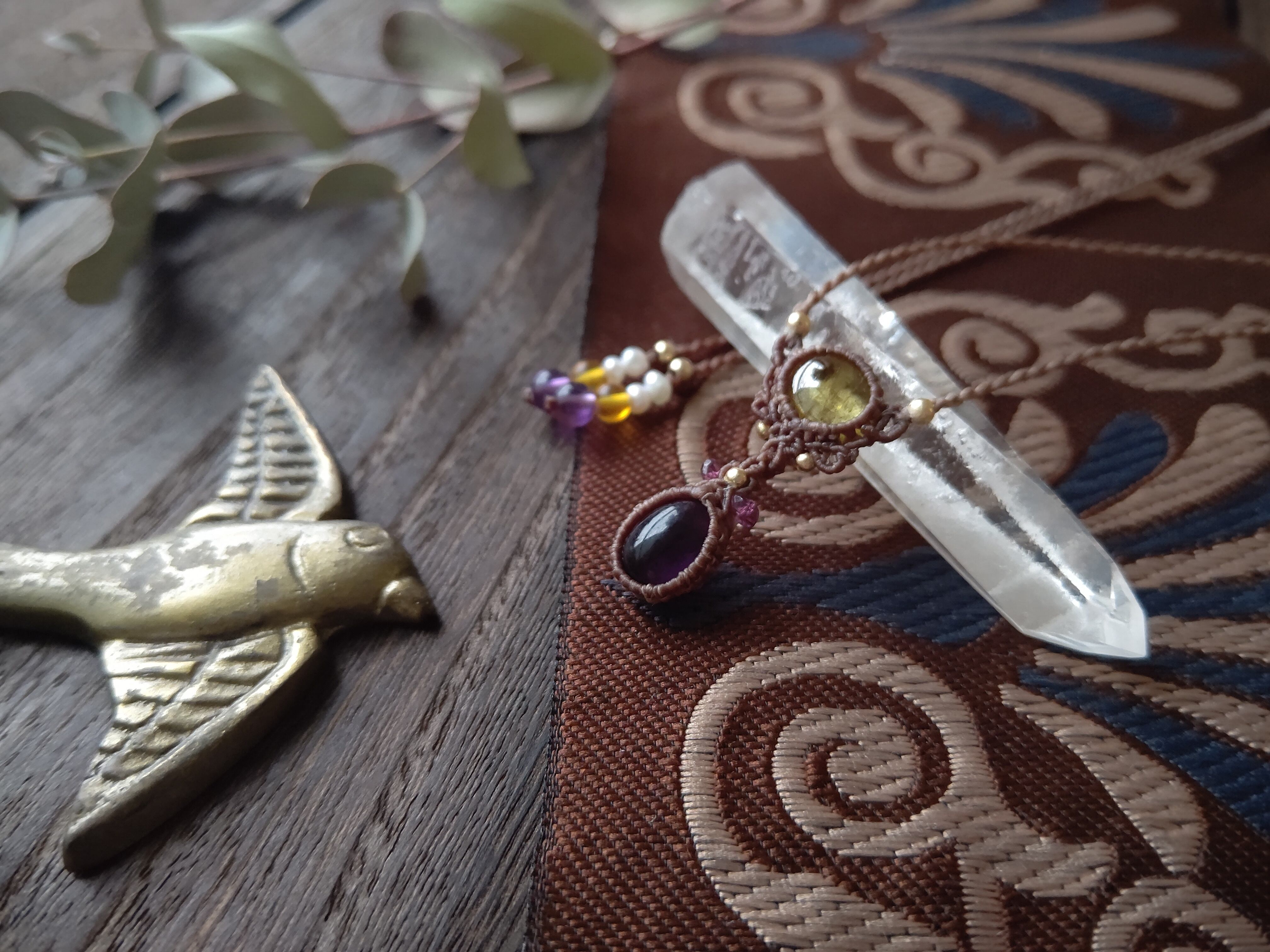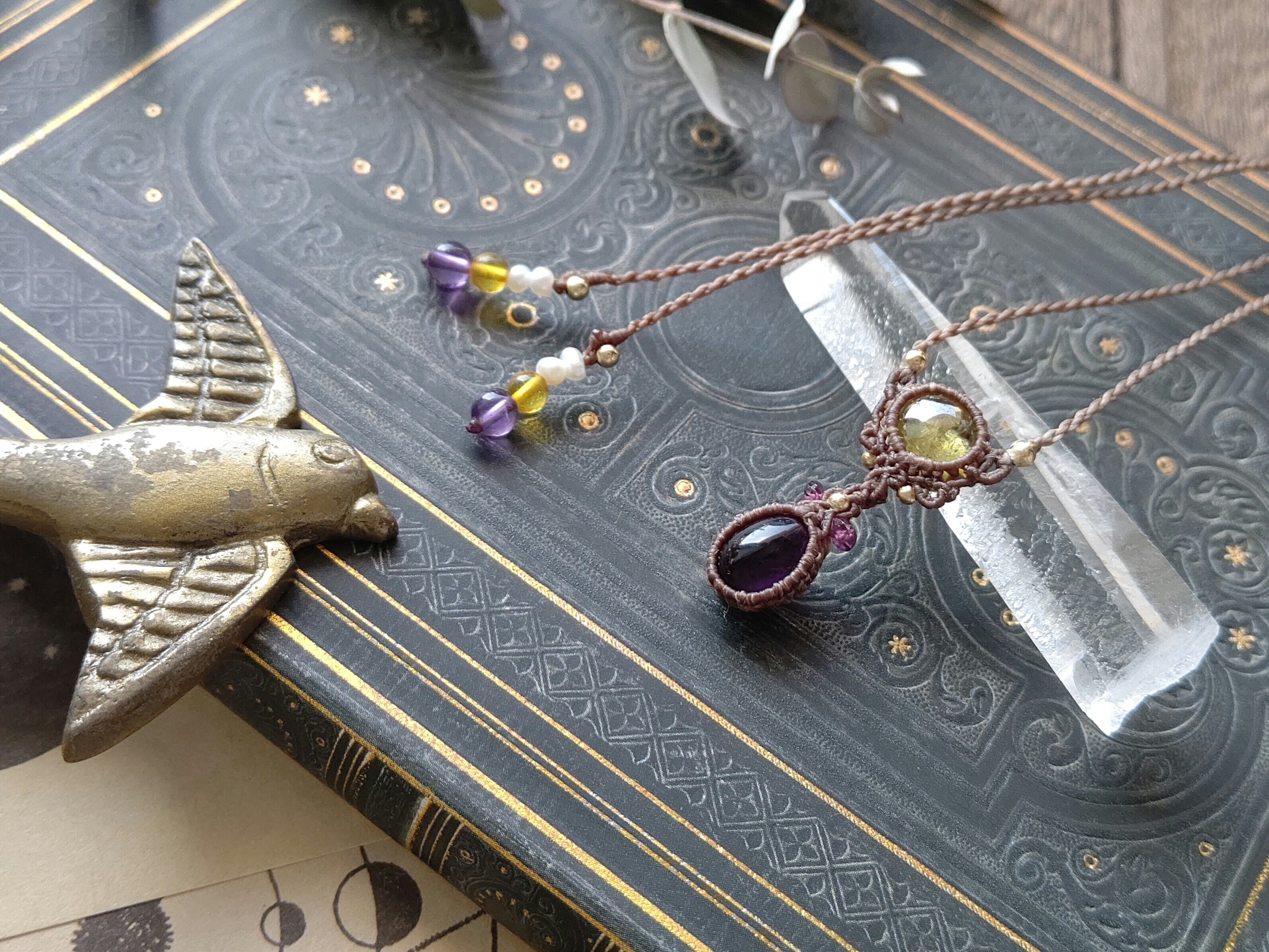 粒感と光沢の美しいグリーンイエローのスフェーンと雫型のアメジストのパープルのコントラストが面白い、少し個性的なタイプのシックなネックレスです。アメジストの方にロードライトガーネットの小さなビーズを編み込み、ささやかなアクセントにしています。
