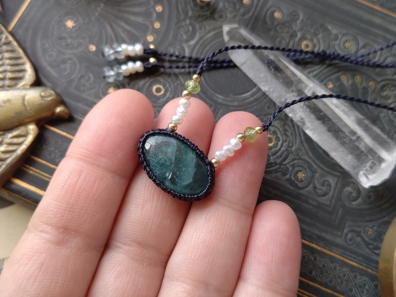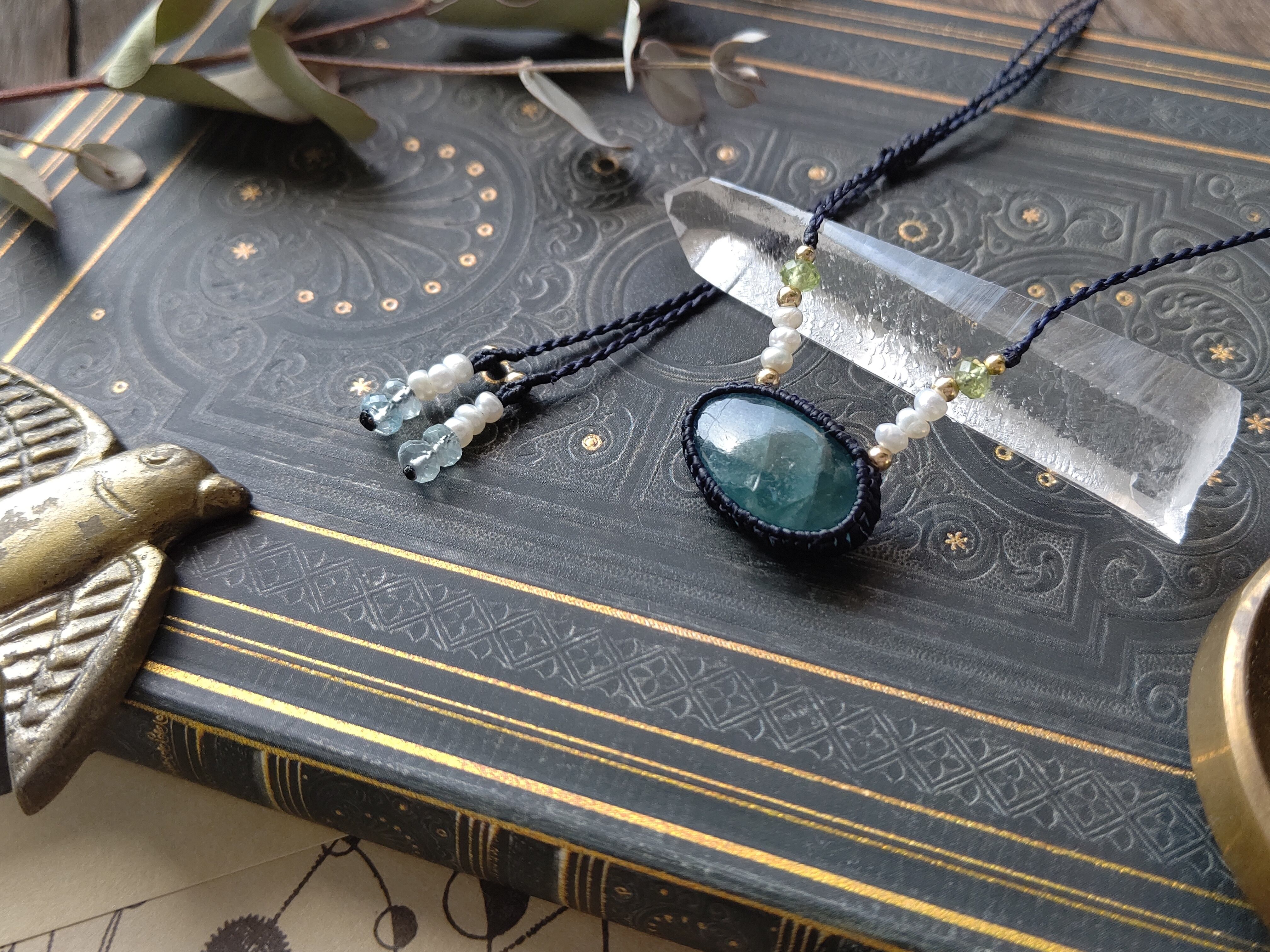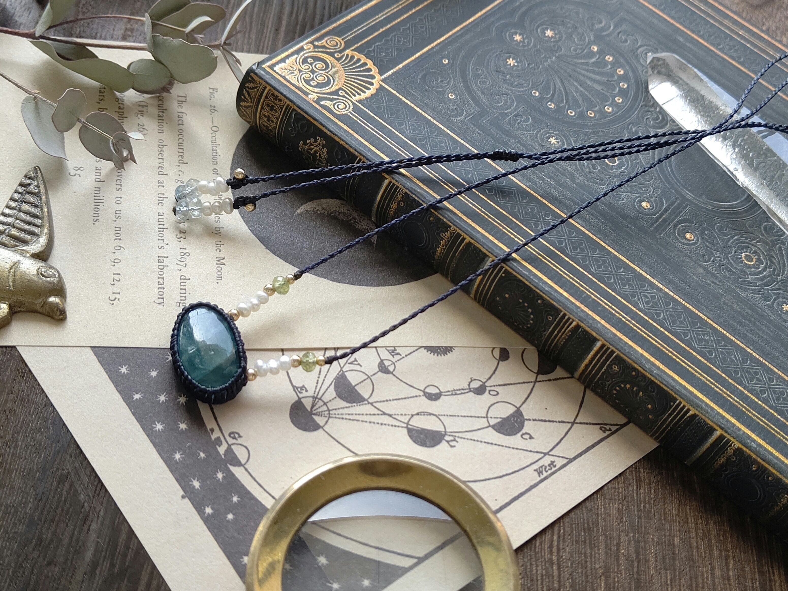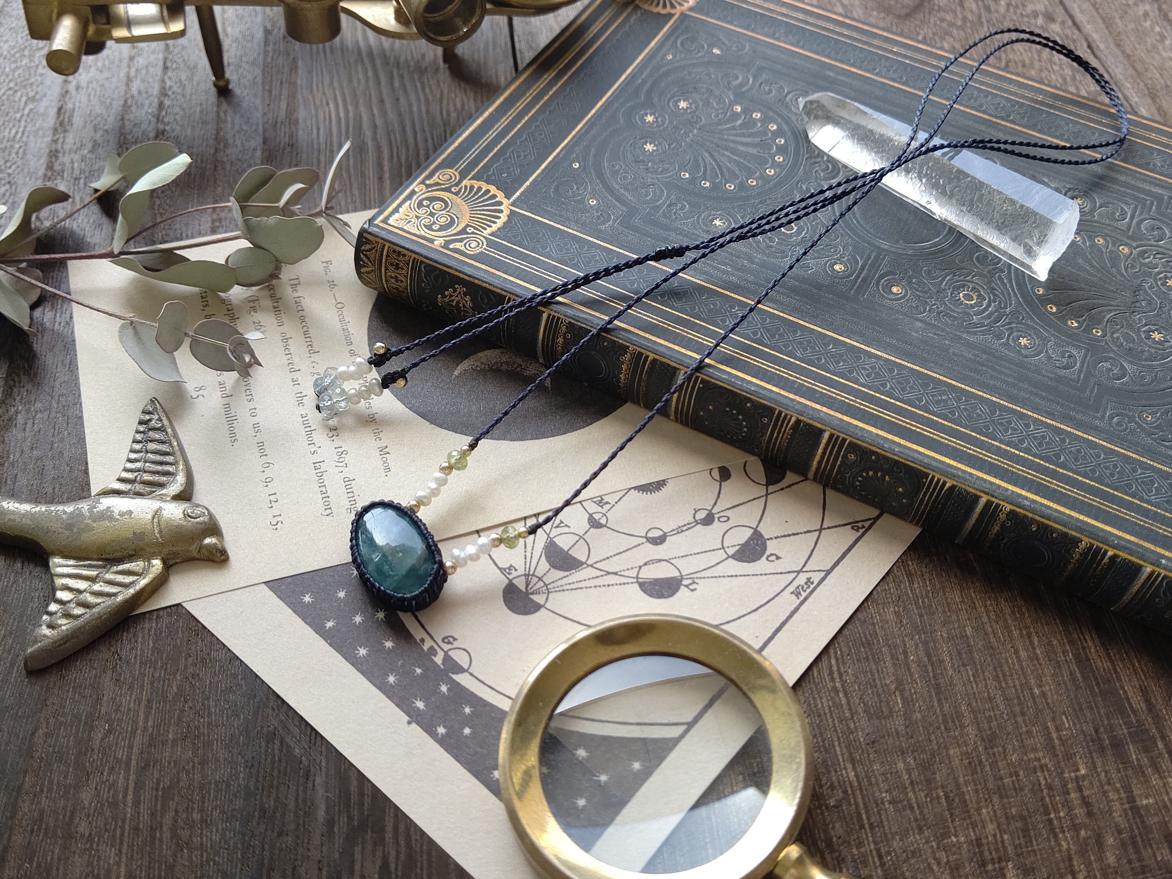 オールドストックの非加熱のアクアマリンの原石をルースに研磨したもので、ナチュラルな落ち着いた色合いが特徴です。内包クラックなどはございますが、涼やかなお色がとても印象的です。ネックレスの紐には淡水パールと宝石質ペリドットをあしらいました。結び石は淡水パールは宝石質のアクアマリンです。