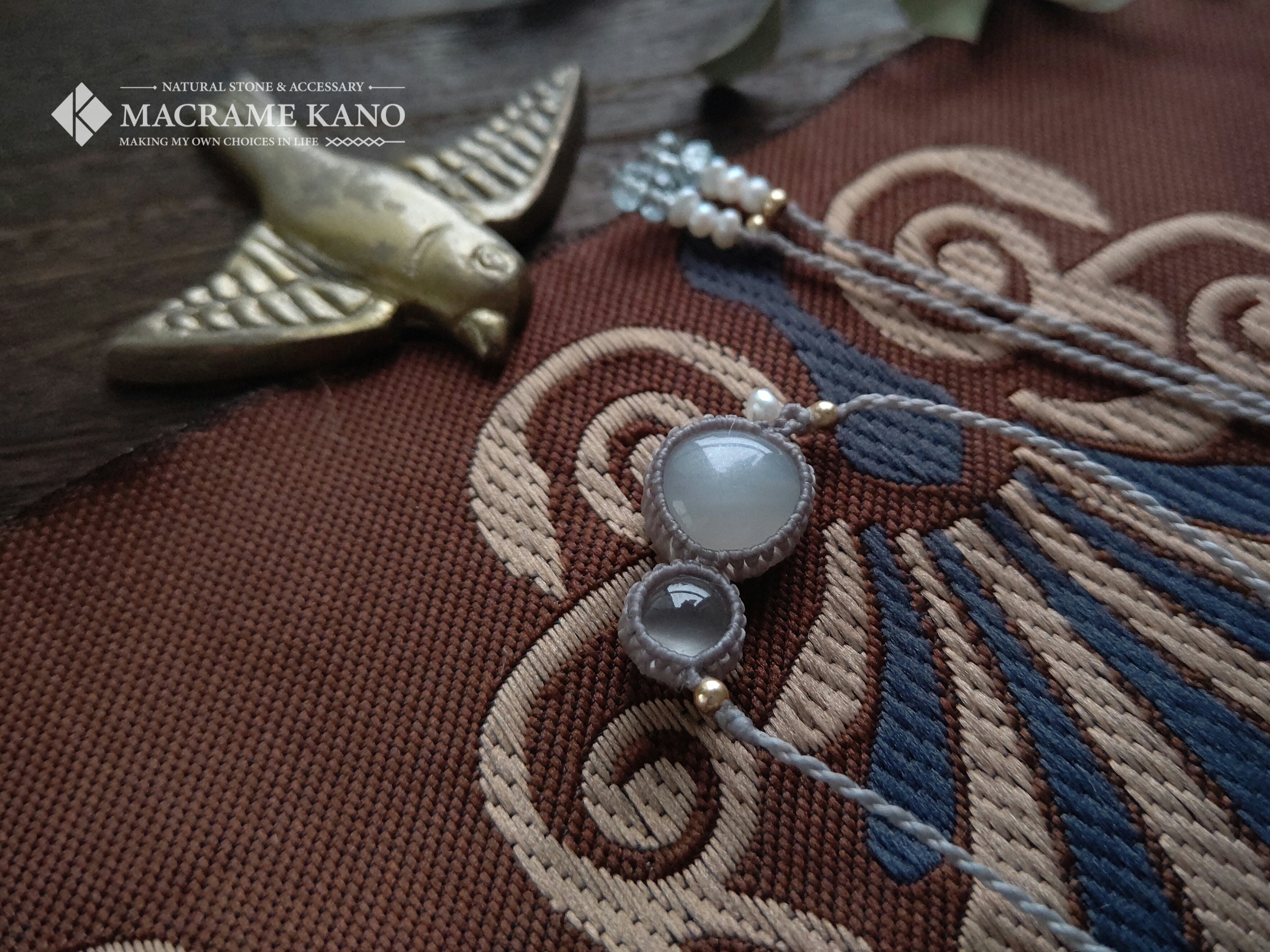 こちらの結び石は淡水パールと宝石質のアクアマリンで、軽さがあり着け心地もよいのでムーンストーンや糸色に合わせてセレクトしました。