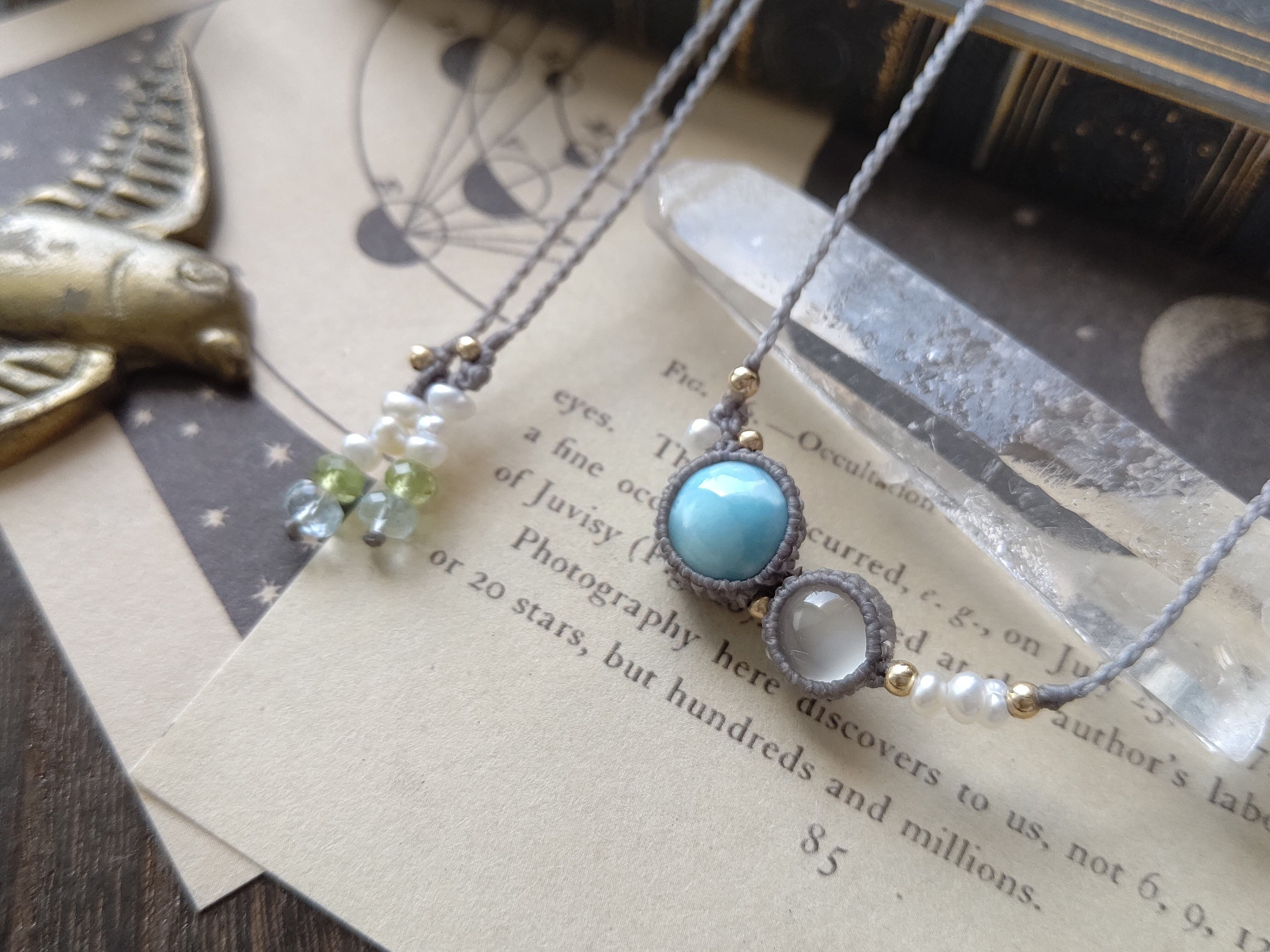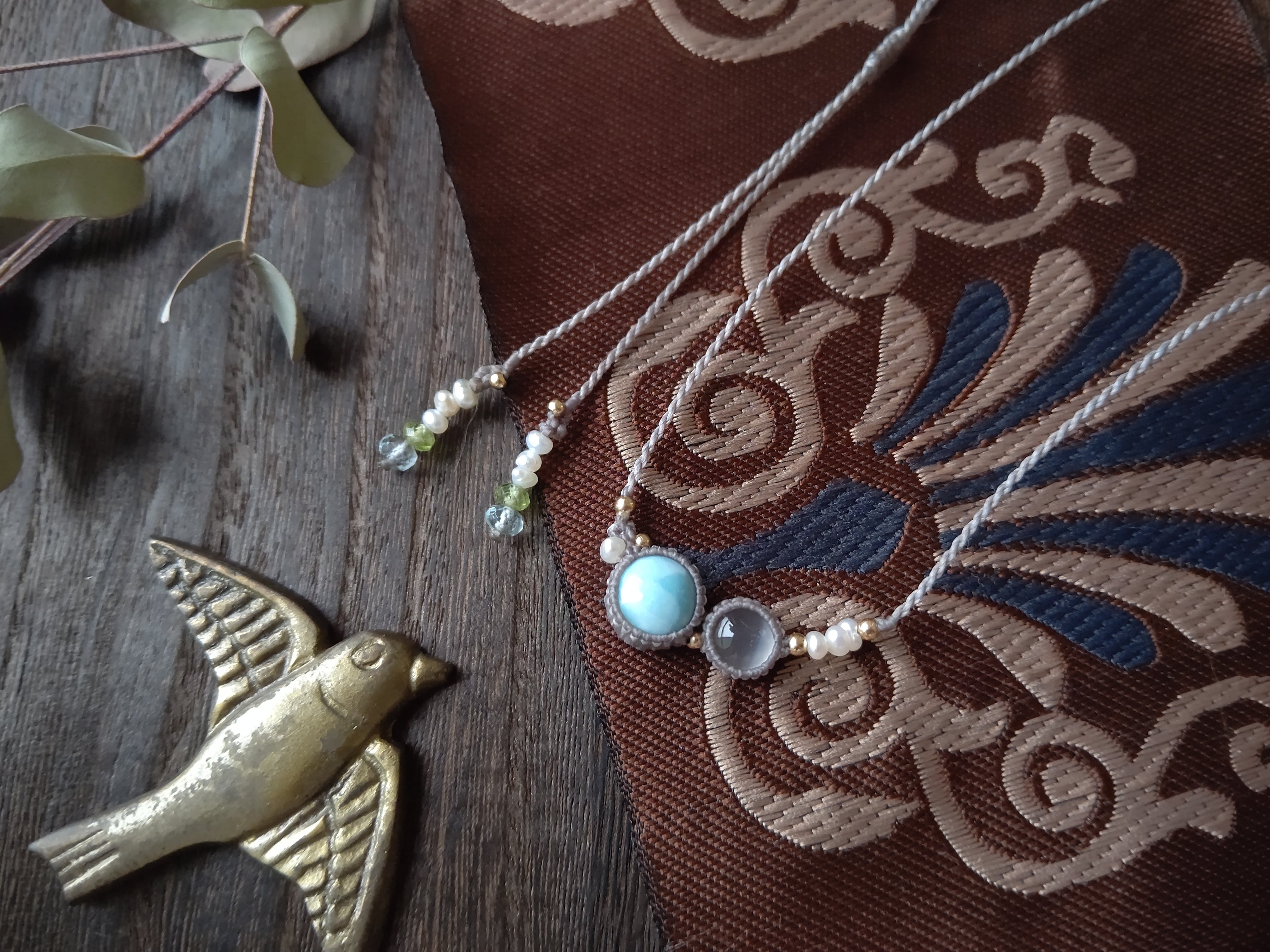 こちらの結び石は淡水パールと宝石質のアクアマリンとペリドットで、軽さがあり着け心地もよいのでラリマーとムーンストーンや糸色に合わせてセレクトしました。