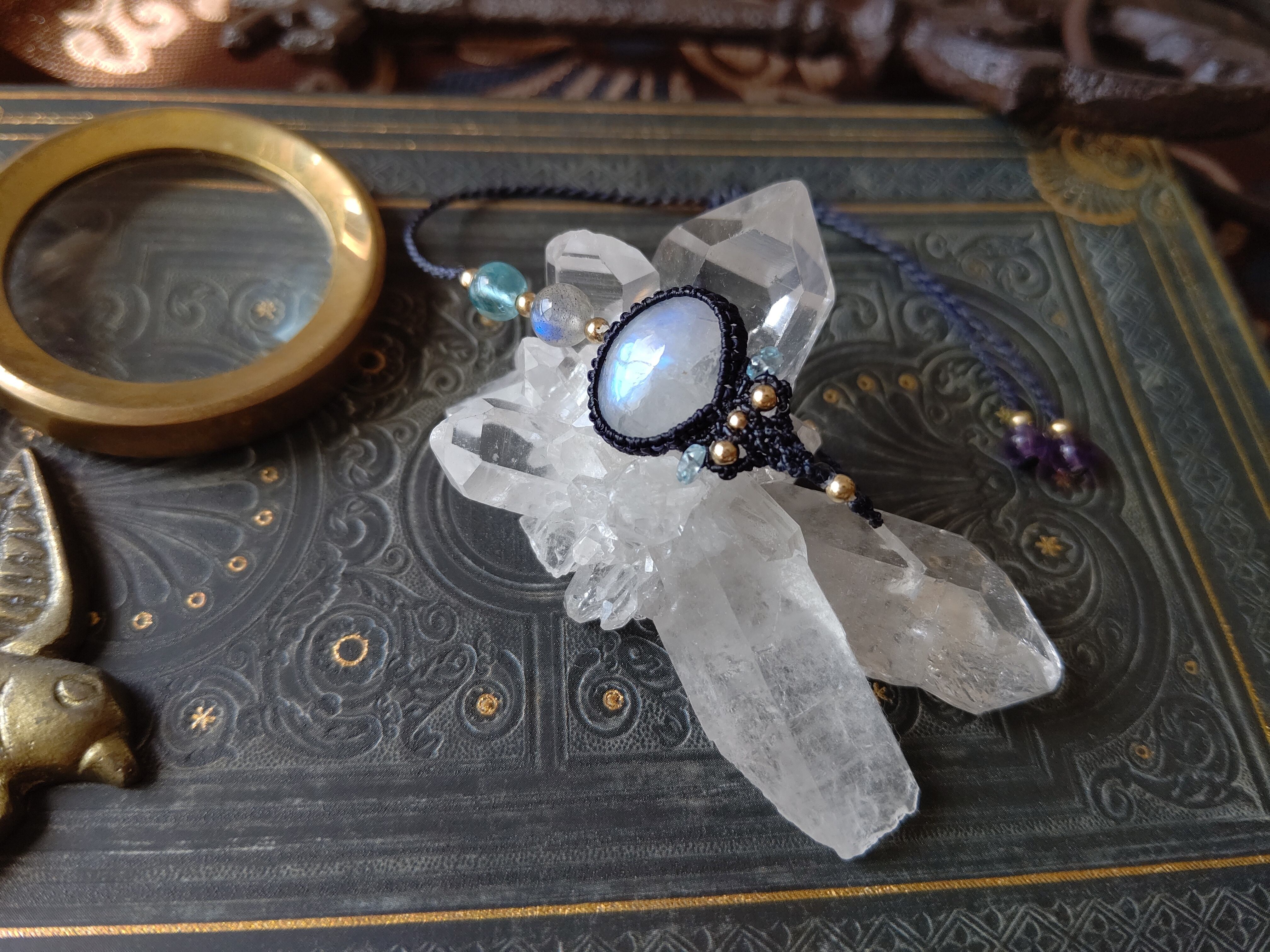 0.25mmの極細のダークネイビーの糸でしっかりと編み込んでいるので、全体的にシックな印象です。天然石ビーズは宝石質のラブラドライト、宝石質のアパタイトをあしらいました。編み込みには小さめですが、宝石質のブルージルコンを編み込んでいます。