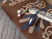 結び石はアイオライトサンストーンより軽くなるようにし、様々な色彩の天然石ビーズをあしらいました。マルチカラーの宝石質のトルマリン、ペリドット、アメジスト、そして淡水パールです。