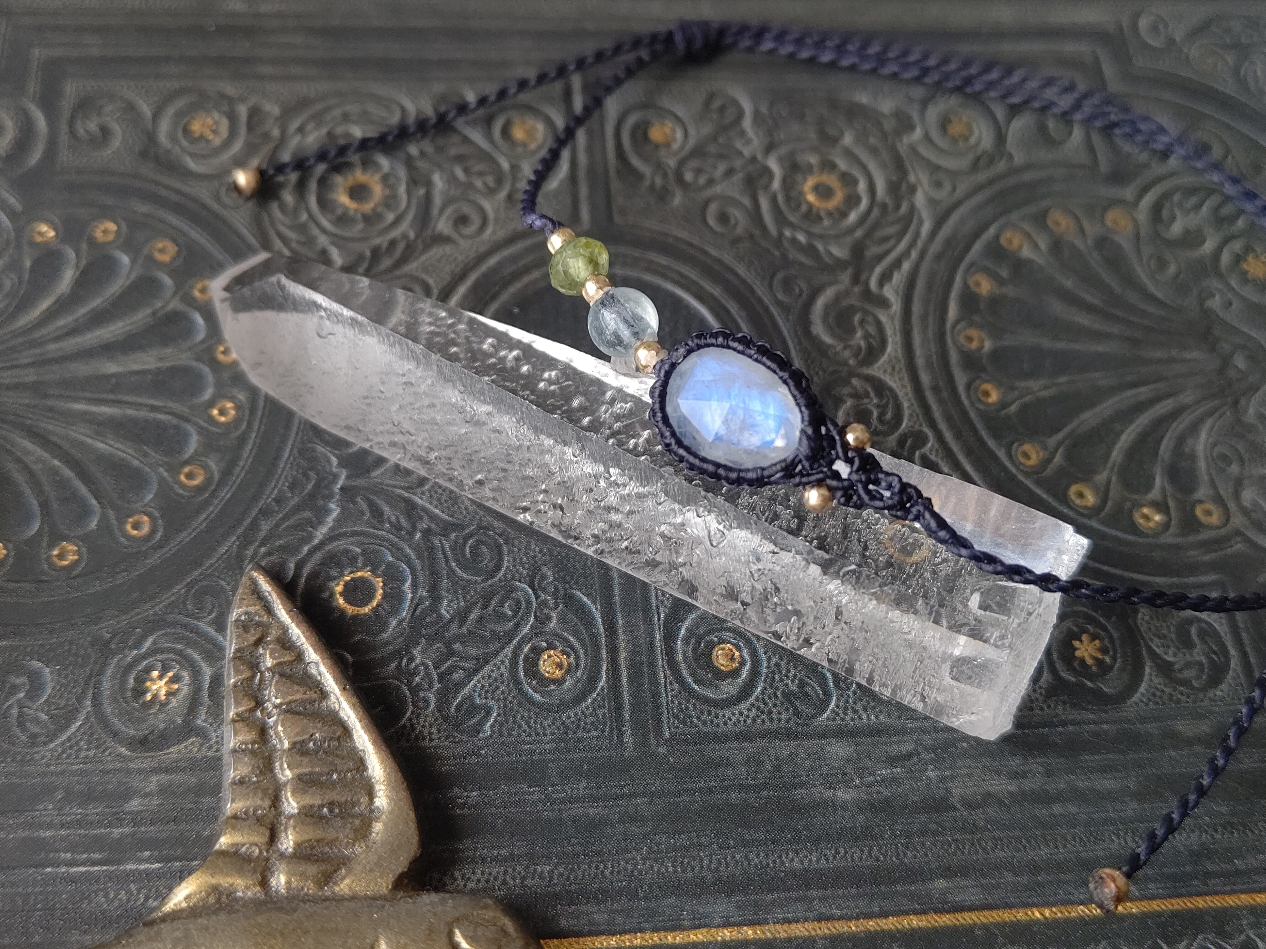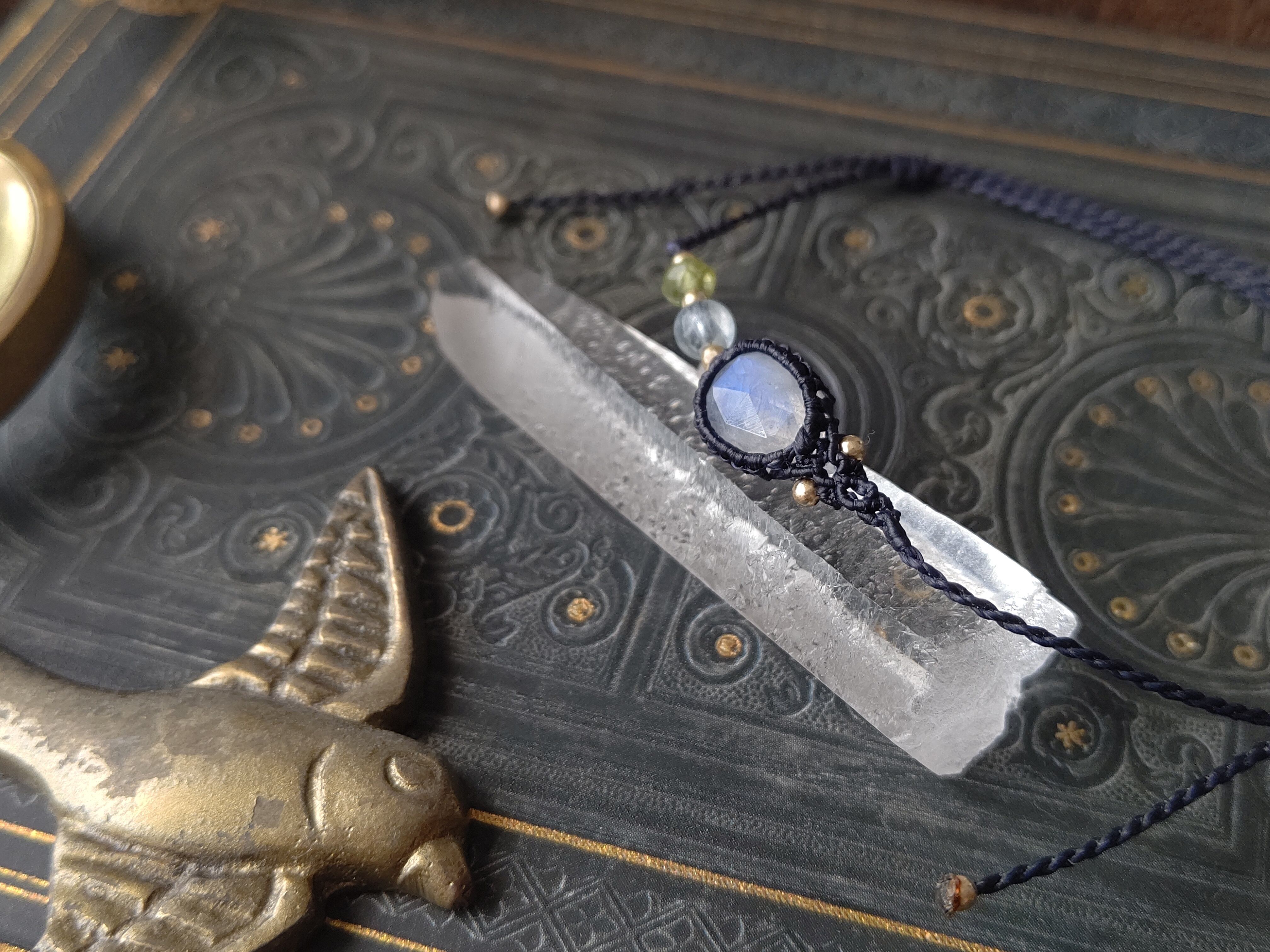 やや透明感のある石質に神秘的なブルーのシラーがふわっと浮かび上がるとても美しいルースです。表面がローズカットされていますので、光の当たる角度でキラキラと輝きます。片側には宝石質のペリドットとアクアマリンを組み合わせました。