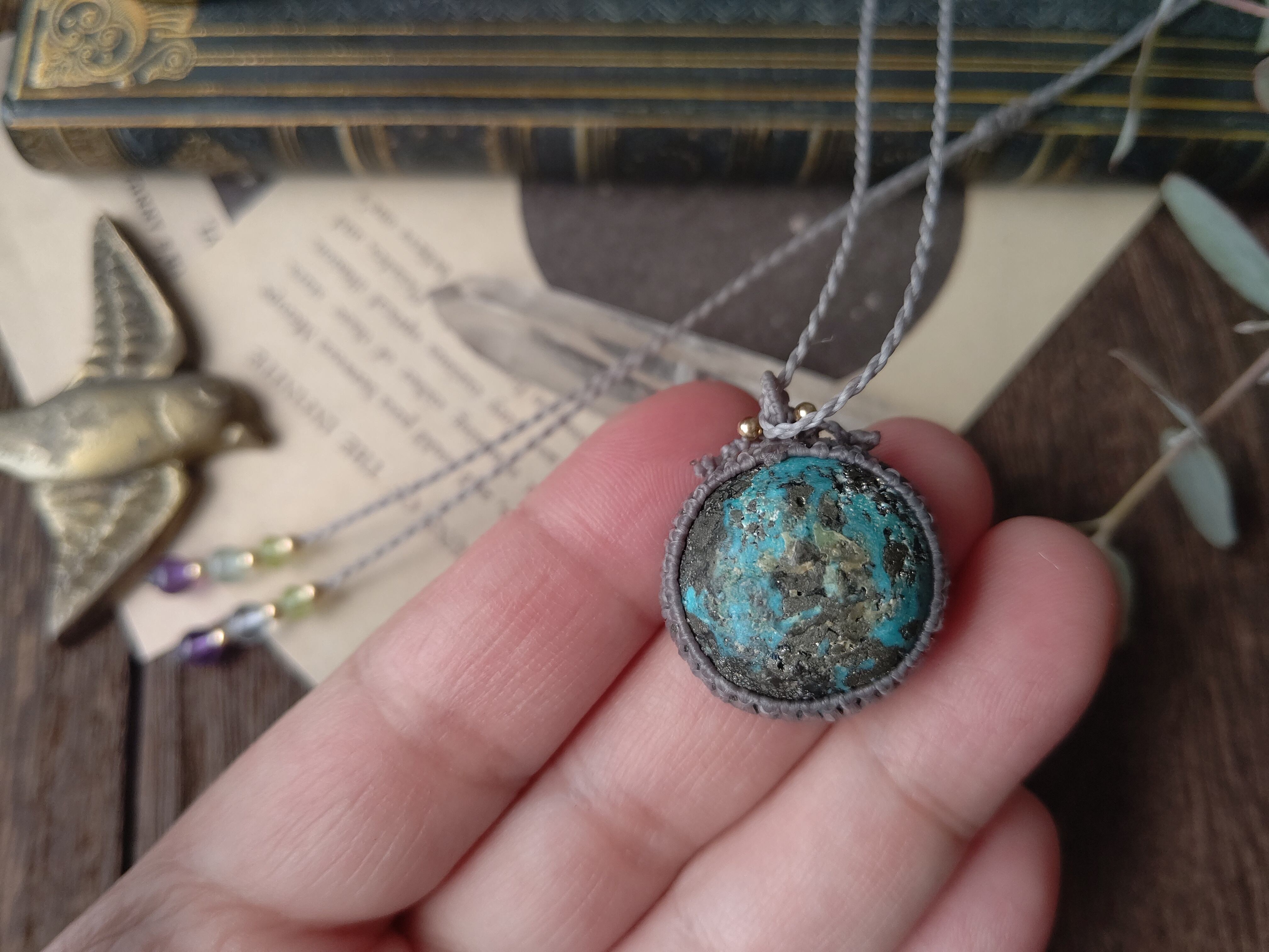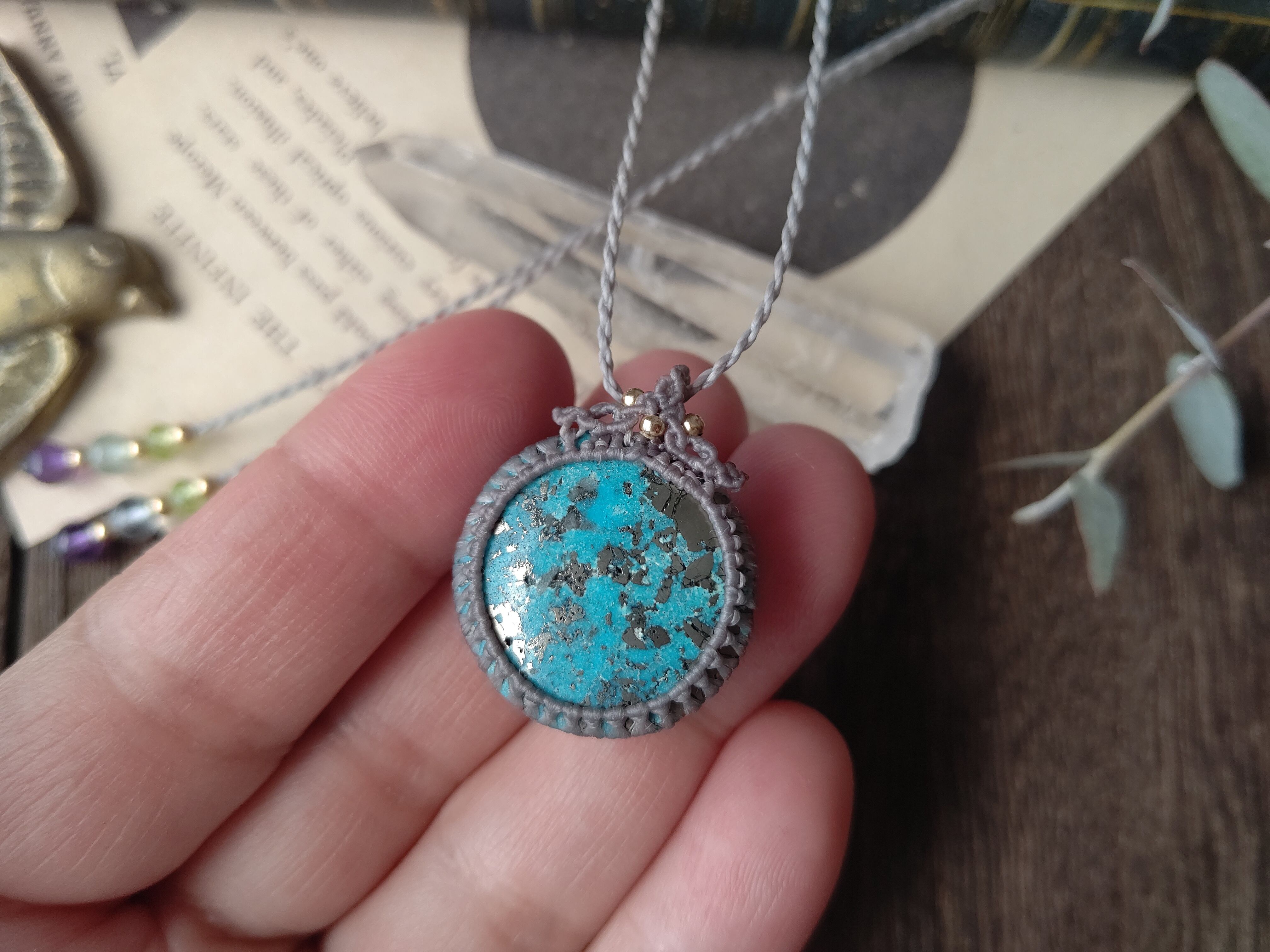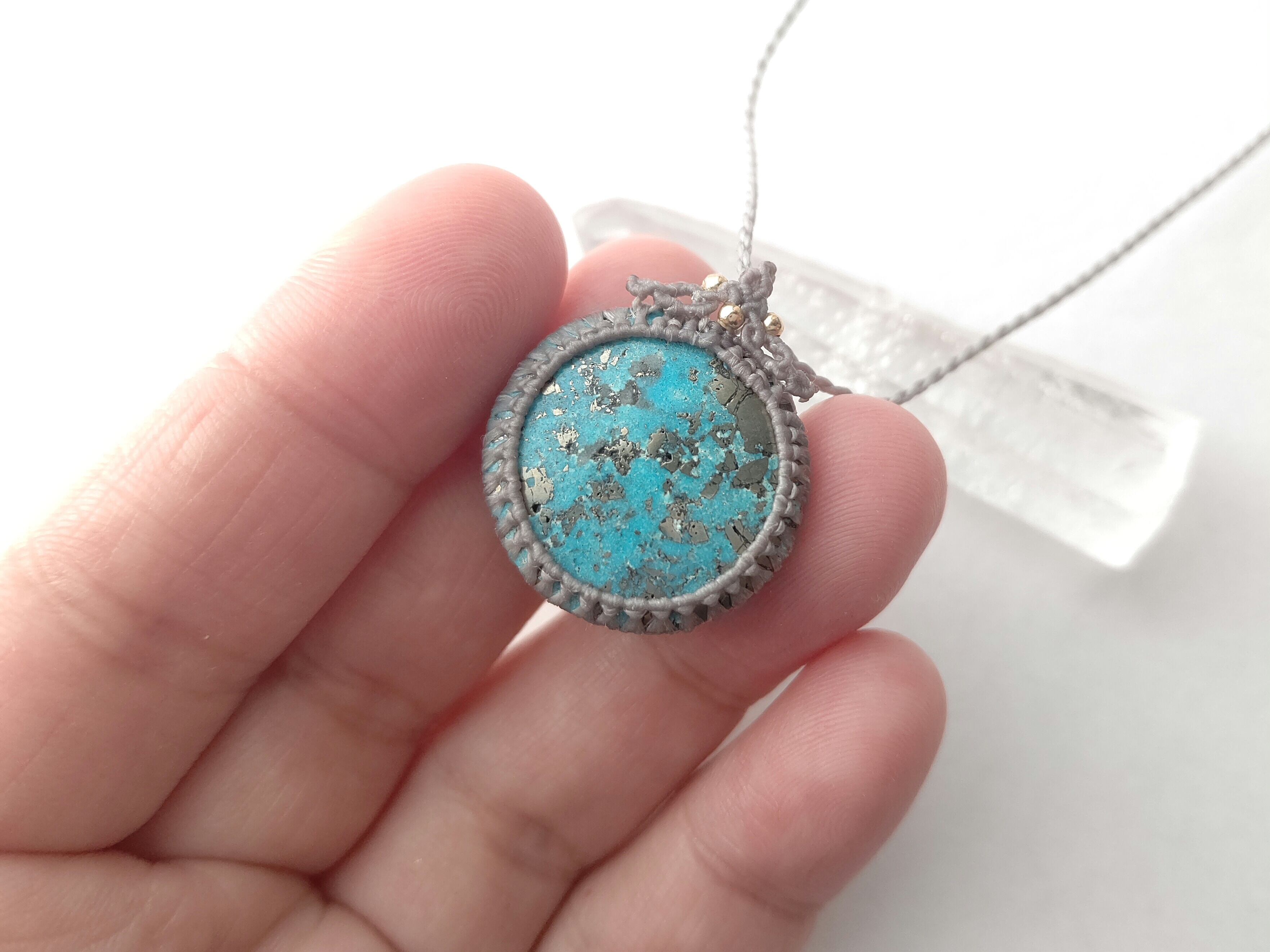 ≪送料無料≫ペルシャンターコイズのマクラメペンダント/0.25㎜仕上げ