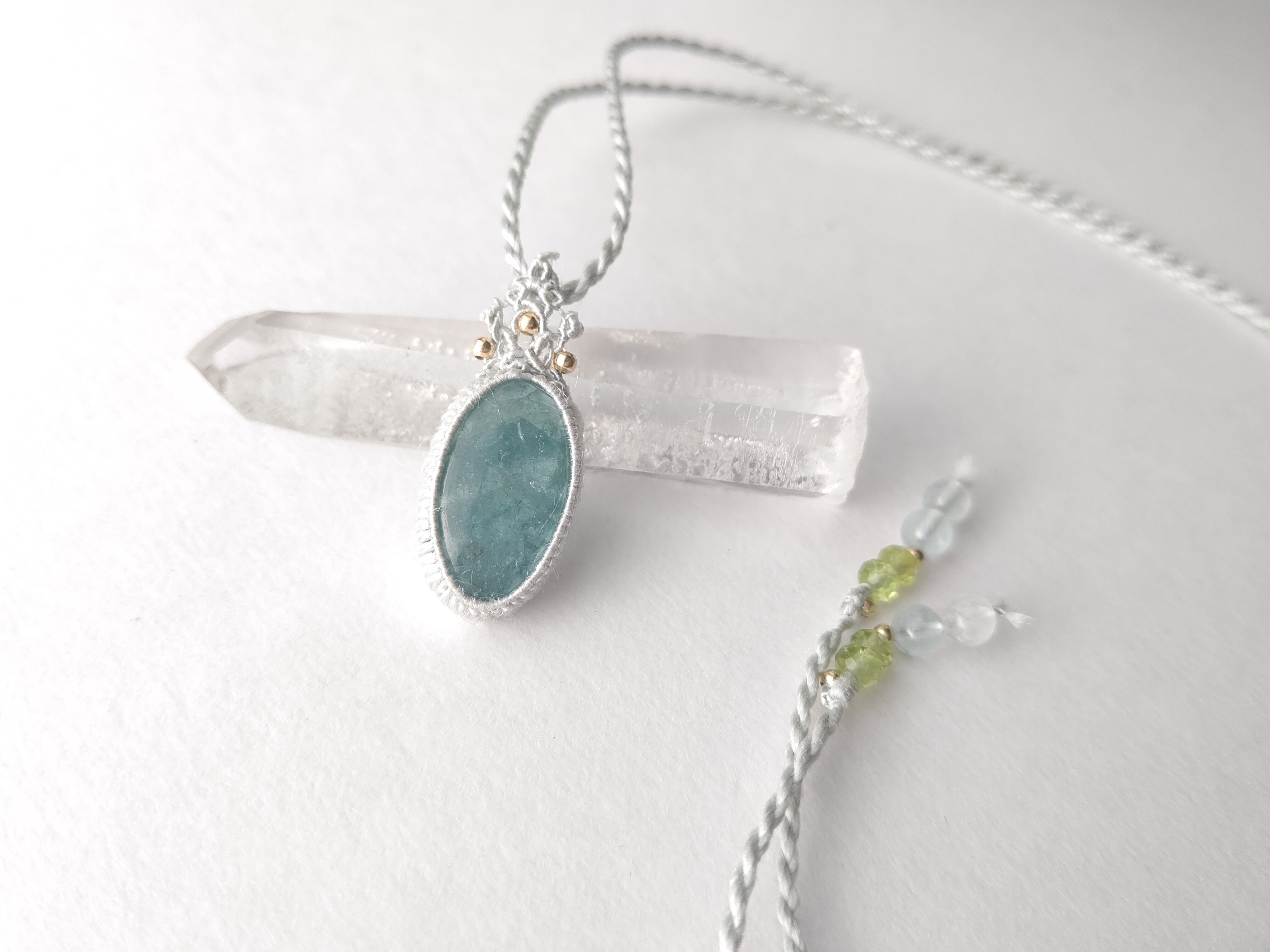 ほっそりとした楕円形の非加熱アクアマリンを使い、絹糸でシンプルで上品なペンダントに仕立てました。
