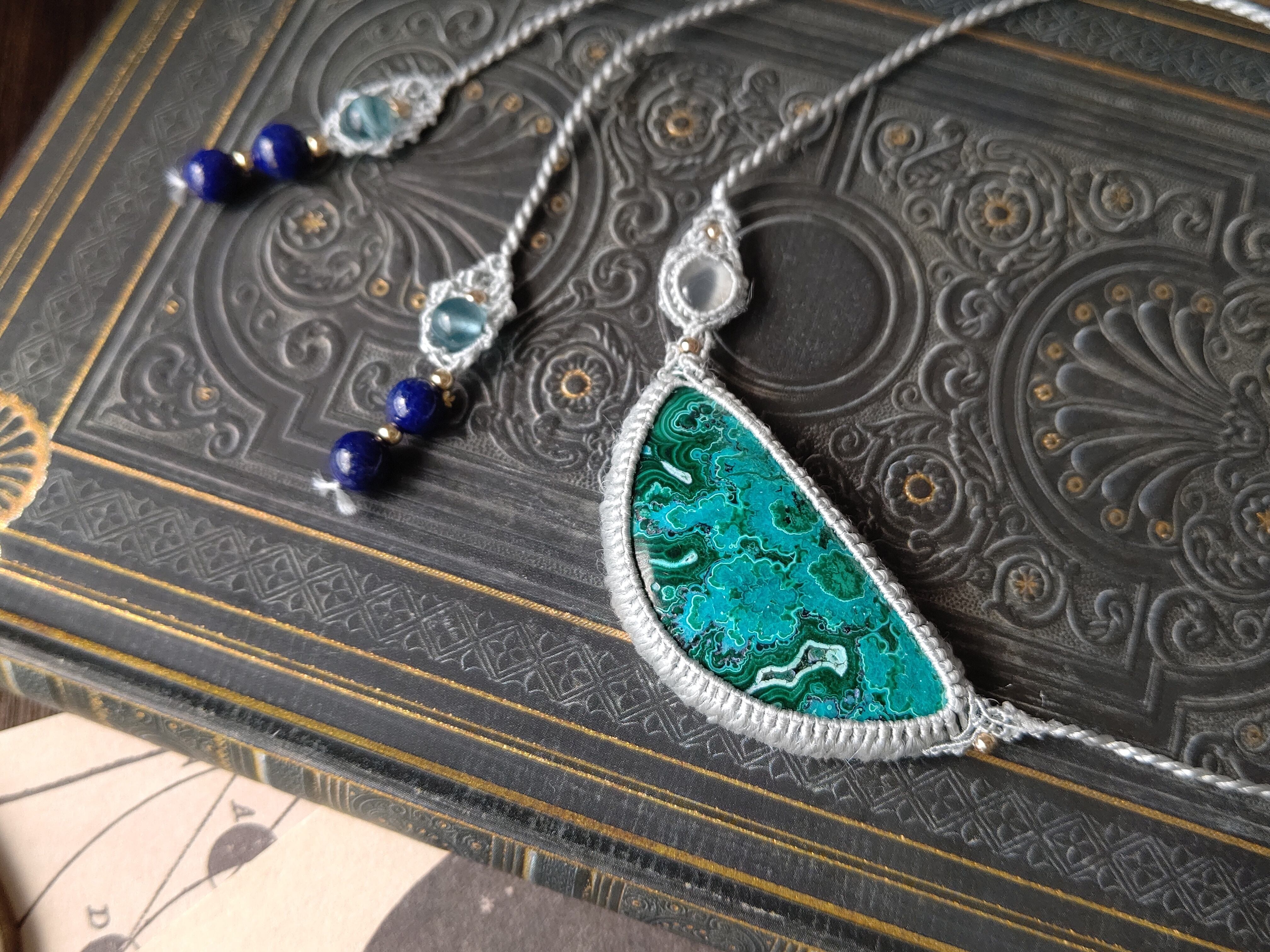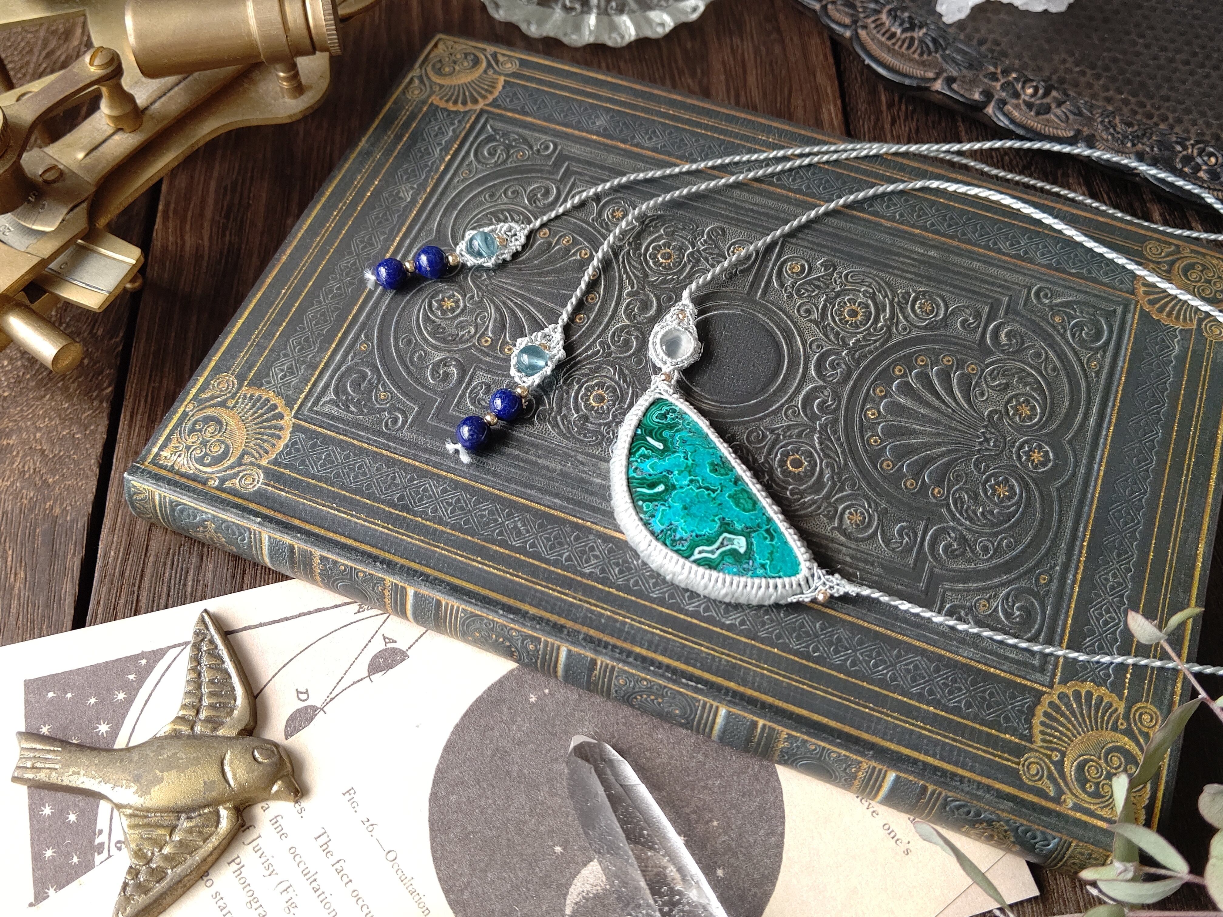 ≪silk≫ アズロマラカイト×ムーンストーンの絹糸ネックレス / 星のゆりかご ≪macrame pendant≫