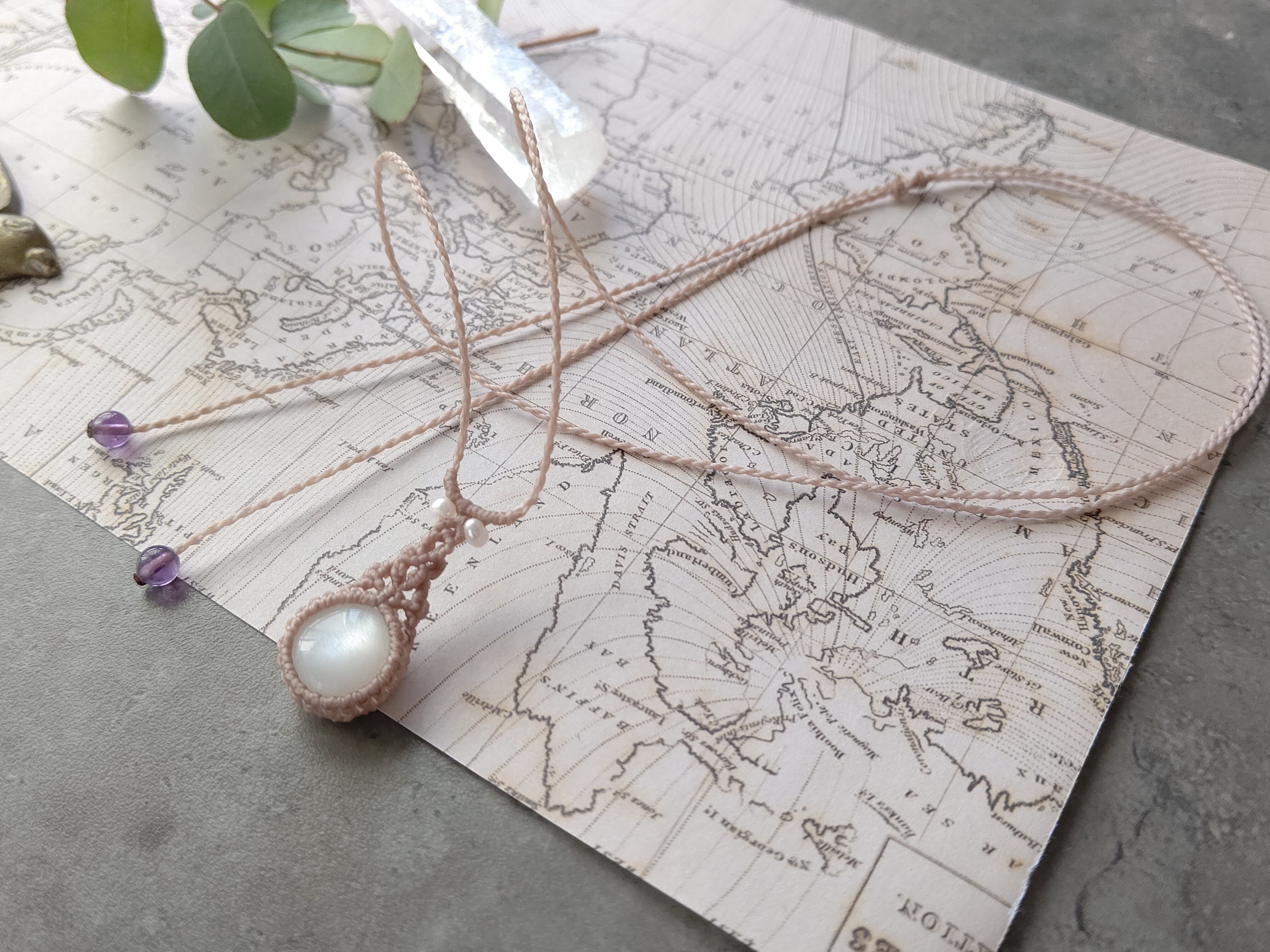 満月ムーンストーンと淡水パールのマクラメペンダント/0.5mm仕上げ