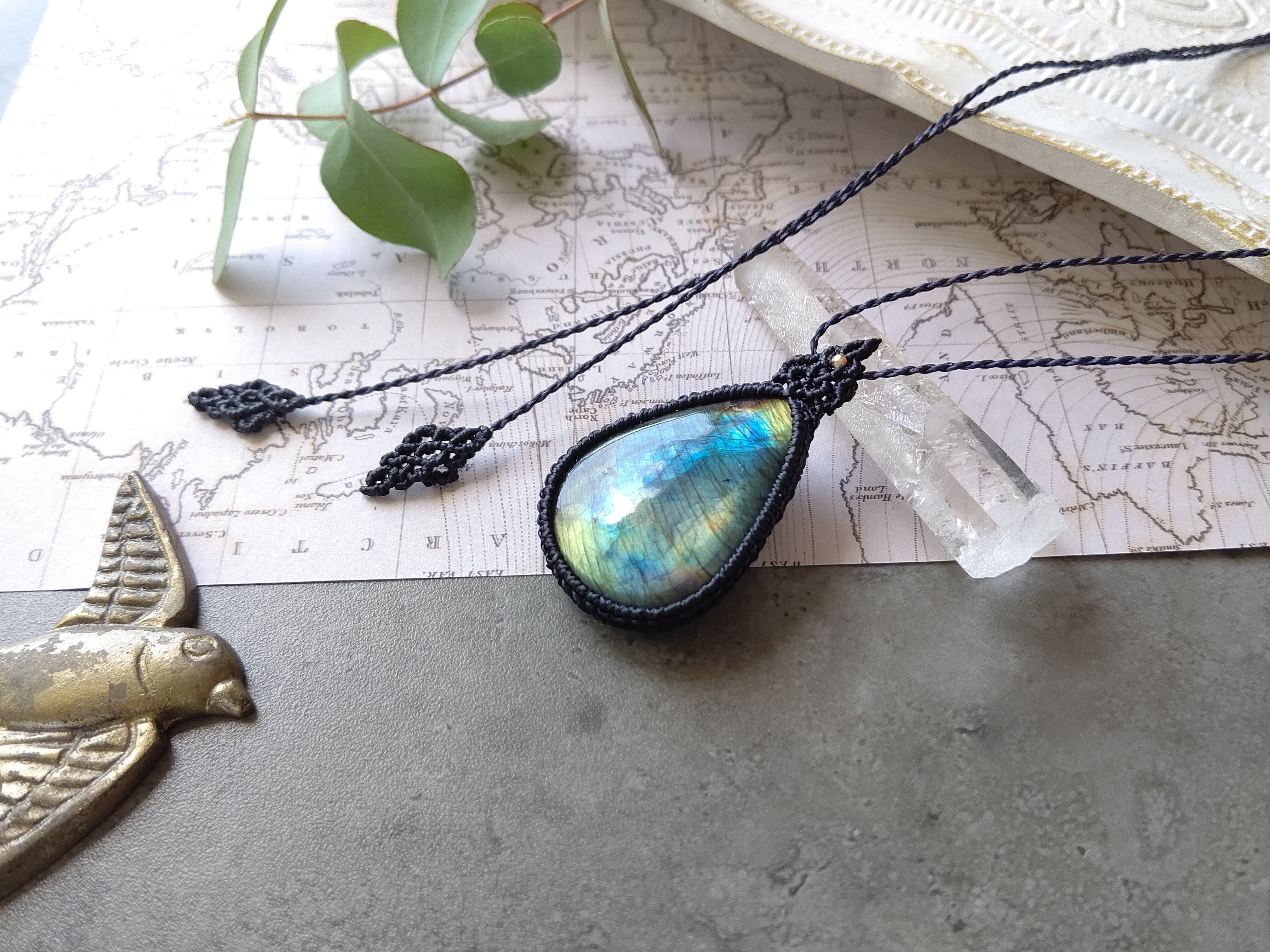 大粒スペクトロライトのマクラメペンダント/0.5mm仕上げ