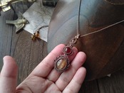 大粒のスターサンストーンにヘソナイトガーネット、雫型のシトリンを組み合わせ、大ぶりで存在感のある縦ラインのペンダントを製作いたしました。