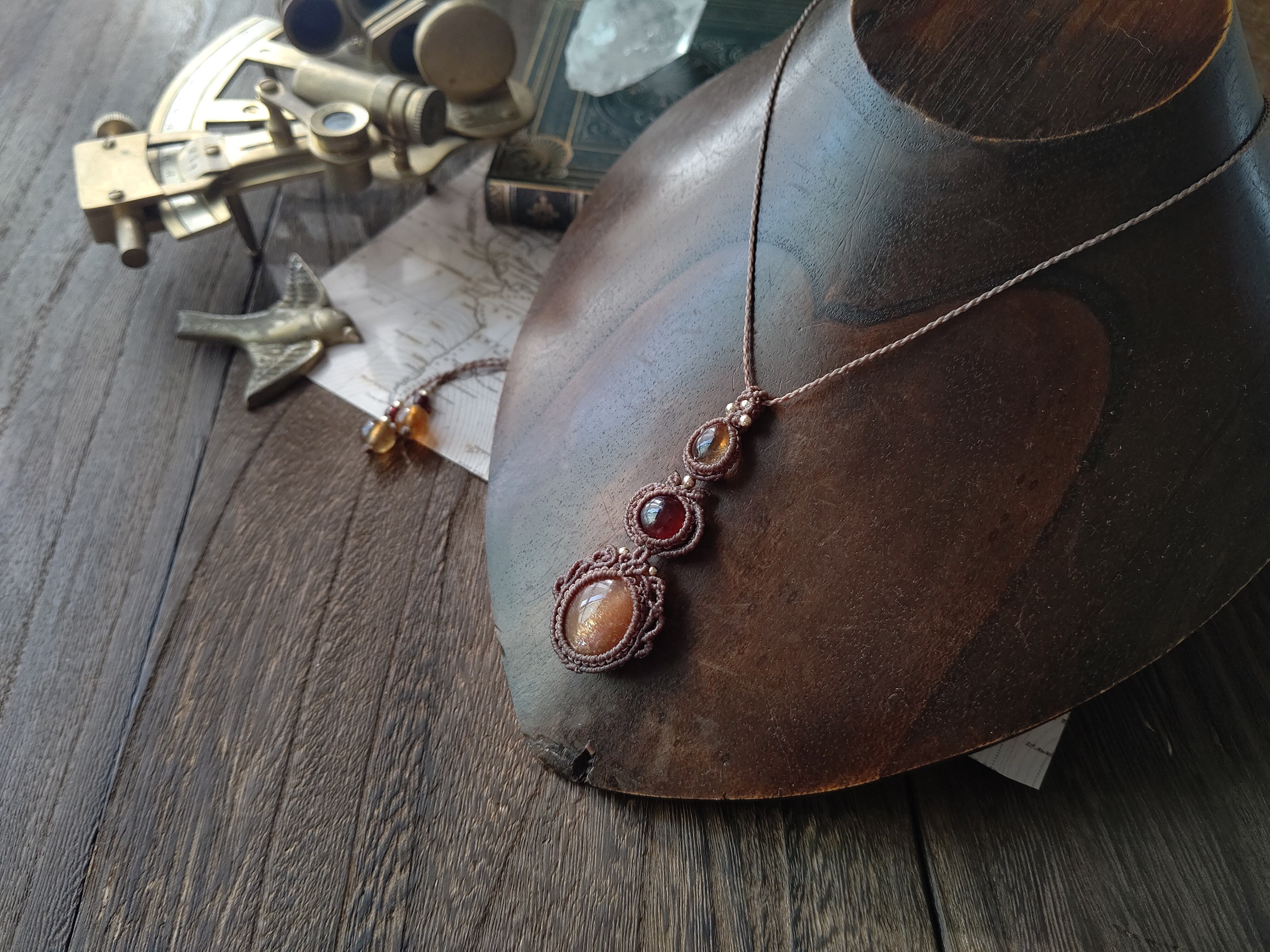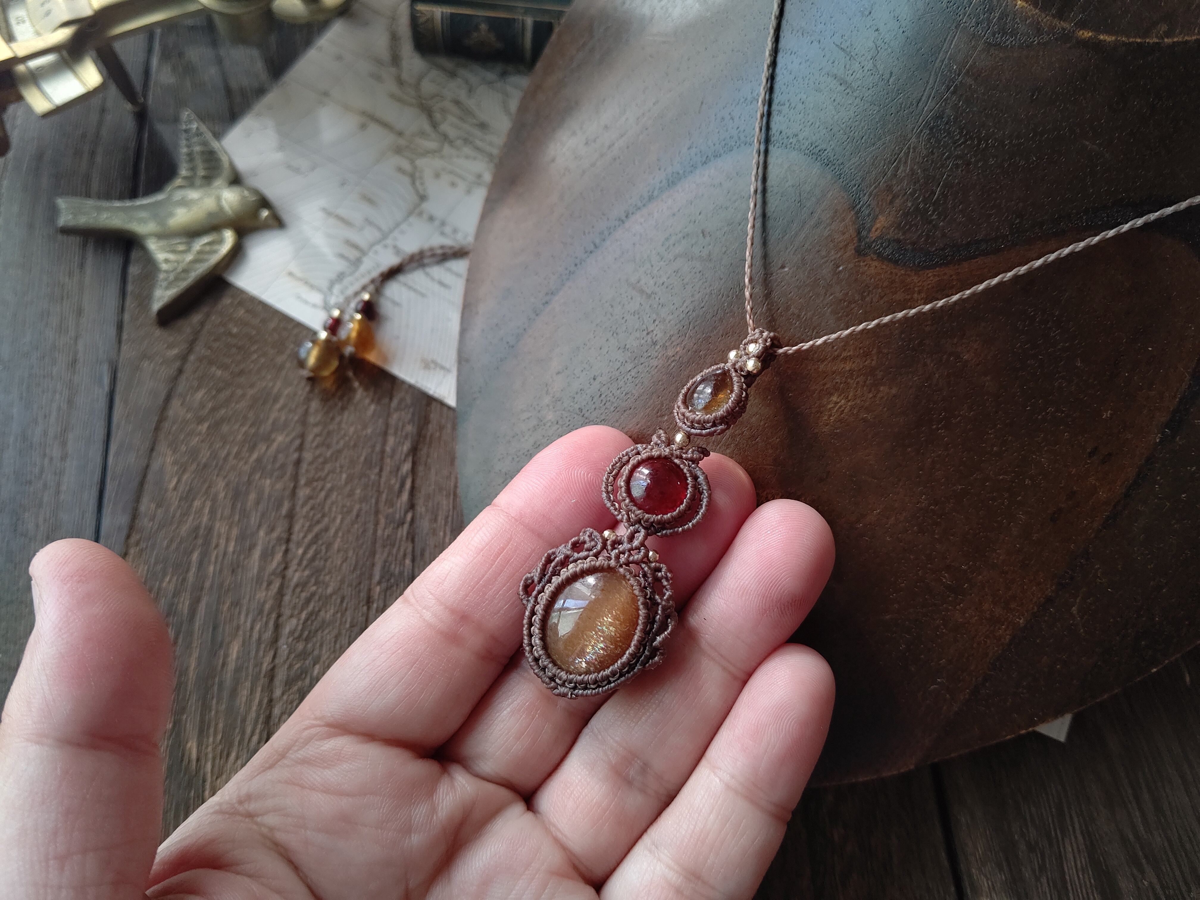 スターサンストーン×ヘソナイトガーネット×シトリンの3連マクラメペンダント/0.5mm仕上げ
