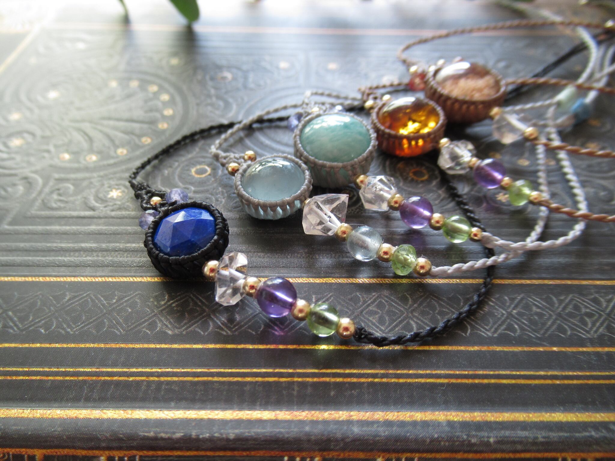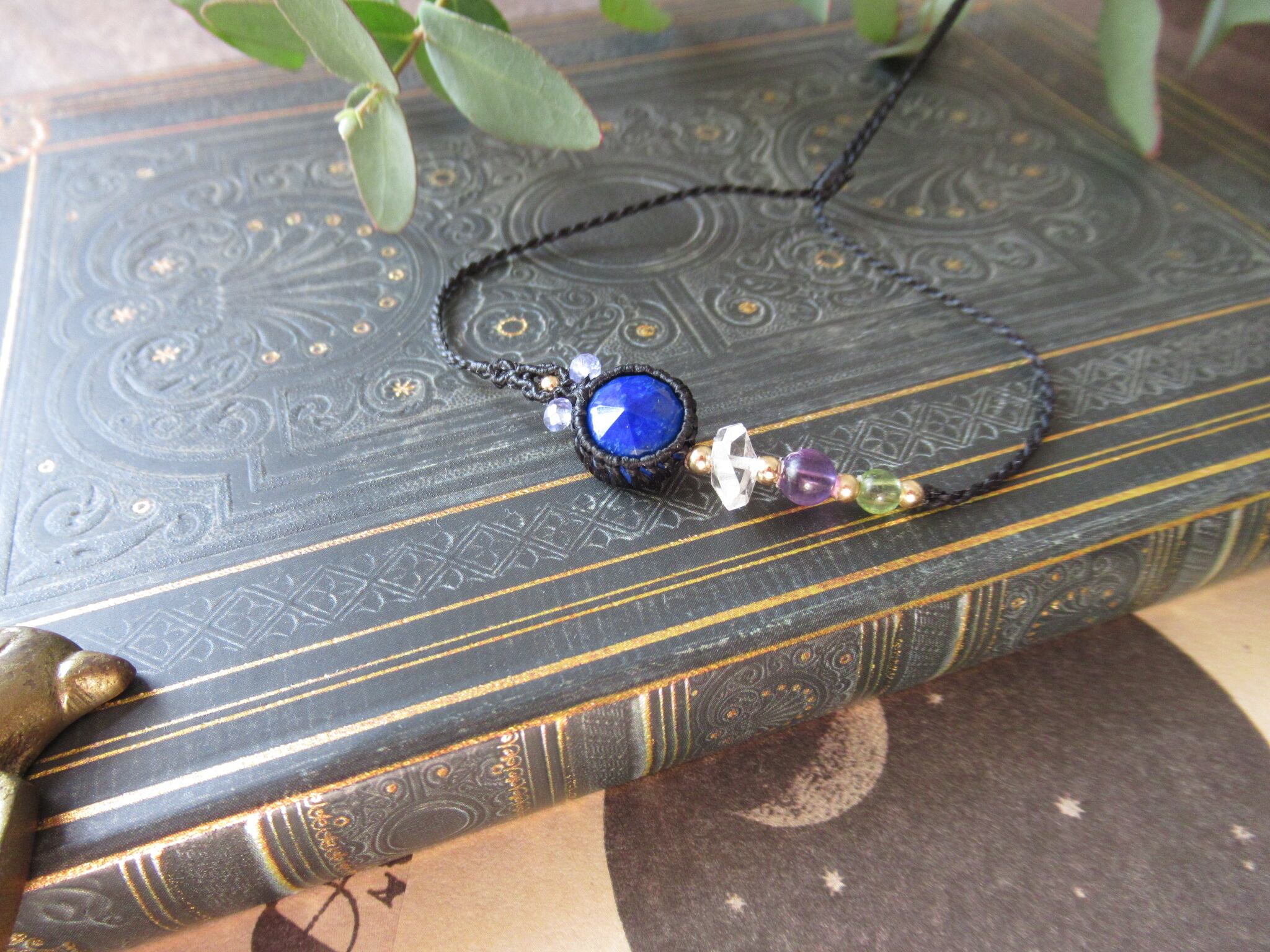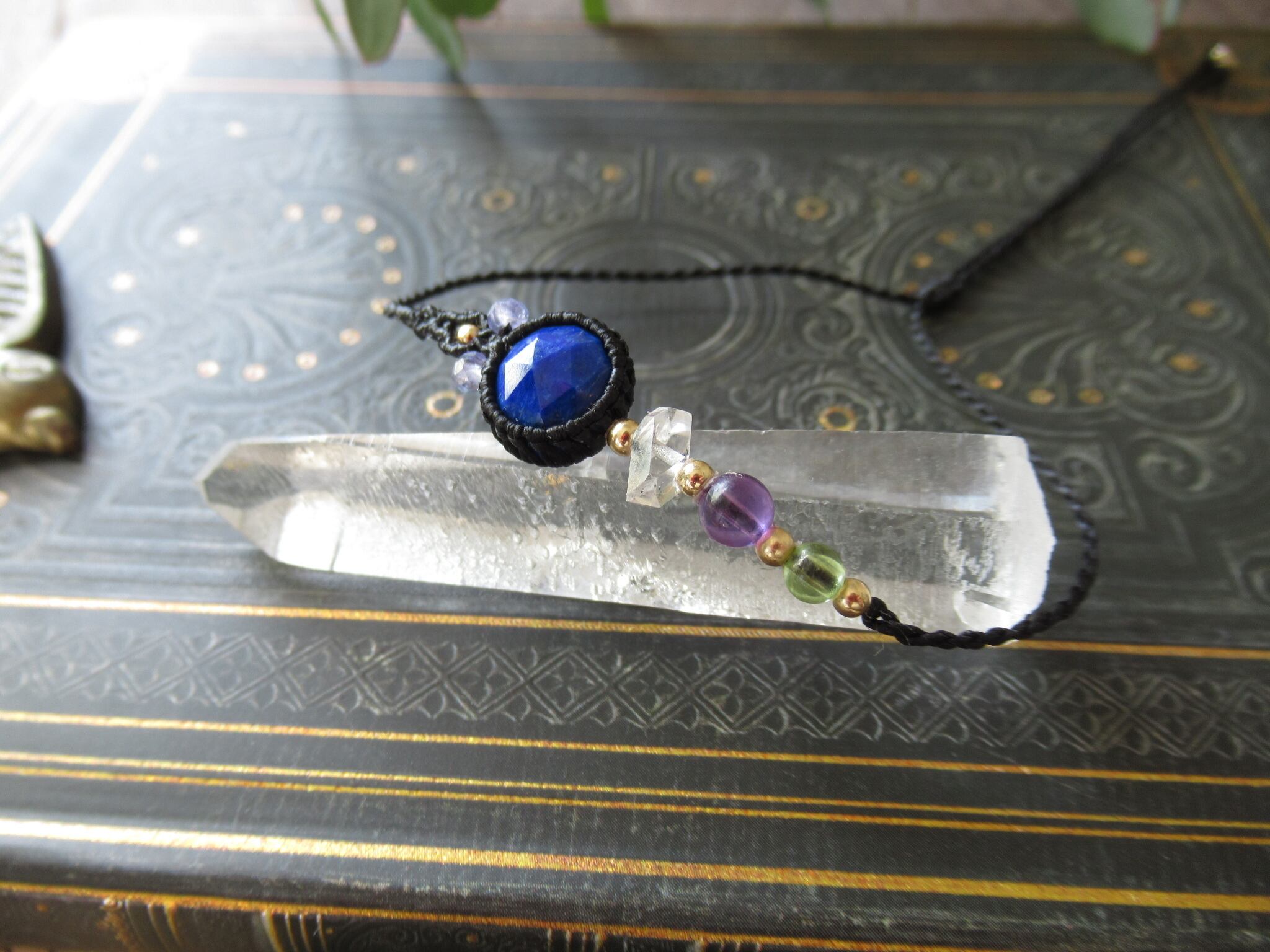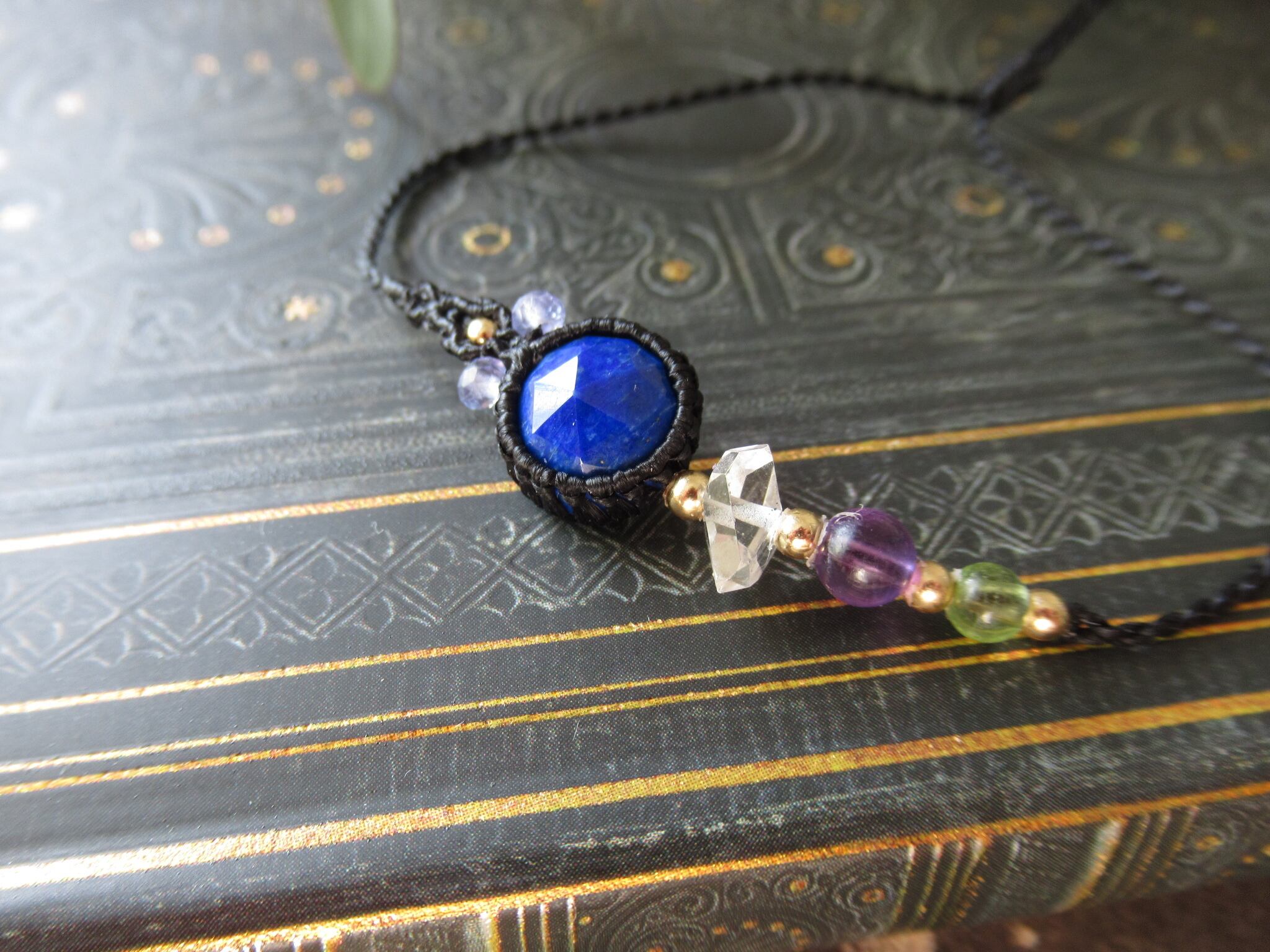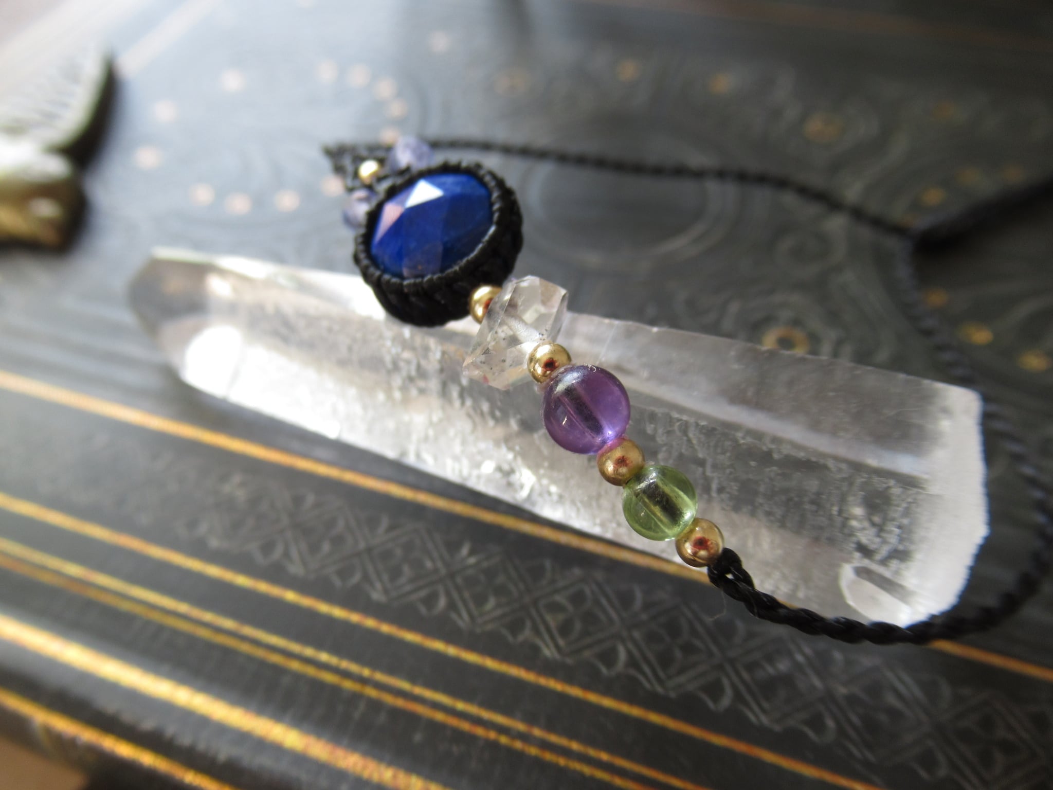 紺碧色の美しいラピスラズリを選びました。表面はローズカットされており、プラネタリウムのような風合いをお楽しみいただけます。編み込みにはタンザナイト、モザンビーク産アメジスト、ペリドットを編み込んでいます。