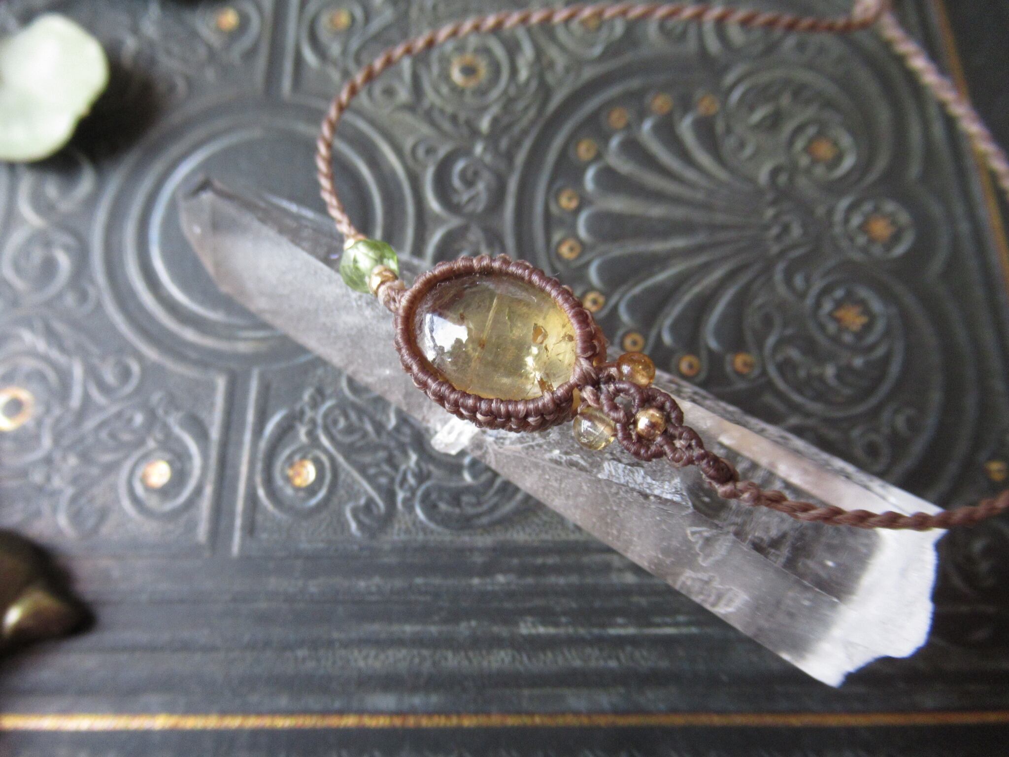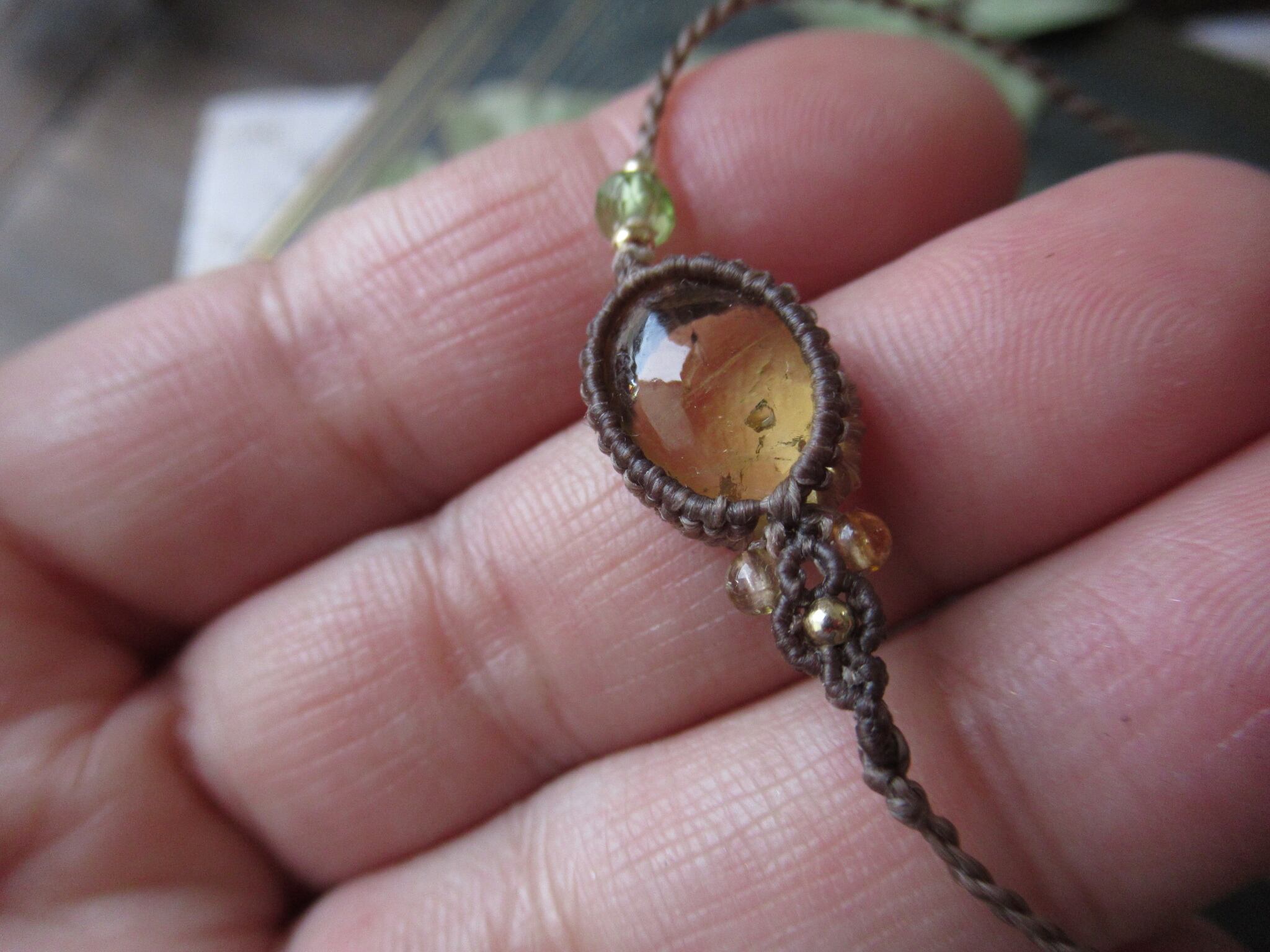 編み込みに淡いオレンジイエローの宝石質のトルマリンと宝石質のペリドットを編み込んでいます。