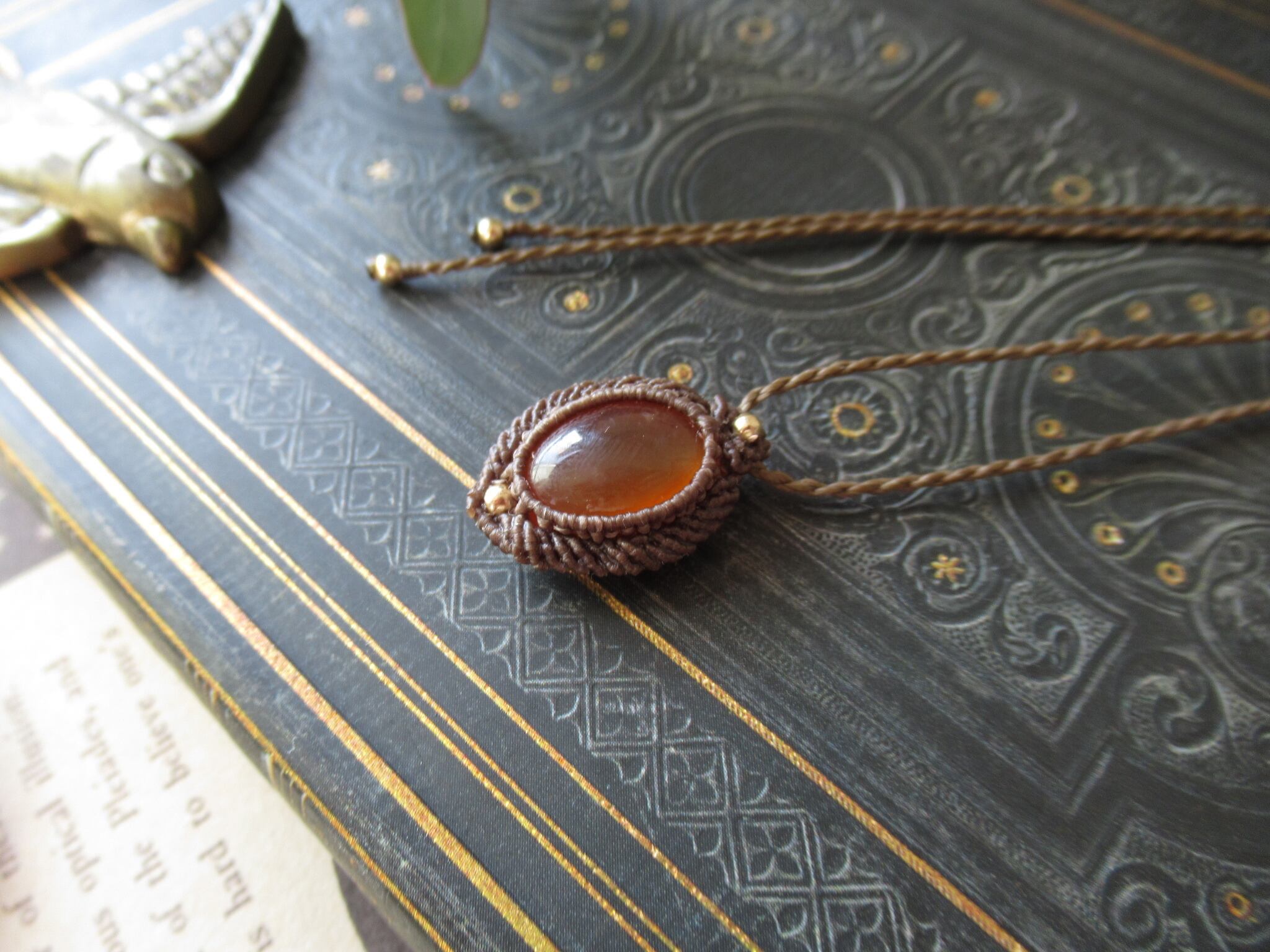 ぷるつやの明るいオレンジカラーのカーネリアンで縁取りに編み込みを施したペンダントを製作いたしました。