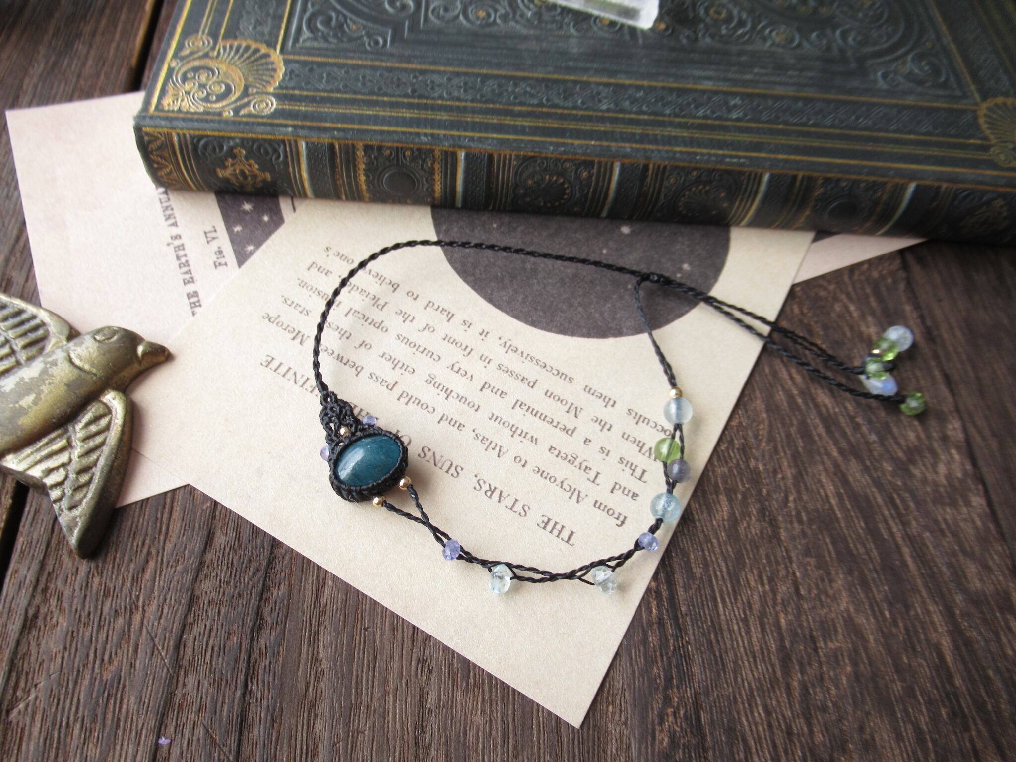 天然石ビーズはタンザナイト、アクアマリン、ペリドット、アメジストをちりばめています。結び石も左右でアシンメトリーになっているので、結び紐をブレスレットに巻き付けて絡めて装着いただくとすっきりと統一感のあるデザインもお楽しみいただけます。