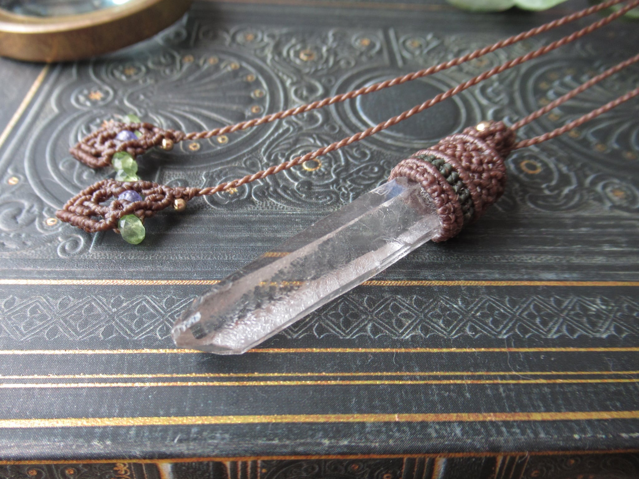 ゼッカデソウザ産クリスタルポイントの籠編み包みのマクラメペンダント