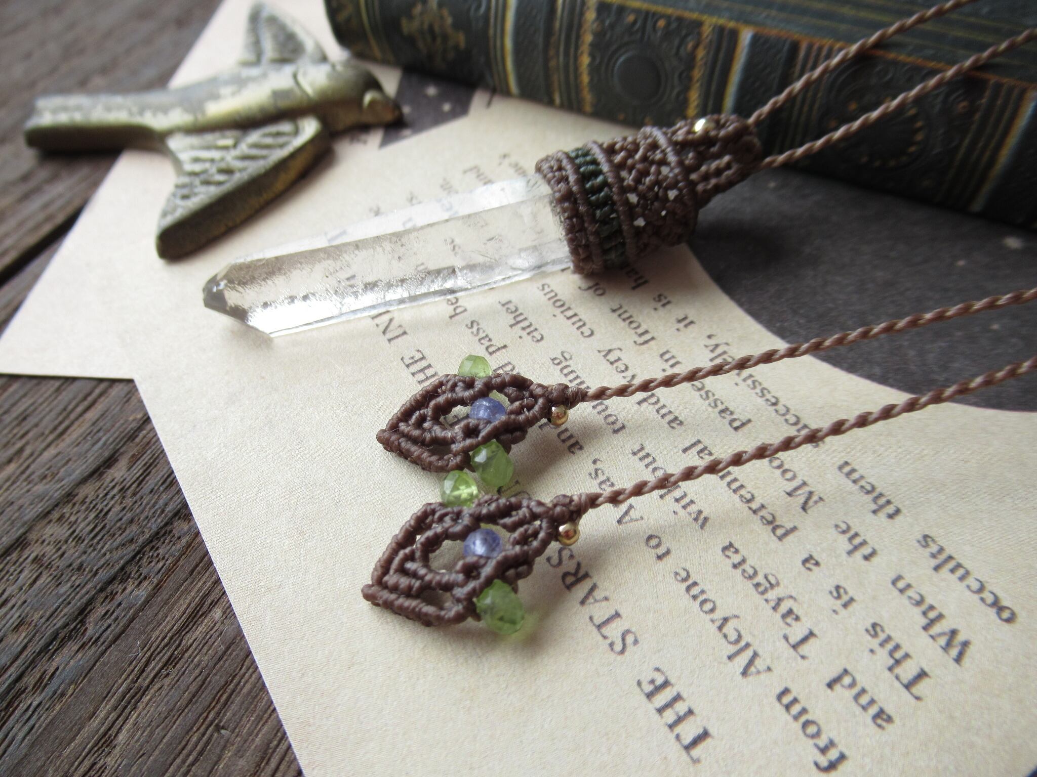 結びの背守りはタンザナイトとペリドットをあしらっております。背守りは一説には、背後からの悪霊や邪気を防ぐという意味合いもある様で、マクラメらしい装飾の一つでもあります。