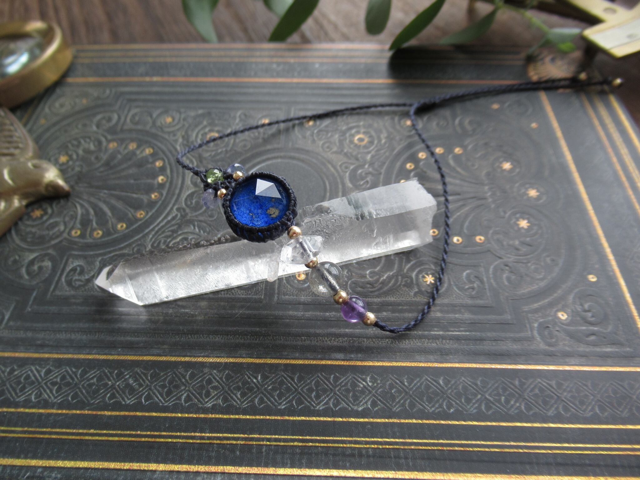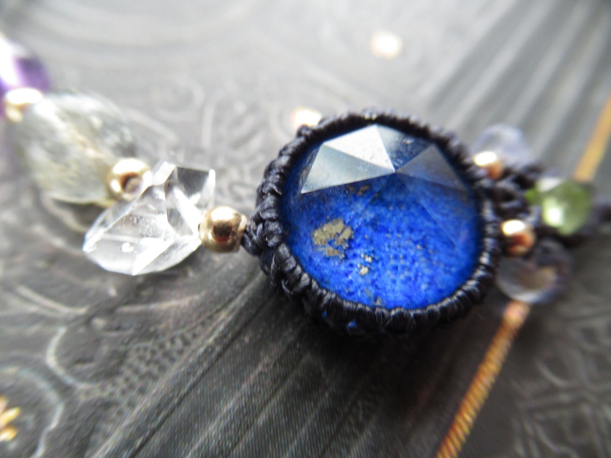 天然石ビーズにはハーキマーダイヤモンド、ラブラドライト、アメジストを編み込んでいます。反対側の編み込みにはタンザナイト、ペリドットを編み込みました。